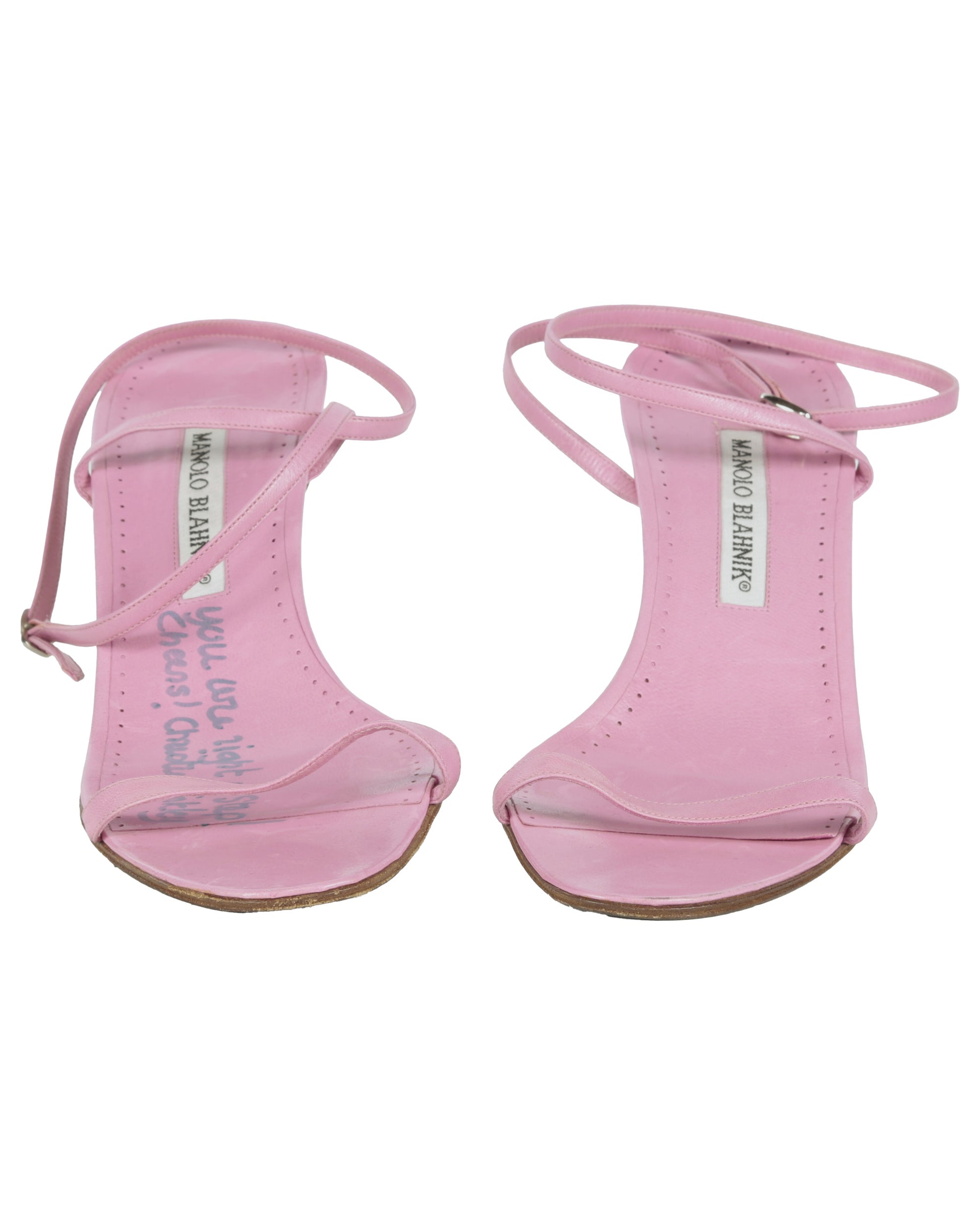 This pair of light pink Manolo Blahnik strappy pumps is associated with iconic model, actress, and entrepreneur Christie Brinkley. The shoes are crafted in a delicate light pink tone and feature Manolo Blahnik’s signature elegant strappy design. The pair includes both the proper right and proper left shoe, each in European size 39. The proper right shoe bears a handwritten inscription in blue marker on the insole reading, “You are right in step! / Cheers! Christie Brinkley,” adding a personalized and visually engaging element that enhances display and collectibility.