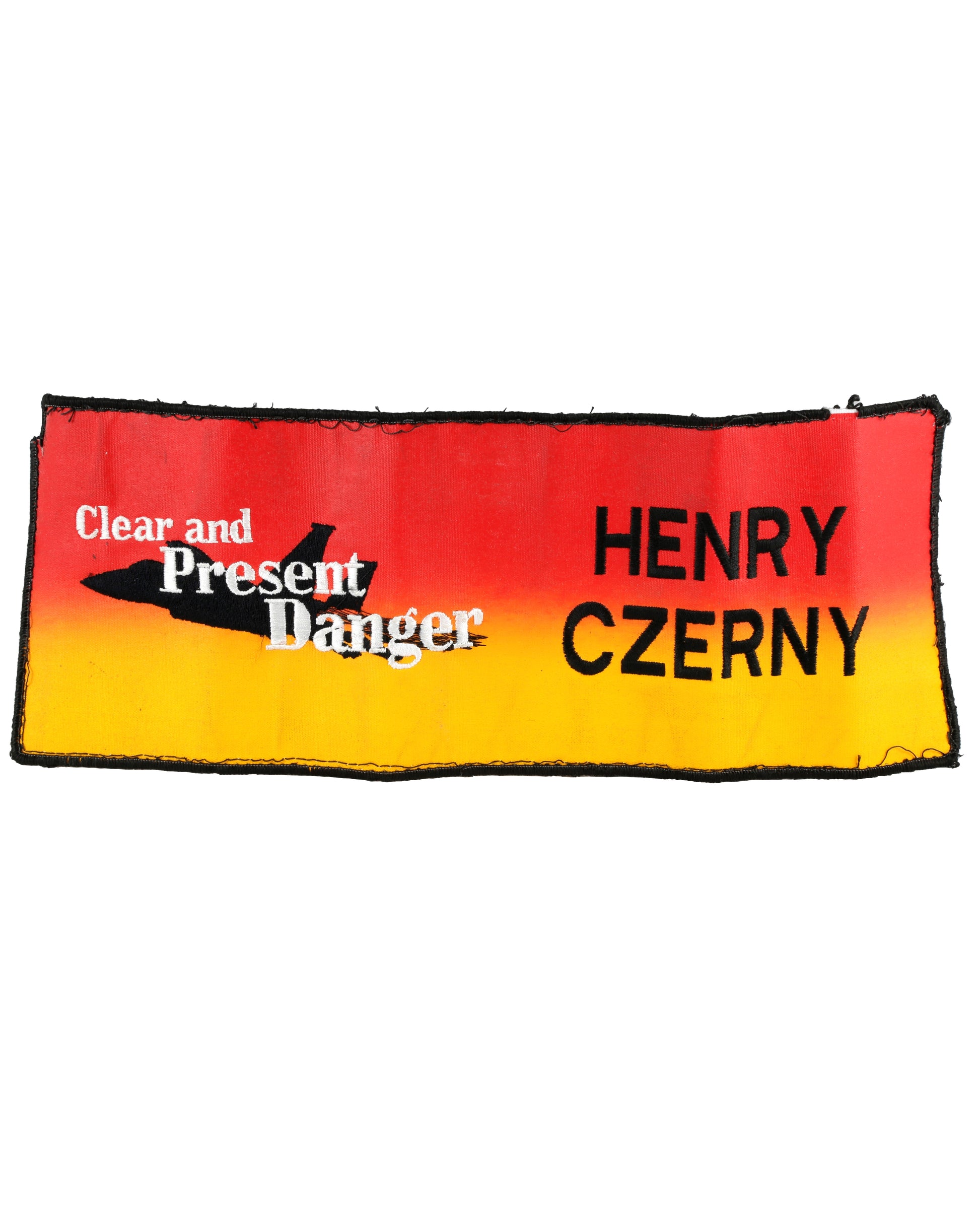 Set of 8 production-used director’s chair labels from the 1994 political action thriller Clear and Present Danger, featuring the names of principal cast members including Willem Dafoe, Donald Moffat, Anne Archer, Henry Czerny, and Dean Jones. Each canvas label is painted with a red top half and orange bottom half, embroidered with a black airplane silhouette and white lettering reading “Clear and / Present / Danger” on the proper right side. The proper left side of each label is embroidered with the cast or crew member’s name in black lettering.