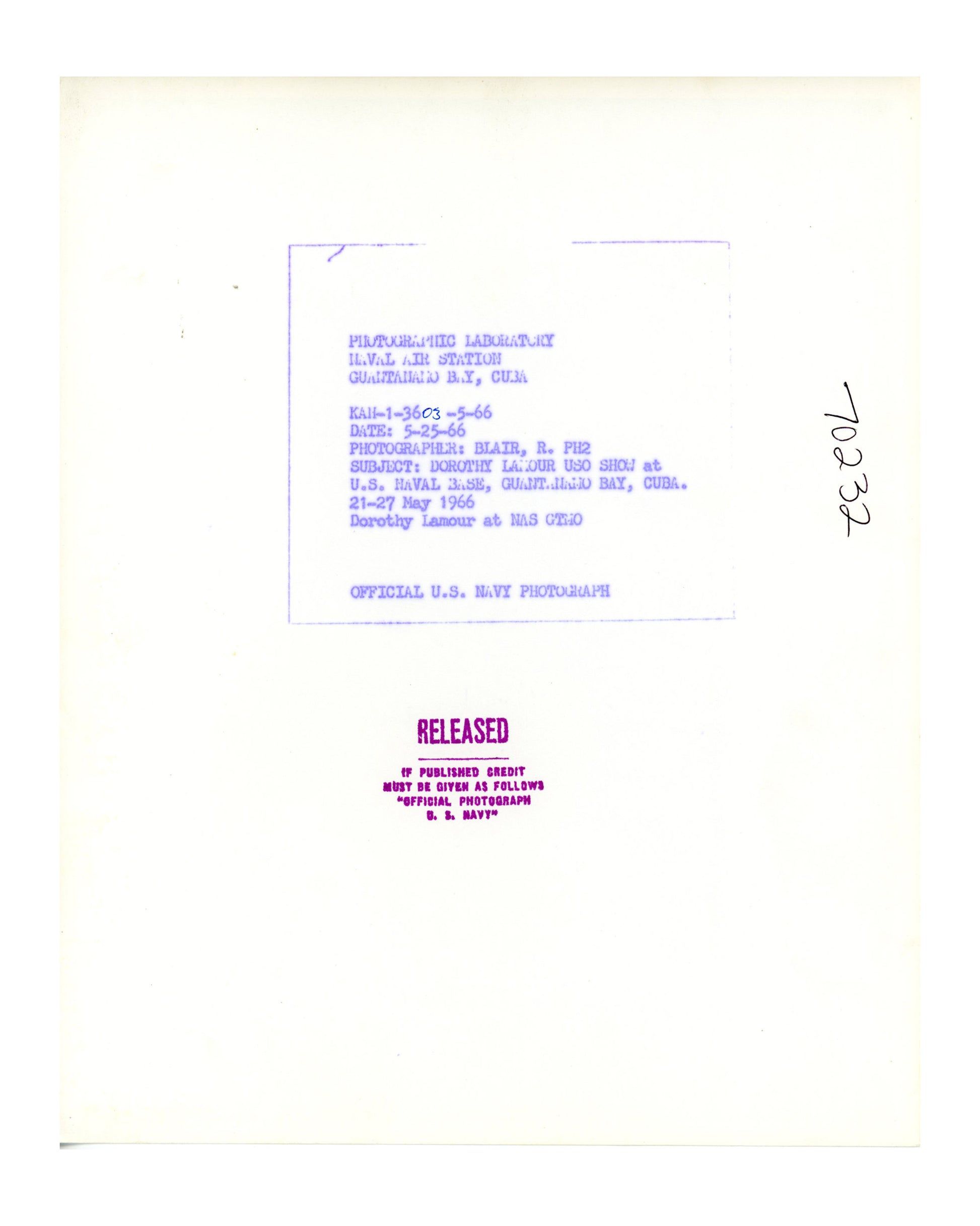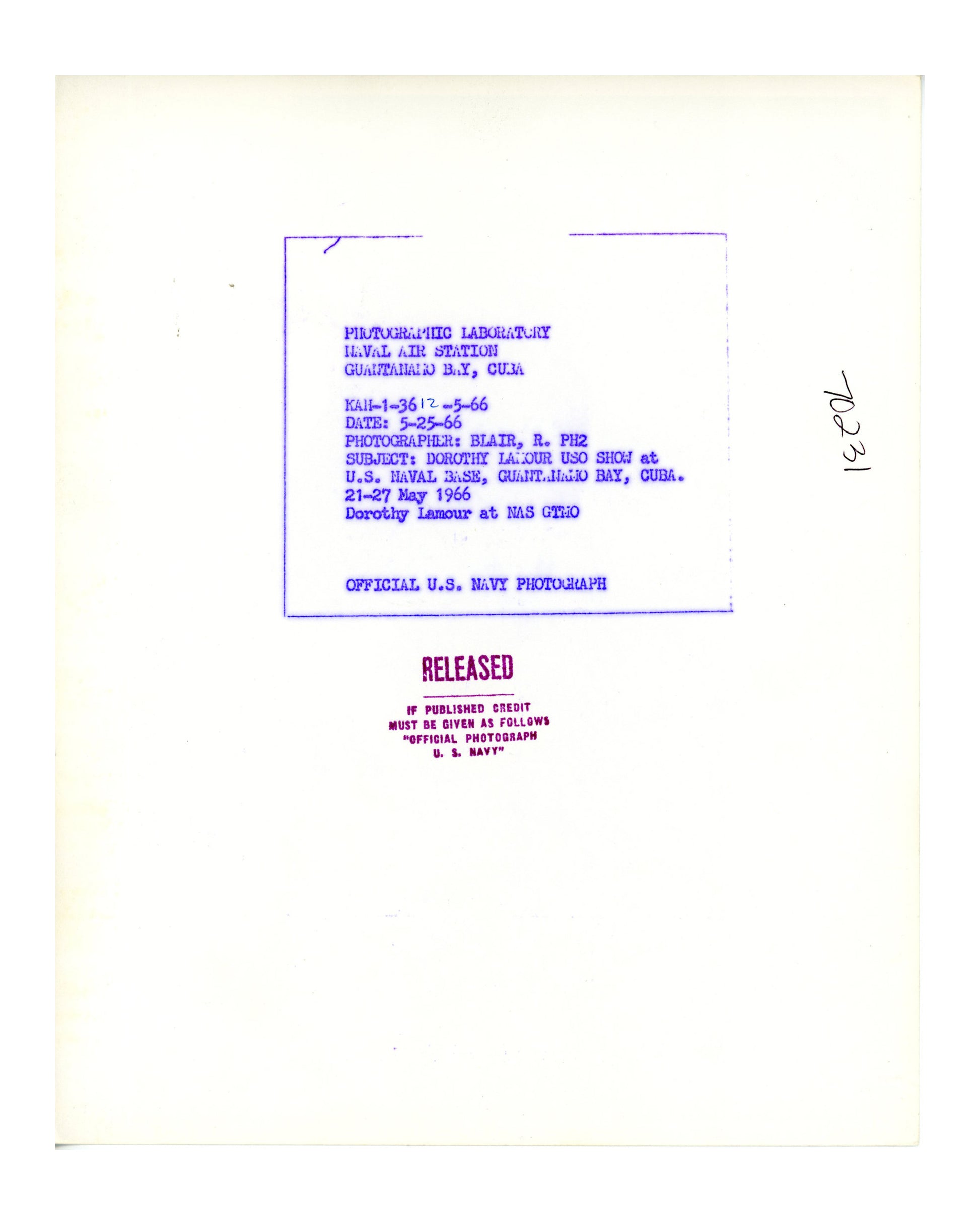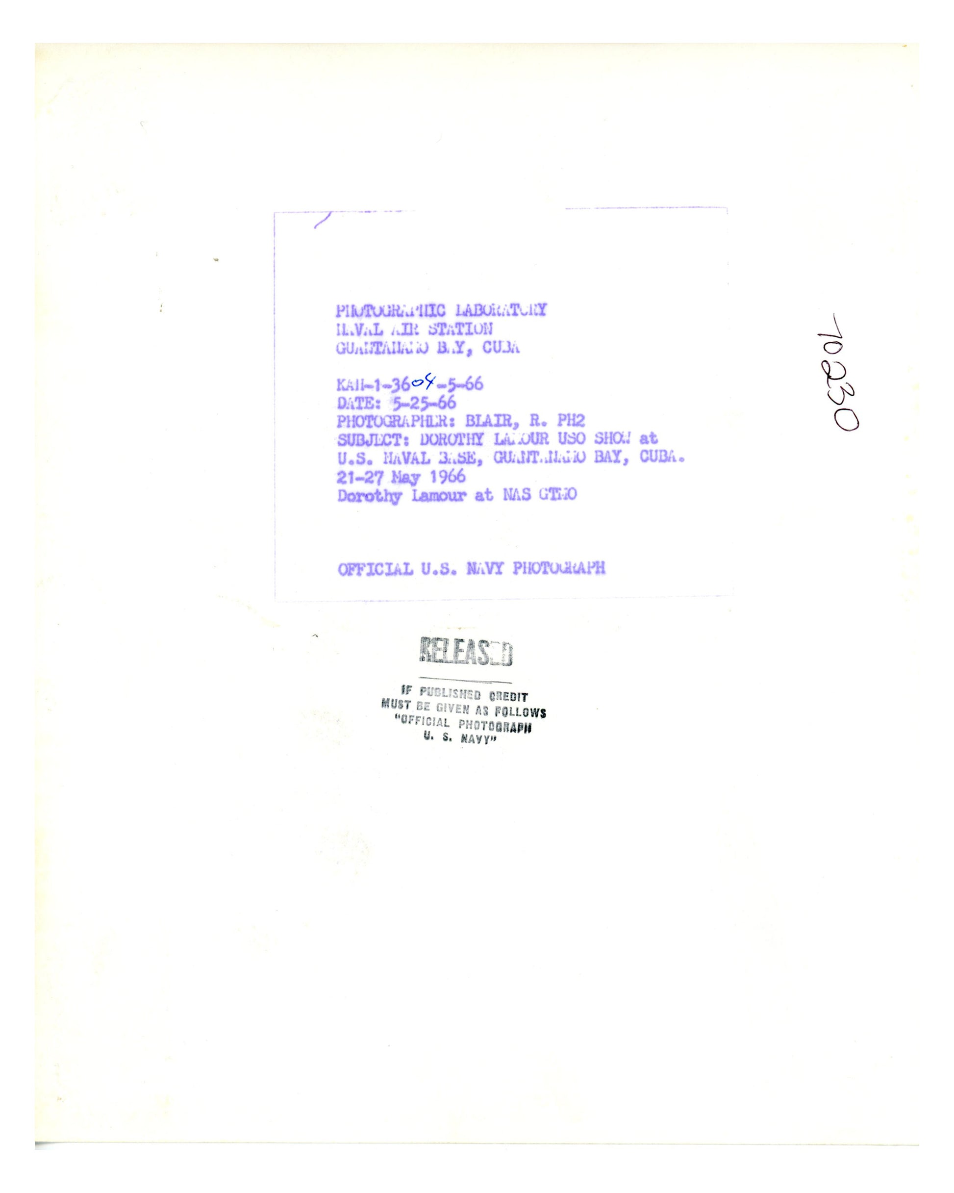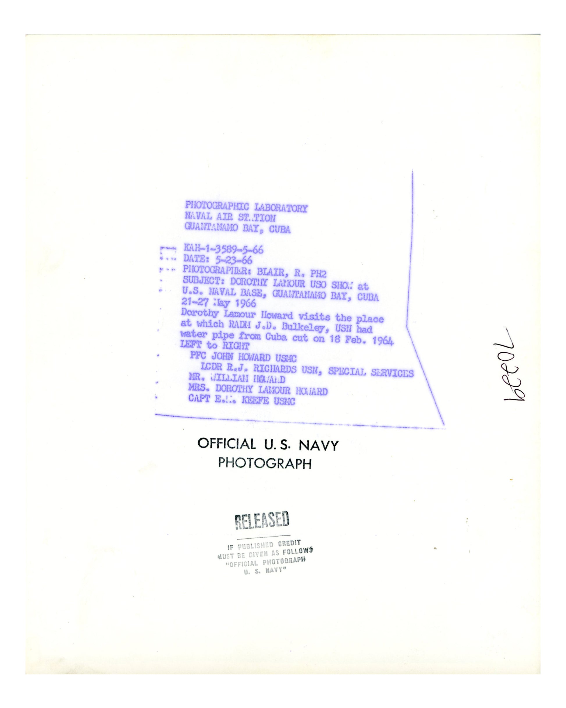 Collection of seven (7) photographs from Dorothy Lamour's visit to the U.S. Naval Base in Guantanamo Bay, Cuba, in May 1966, where she performed at a USO Show. Photographs are official U.S. Navy photographs with official information stamps on reverse.
