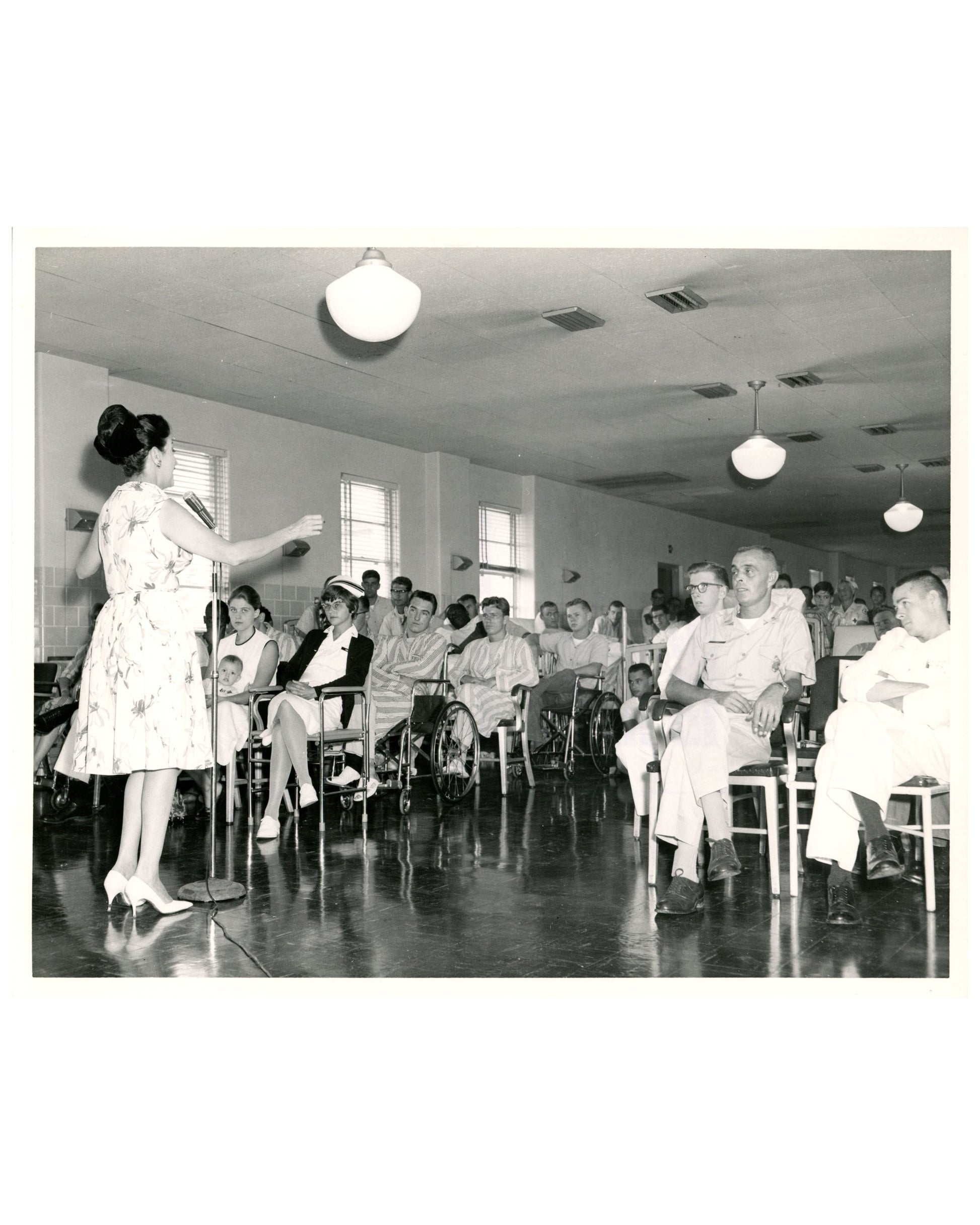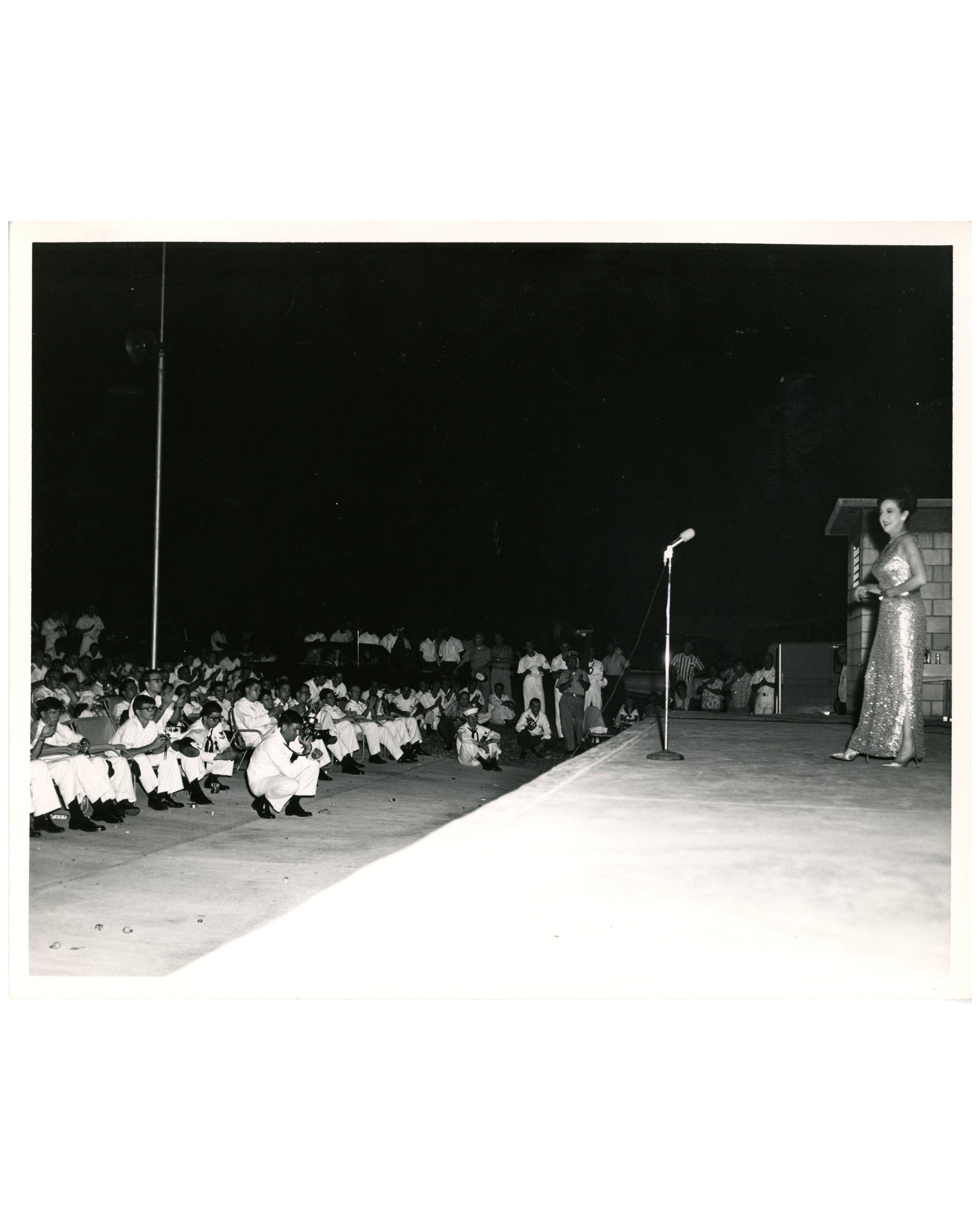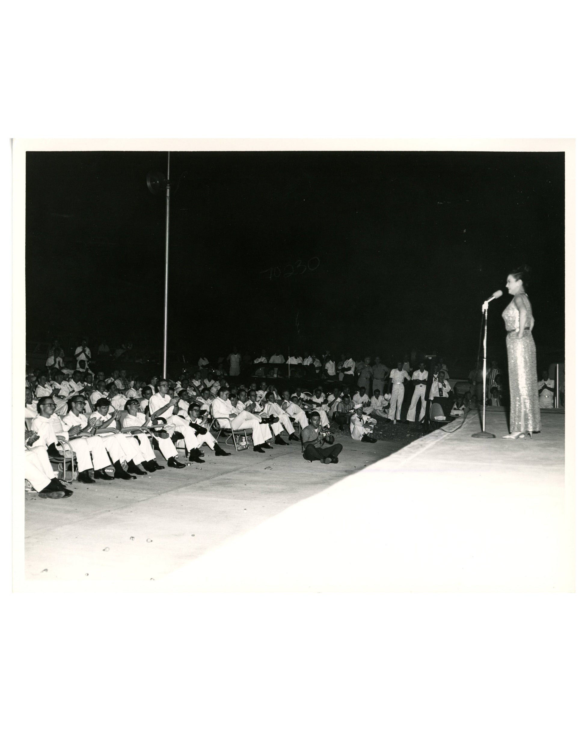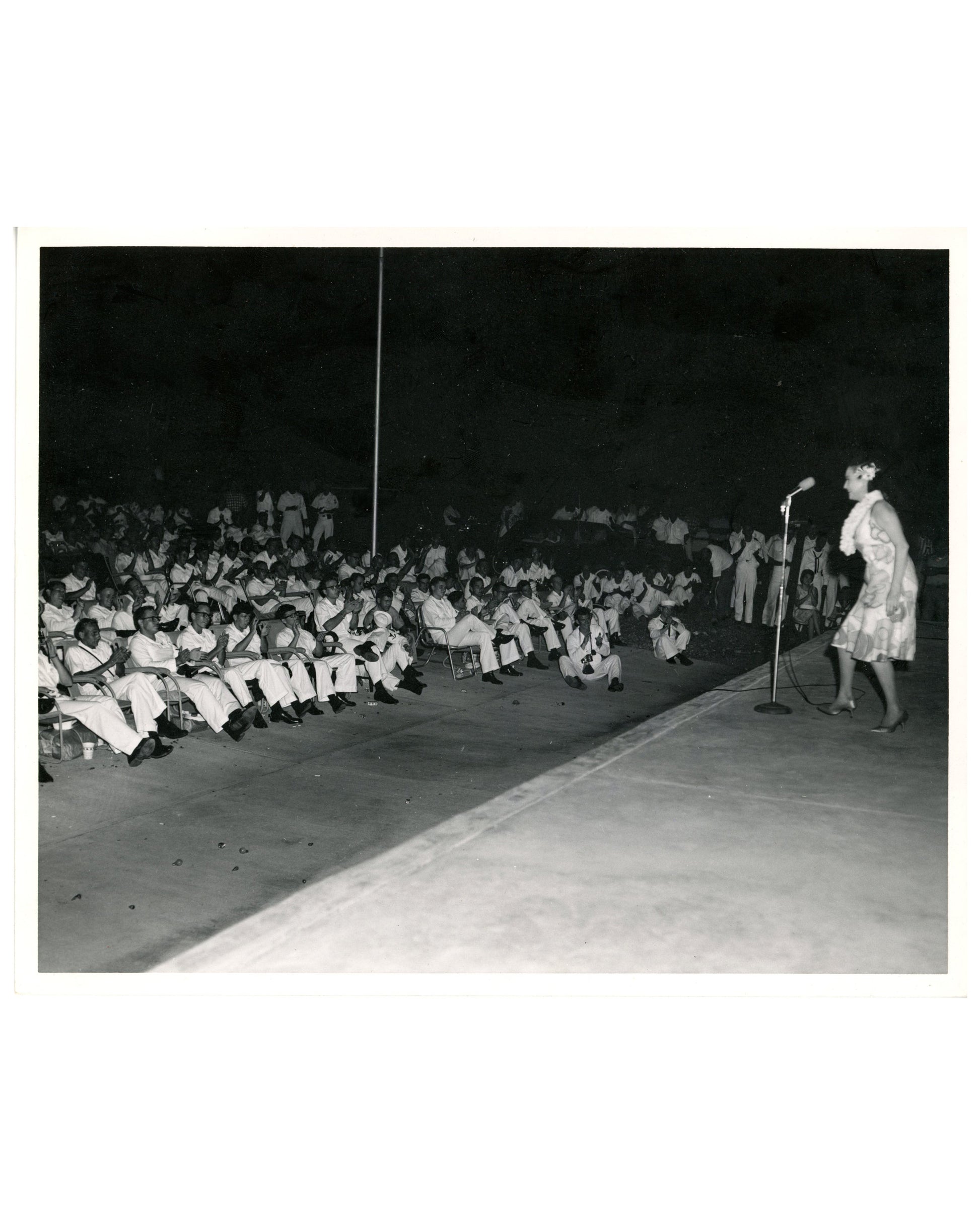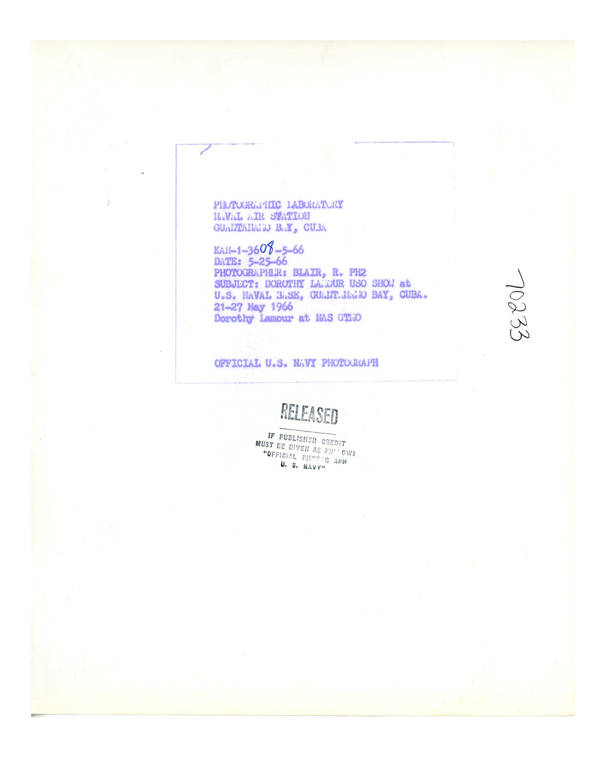 Collection of seven (7) photographs from Dorothy Lamour's visit to the U.S. Naval Base in Guantanamo Bay, Cuba, in May 1966, where she performed at a USO Show. Photographs are official U.S. Navy photographs with official information stamps on reverse.