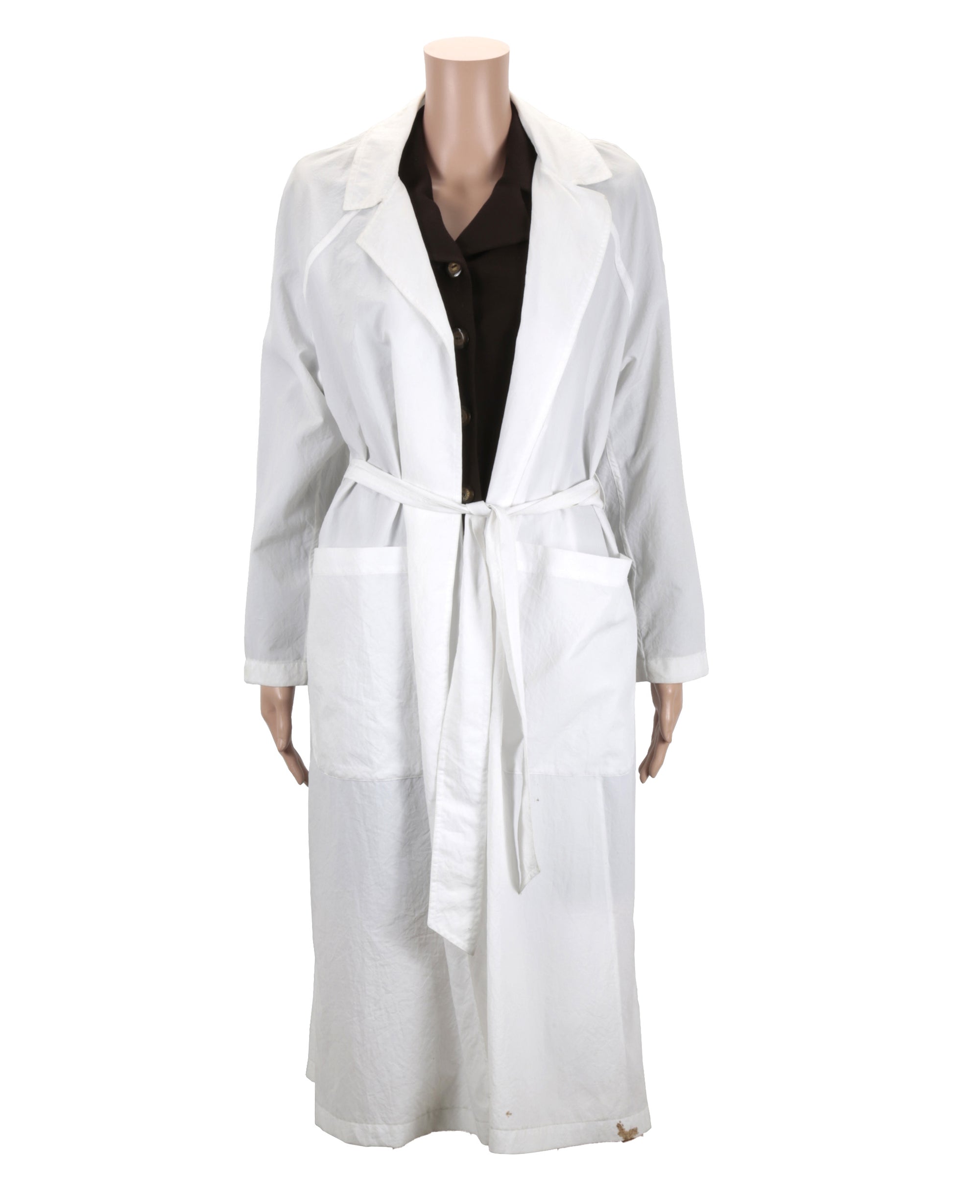 This authentic costume was worn by Holly Hunter in her role as Helen Remington in the 1996 film Crash. The ensemble includes a lightweight white Izzy Camilleri coat with notched lapels and two side pockets, featuring a belt that ties at the waist for a tailored silhouette. Handwriting on the interior label reads “HELEN,” confirming its on-screen use.