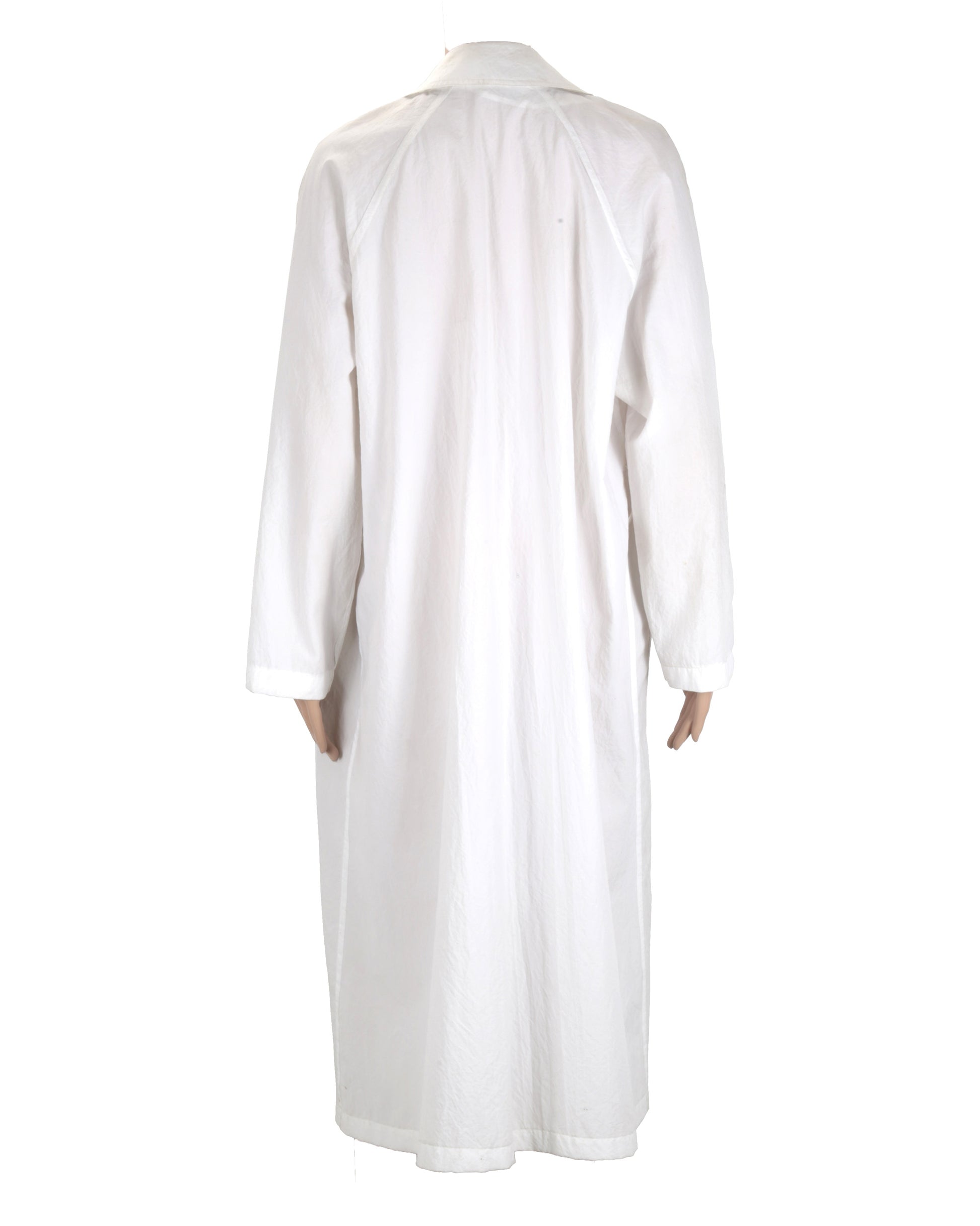 The coat shows minor creasing throughout, with some soiling on the lower portion and slight grime buildup overall. The jacket and skirt show no obvious signs of damage.