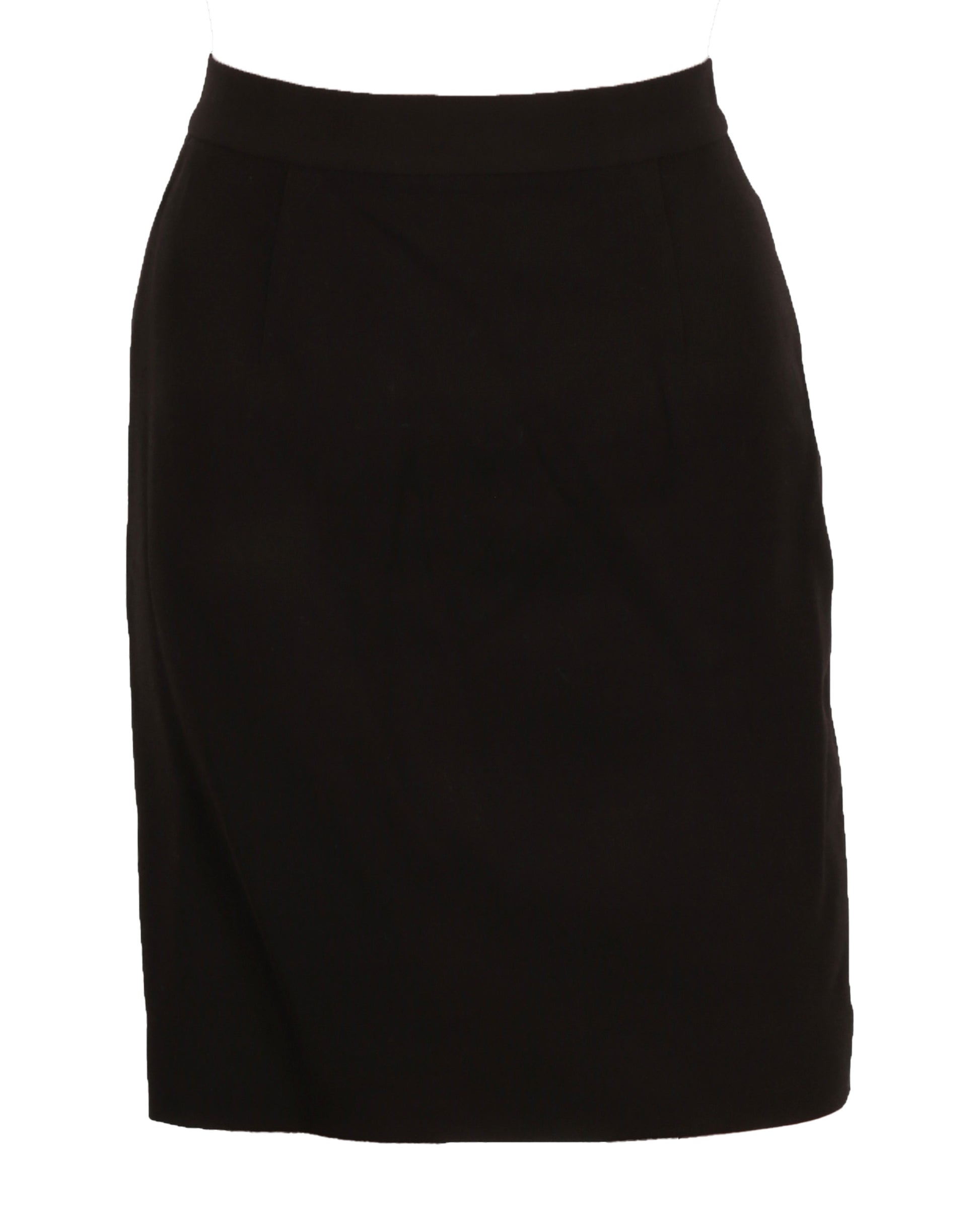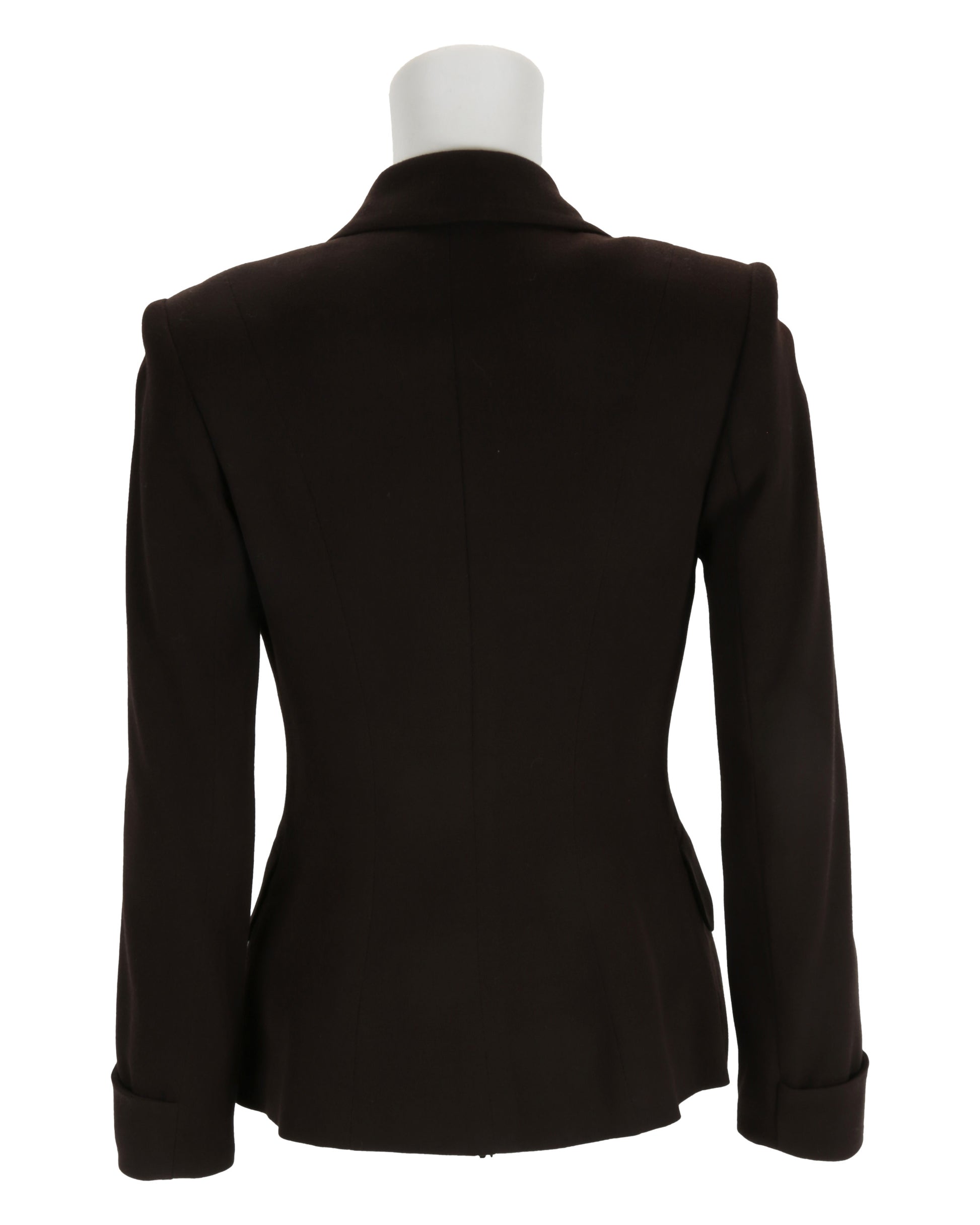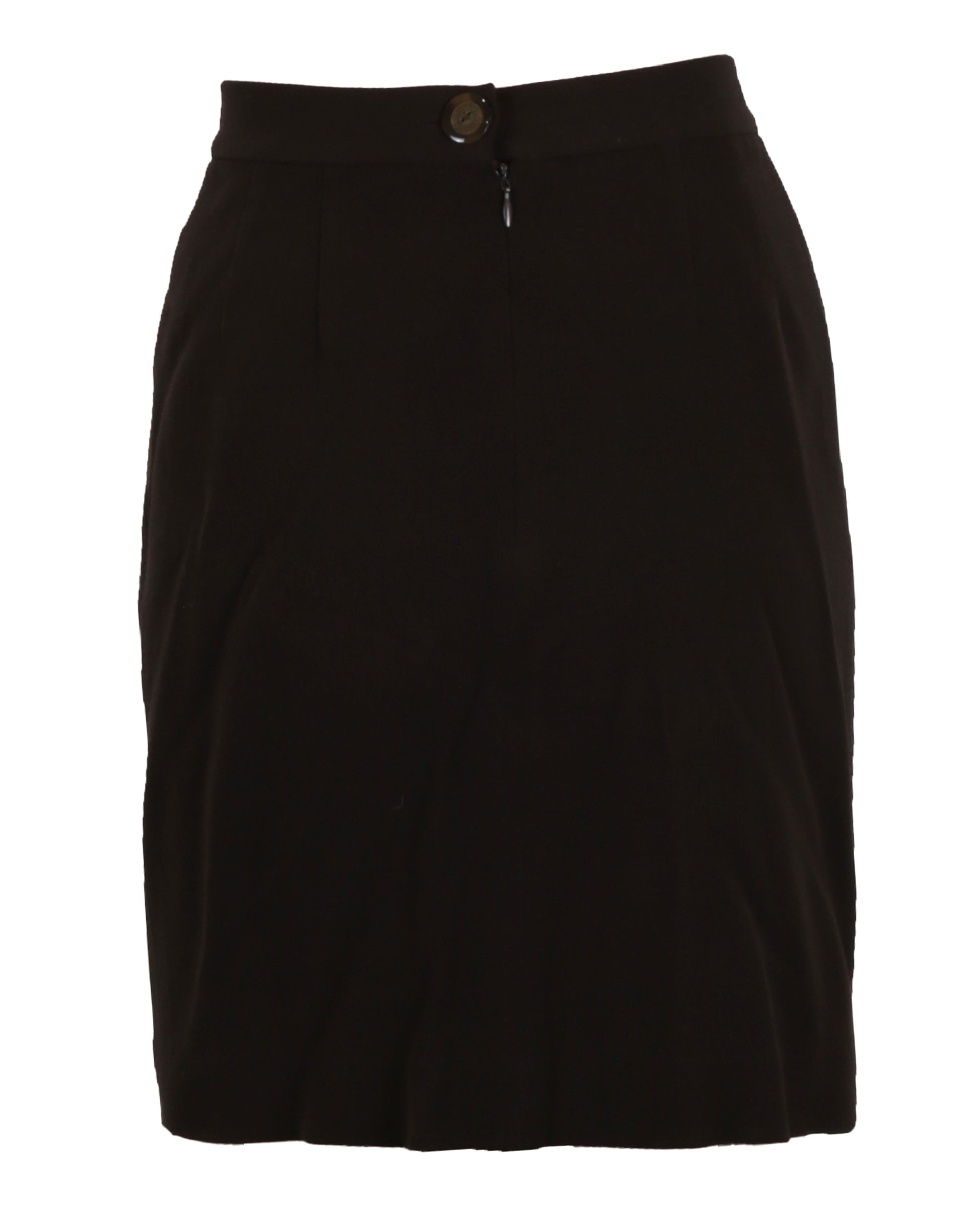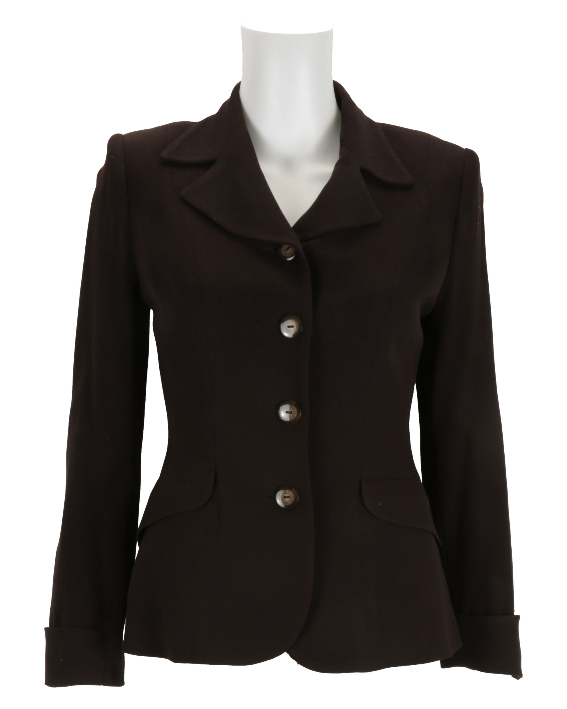 Accompanying the coat is a brown suit jacket with a button-front closure, cuffed sleeves, and faux flap pockets on the obverse sides. The interior product tag is handwritten with “HELEN.” The matching brown skirt closes with a reverse center zipper and button, with a brown satin–lined interior. The jacket is size 2, with the skirt proportioned to match, reflecting the polished, professional style of Helen Remington in the film.