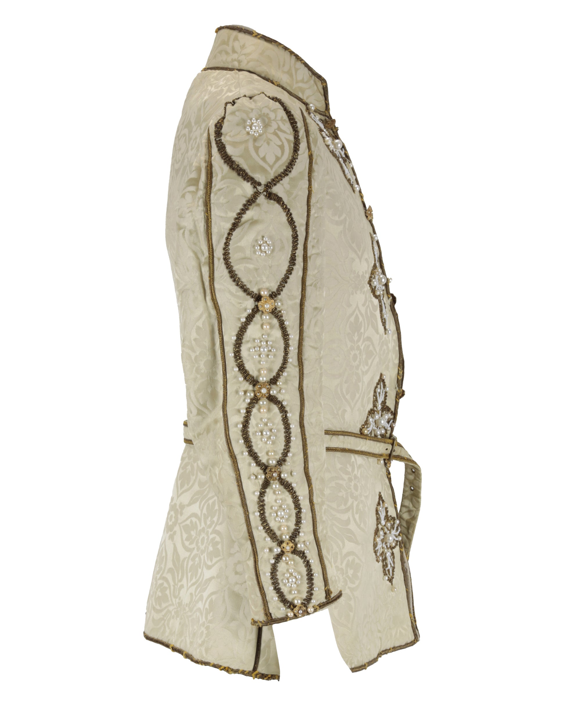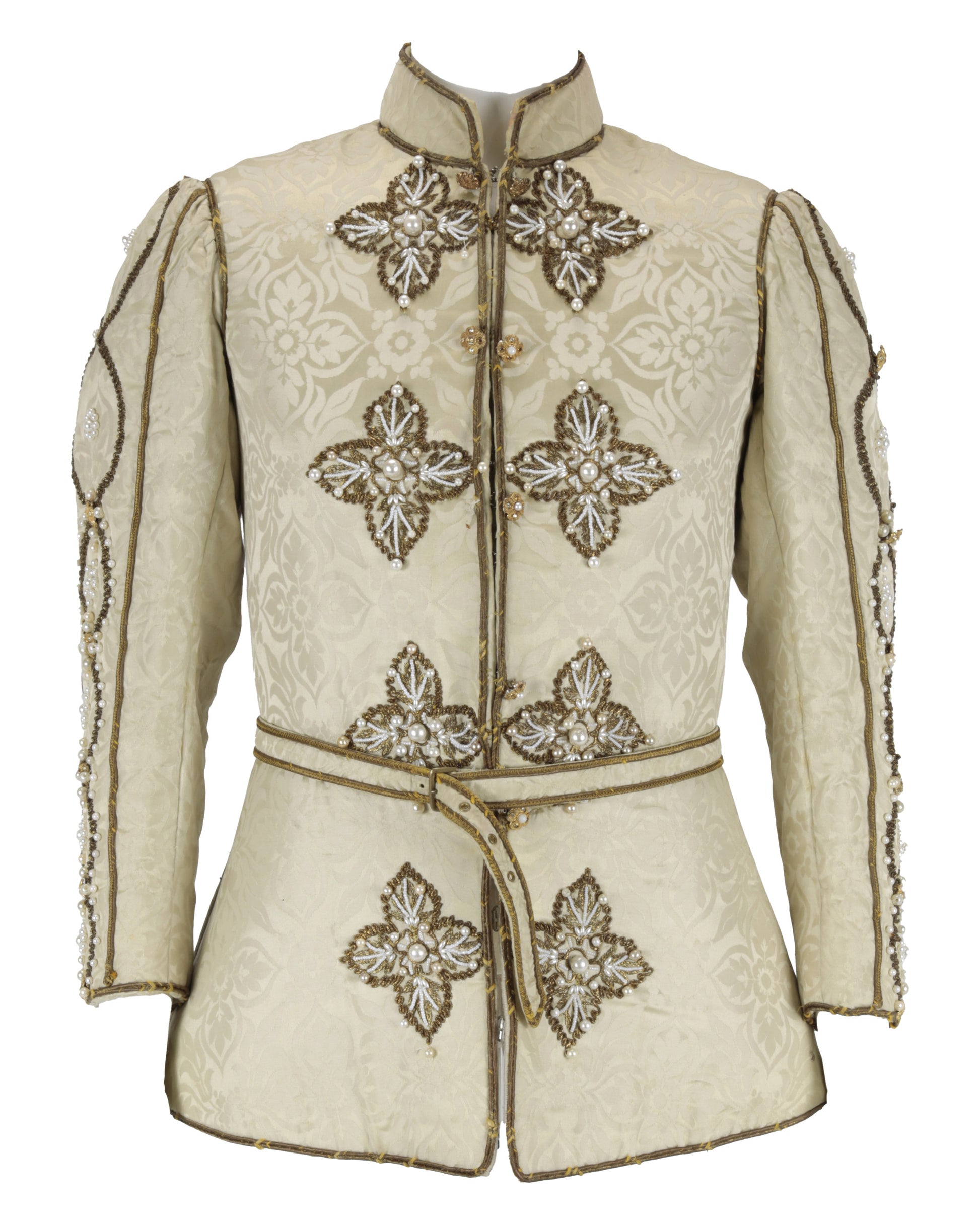 The off-white brocade doublet is richly embellished with gold piping and faux pearl decorations throughout. A belt is attached at the waist, enhancing the structured silhouette, while the front fastens with hook-and-eye closures. A Bermans & Nathans costume tag is sewn into the interior, reflecting its professional studio wardrobe origins.