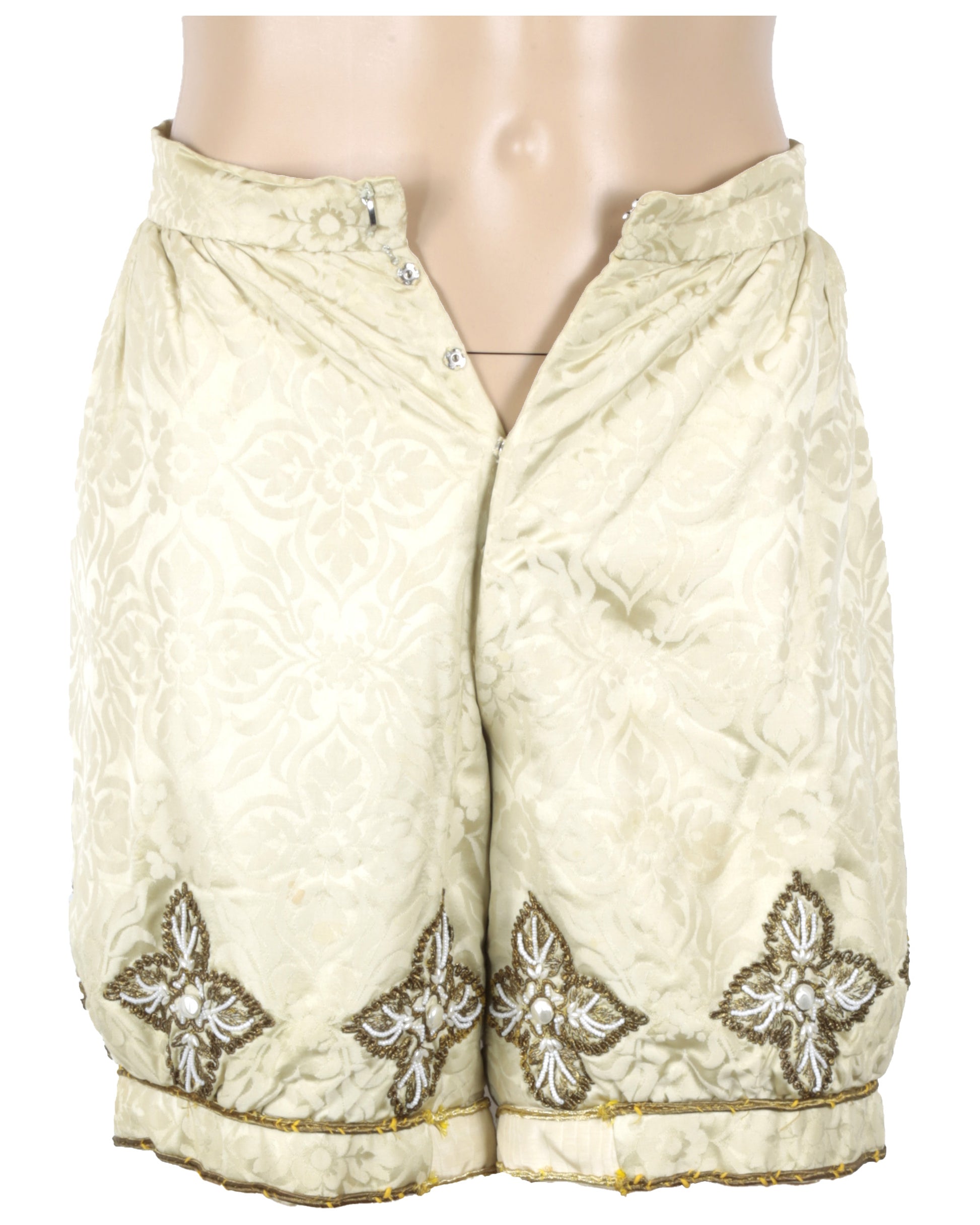 The matching off-white brocade breeches feature gold thread and faux pearl decoration concentrated along the lower portions of the legs. The breeches fasten at the obverse with a snap closure and retain a white interior waistband tag marked with a handwritten “B.” Together, the pieces present a cohesive and visually striking costume ensemble.