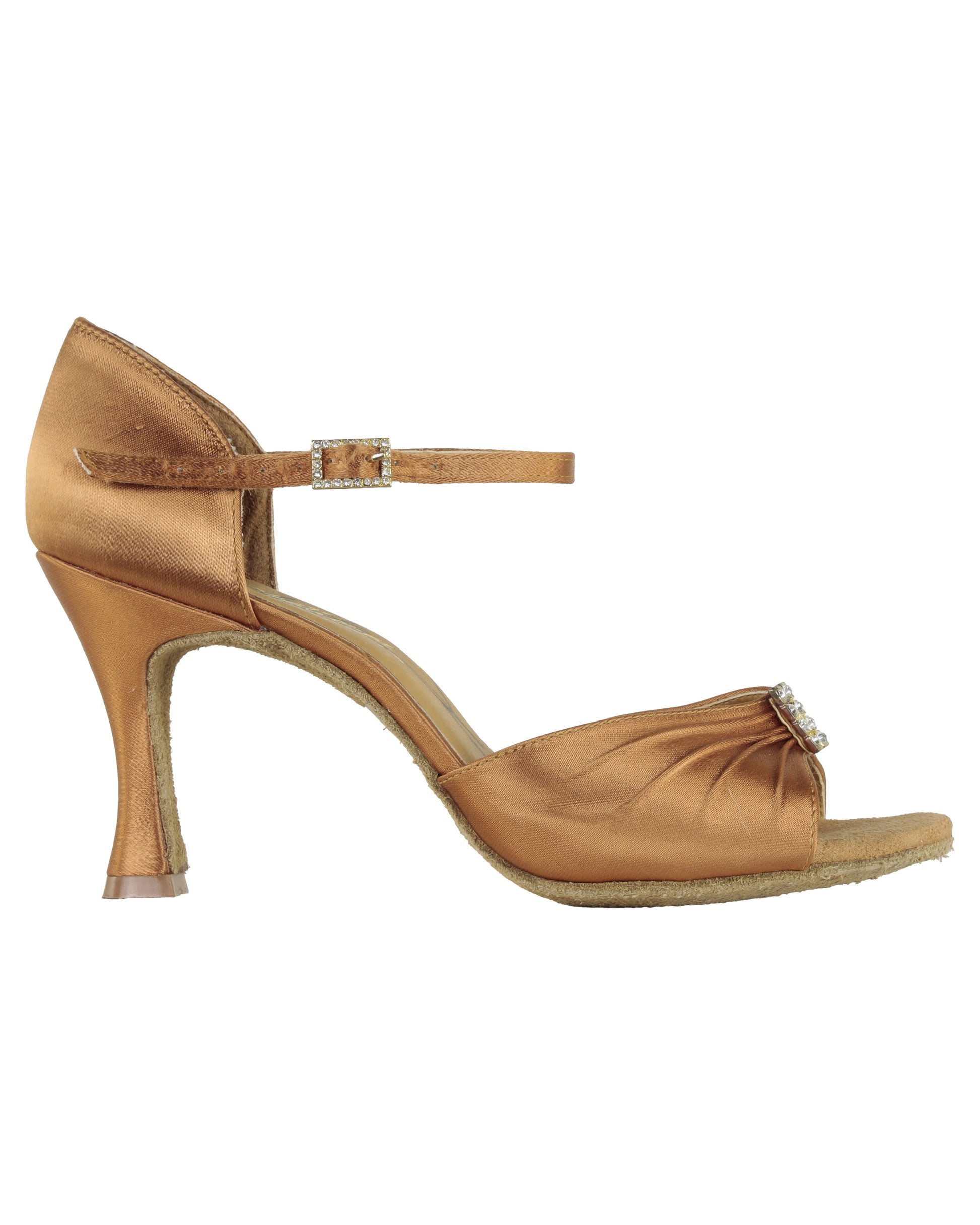 Offered here is a pair of autographed ballroom dance shoes associated with Dancing With the Stars and signed by professional dancer Edyta Śliwińska. Crafted in copper-colored satin, these International Dance Shoes feature sparkling rhinestone accents at the top of each shoe and at the ankle buckle, giving them a glamorous ballroom aesthetic closely tied to the iconic television series. The shoes are designed with buckle strap closures at the ankles and are finished with leather insoles and leather soles, reflecting traditional ballroom dance construction. Each shoe is hand-signed by Edyta Śliwińska on the insole, adding strong display appeal and collector significance. The pair includes both the proper right and proper left shoe, each in size 5 1/2.