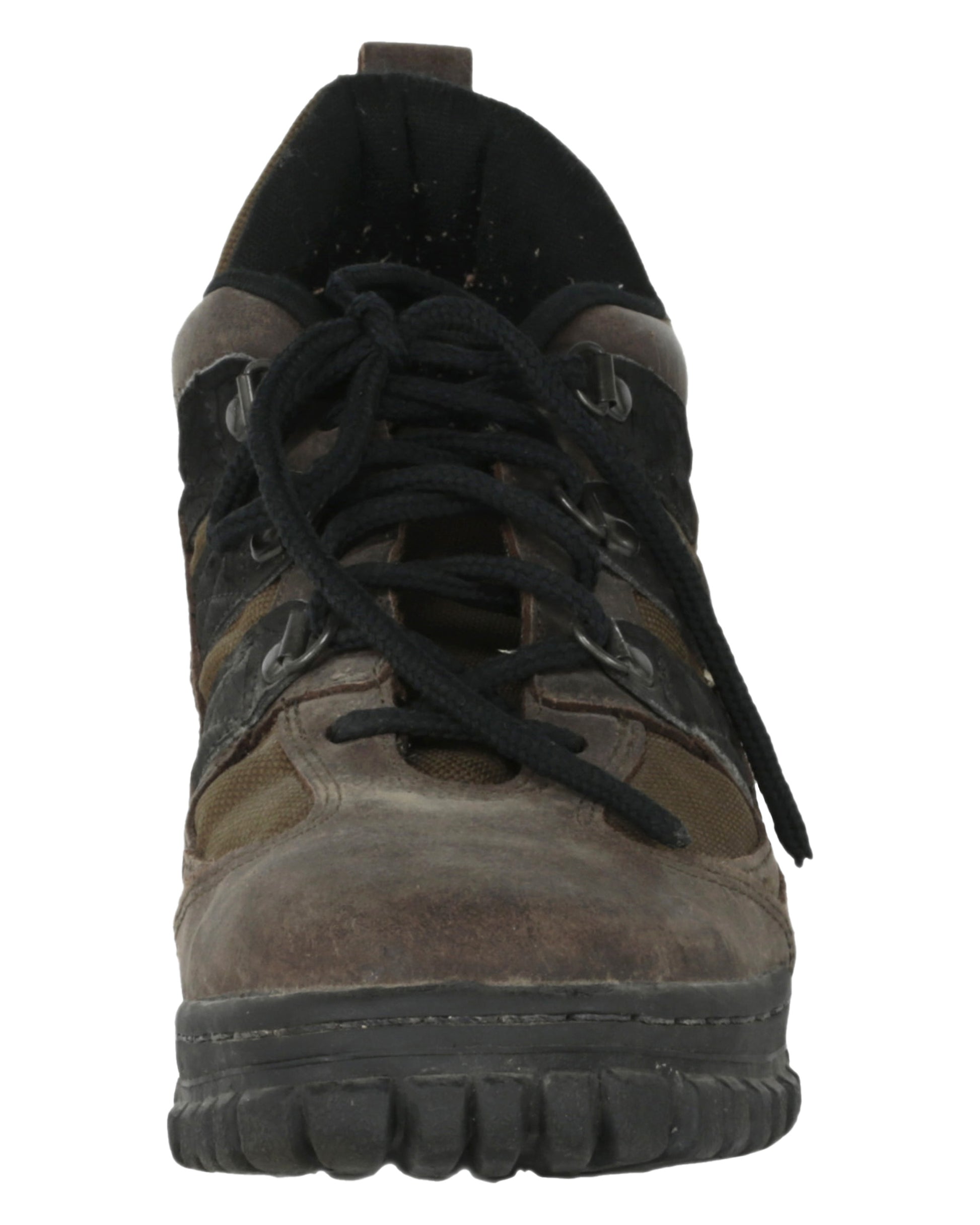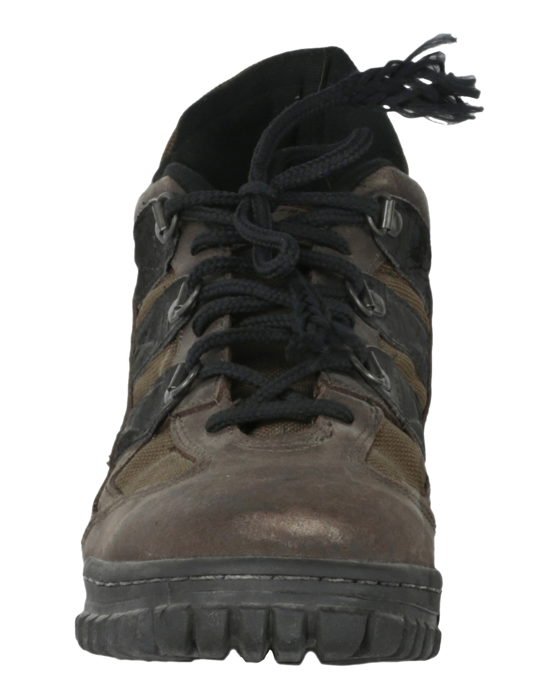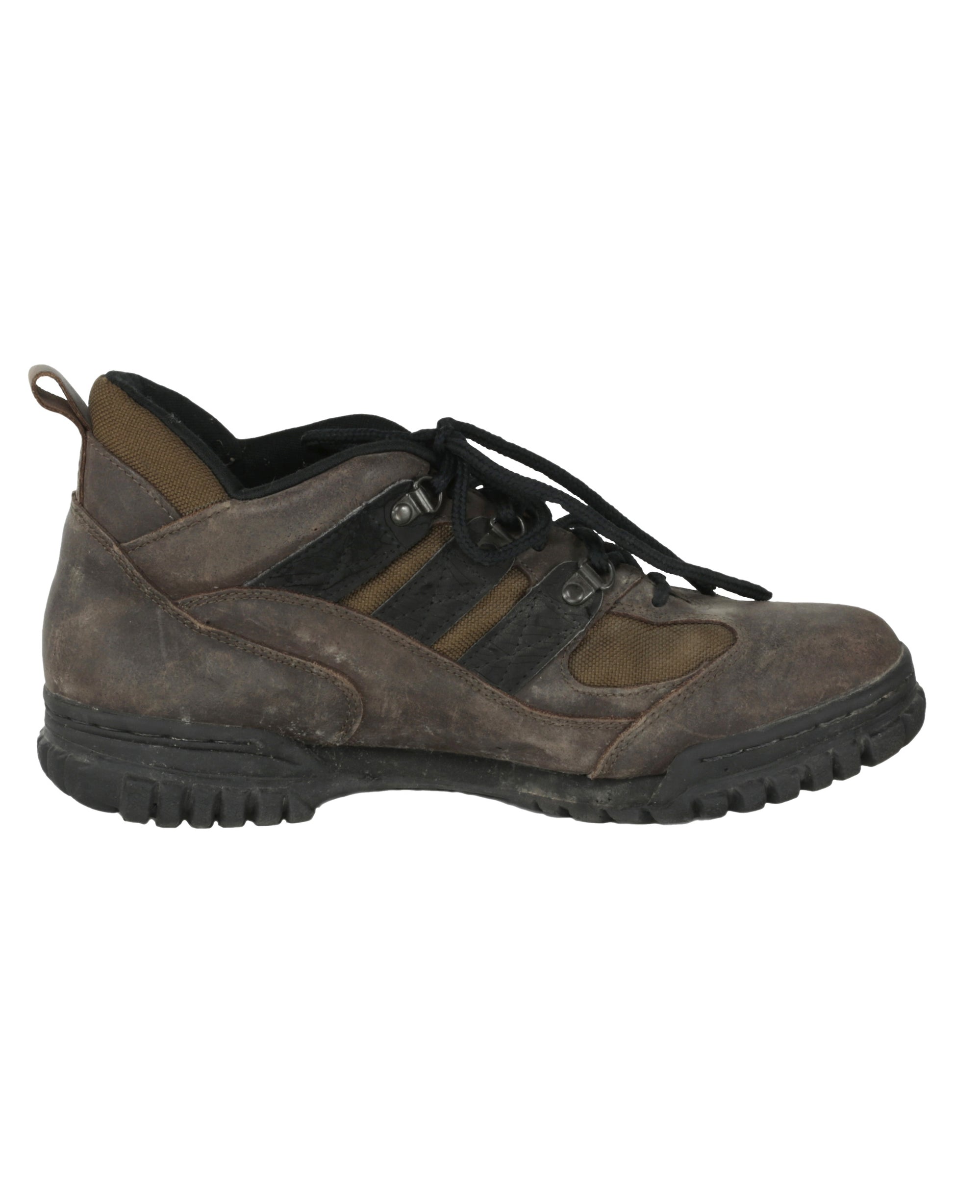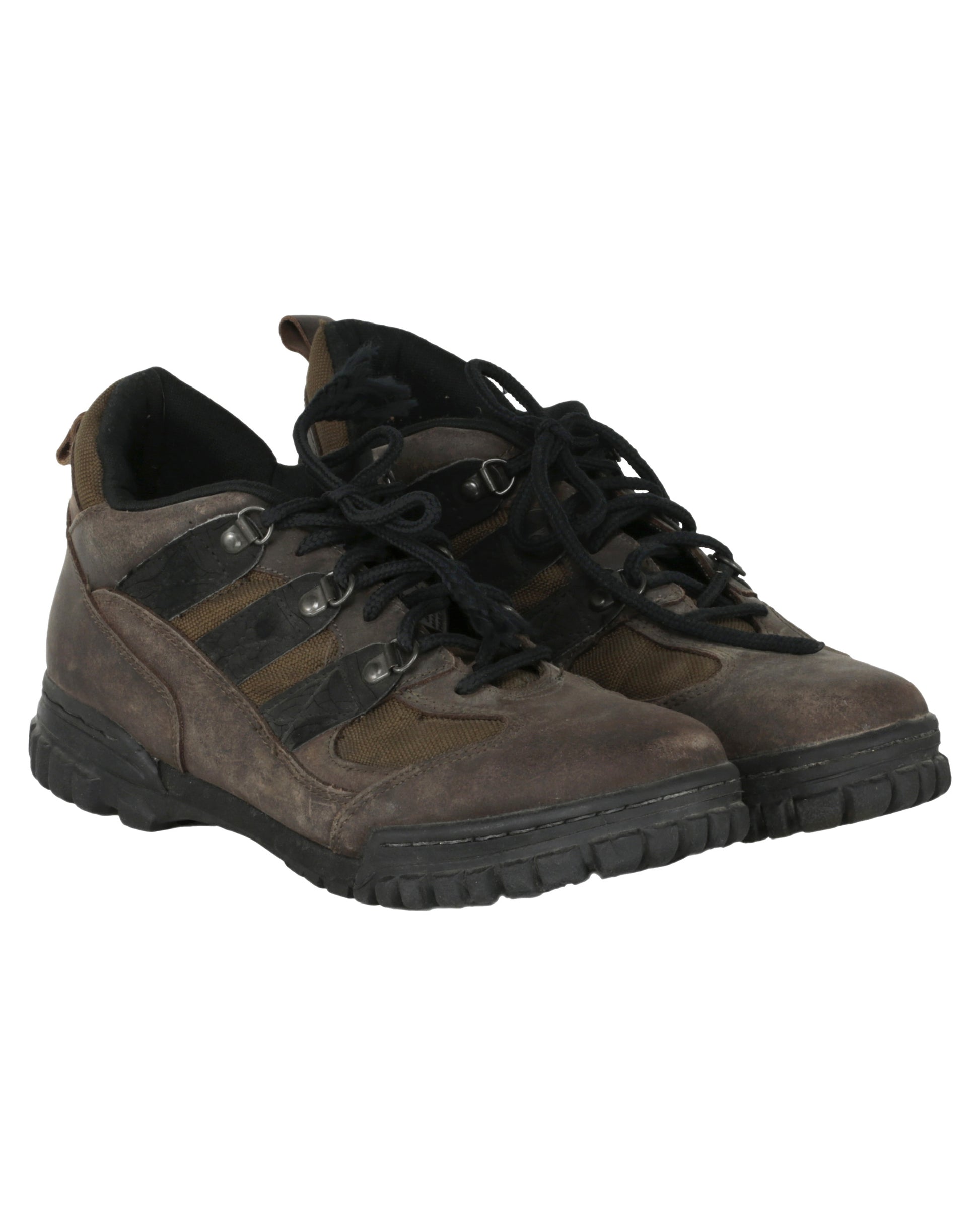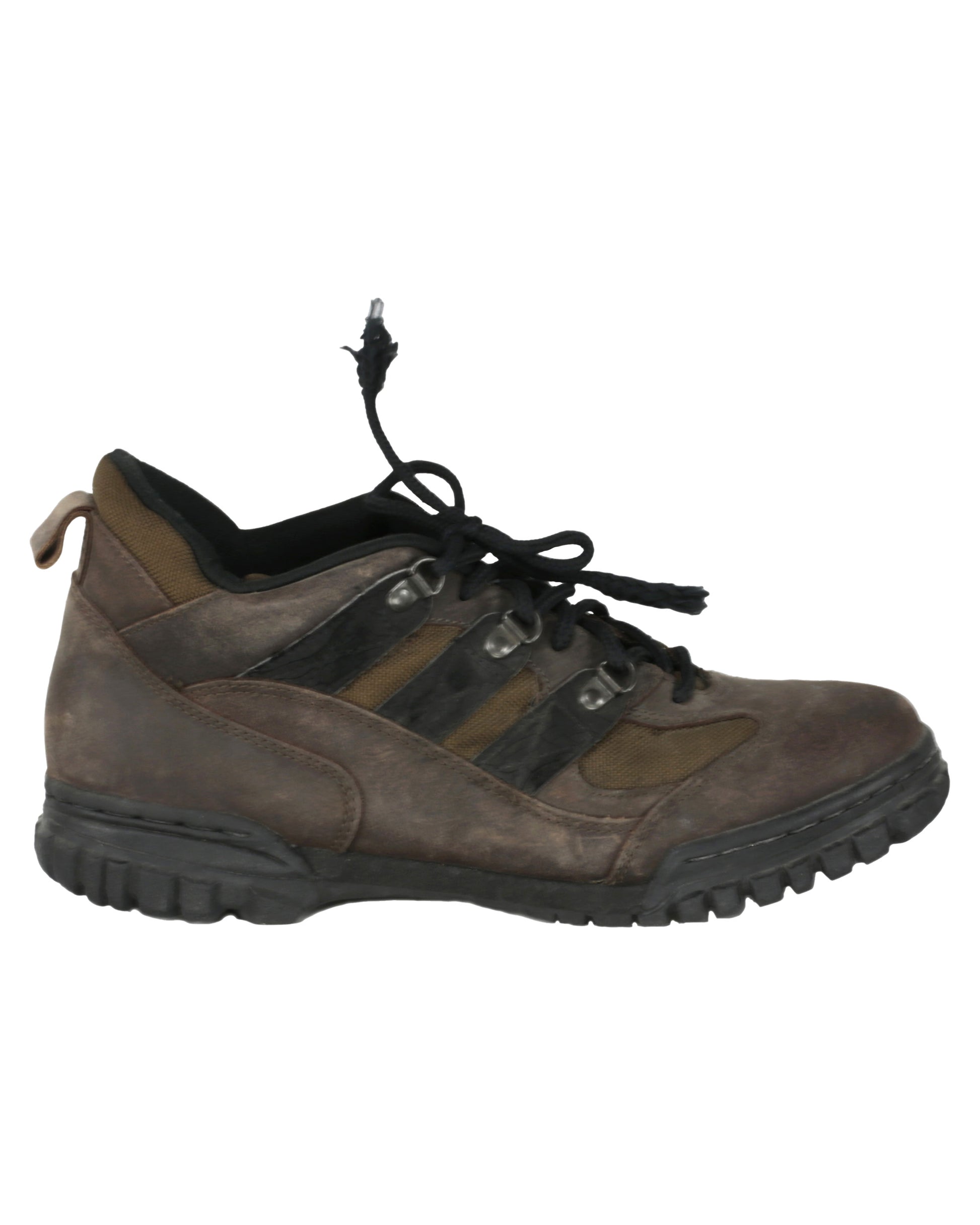 The ensemble is completed by a pair of brown adidas hiking boots, consisting of both the proper right and proper left boot. Each boot features a black rubber sole, three black stripes on both sides, and black laces threaded through six metal loops. The tongues retain leather labels reading “adidas,” with the soles also stamped “adidas,” and white interior insole labels displaying product information. Together, these elements form a rugged and instantly recognizable costume reflecting the gritty, high-stakes environment of Daylight.