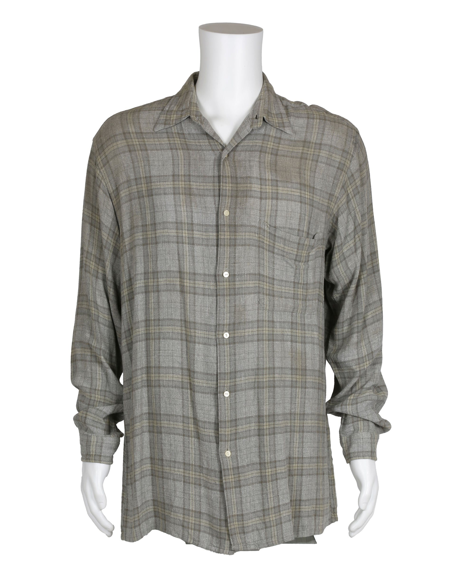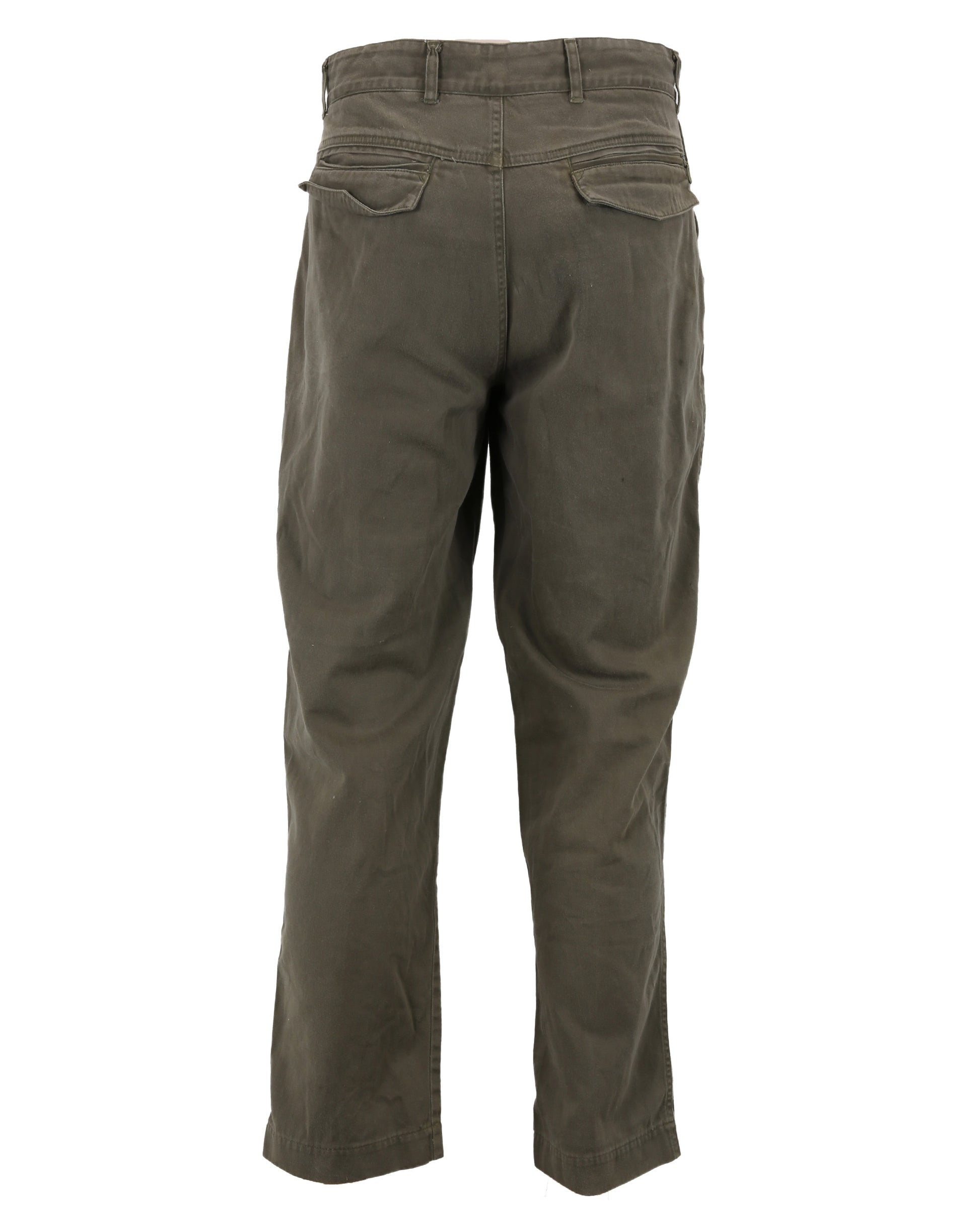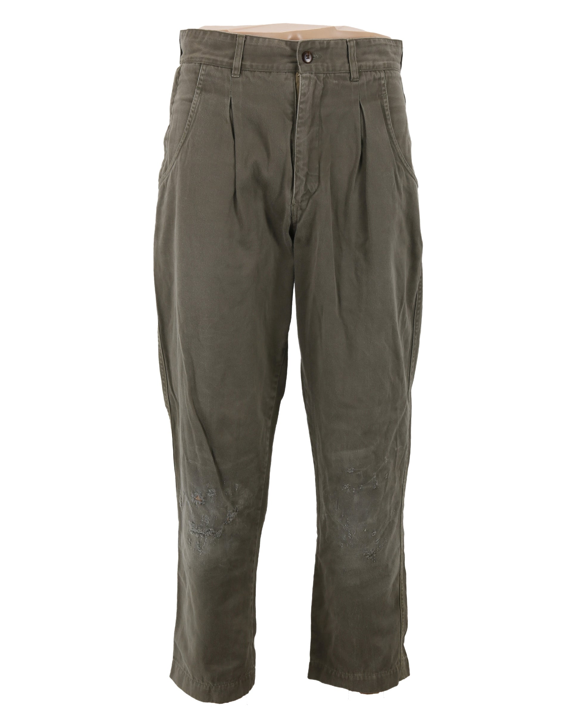 Offered here is Kit Latura’s costume ensemble from the action thriller Daylight, associated with Sylvester Stallone’s portrayal of the film’s heroic tunnel rescue expert. The outfit includes a Calvin Klein brand long-sleeve shirt in gray, green, and brown tones, sized large, and featuring a patch pocket over the proper left breast. Accompanying the shirt is a pair of green pants designed with rounded hip pockets, a zipper side pocket at the proper right hip, and flap pockets at the reverse on each side of the seat. The pants display faux blood staining throughout the legs along with intentional fraying at both knees, with a reinforcing patch applied to the interior of the proper right knee. The interior waistband is marked with the handwritten number “31,” adding a distinctive production-related detail.