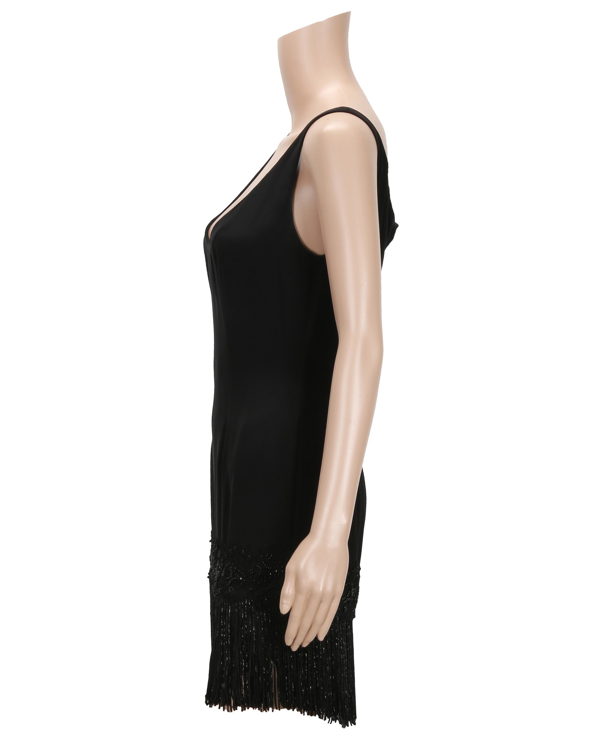 The dress features thin shoulder straps and decorative fringe beading along the bottom hem, adding subtle movement and visual interest on screen. A central zipper closure on the reverse ensures a fitted silhouette, and the dress remains in its original form, with no interior tags, preserving its authentic screen-worn status.