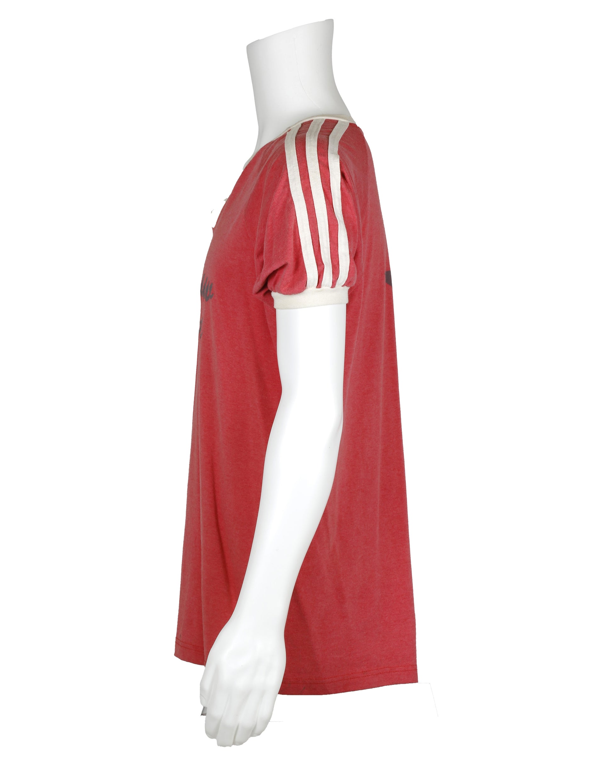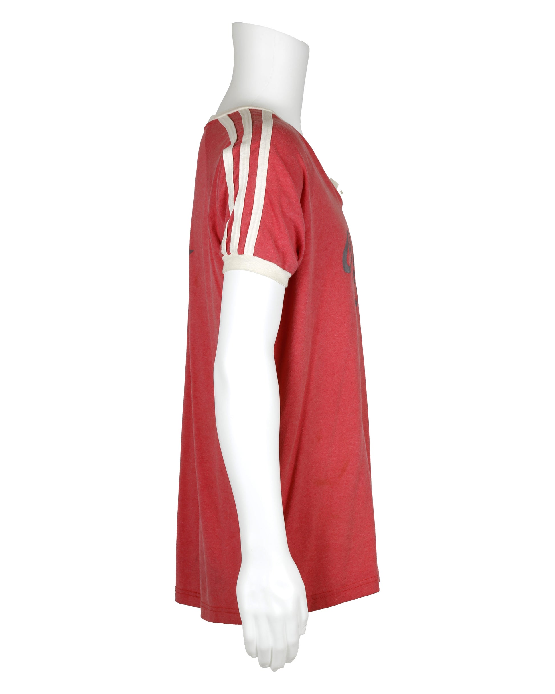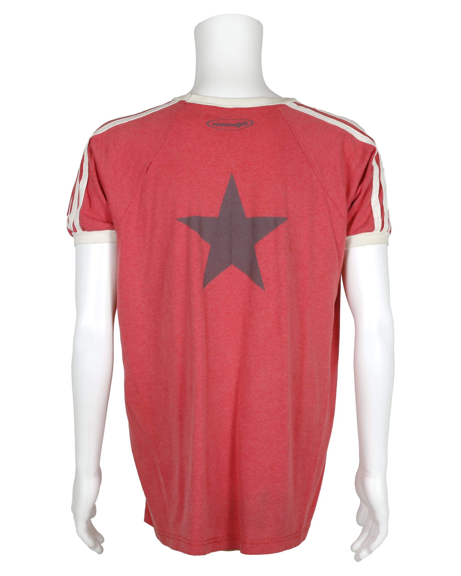 Mark’s T-shirt from Empire Records, associated with Ethan Embry’s character, is a distinctive piece of film costume reflecting the cult 1990s classic’s style. This red short-sleeve baseball-style shirt features white trim around the collar and sleeves, with “Chainsaw / Kittens” printed across the front center. The back displays an oval with “mammoth” inside and a large star in the center, capturing the film’s playful and eclectic costume design. The interior tag reads “Adult XL / Augusta / SPORTSWEAR / Made In U.S.A.,” with care instructions on the reverse. A compelling collectible, this T-shirt appeals to fans of Empire Records, 1990s film enthusiasts, and movie memorabilia collectors.