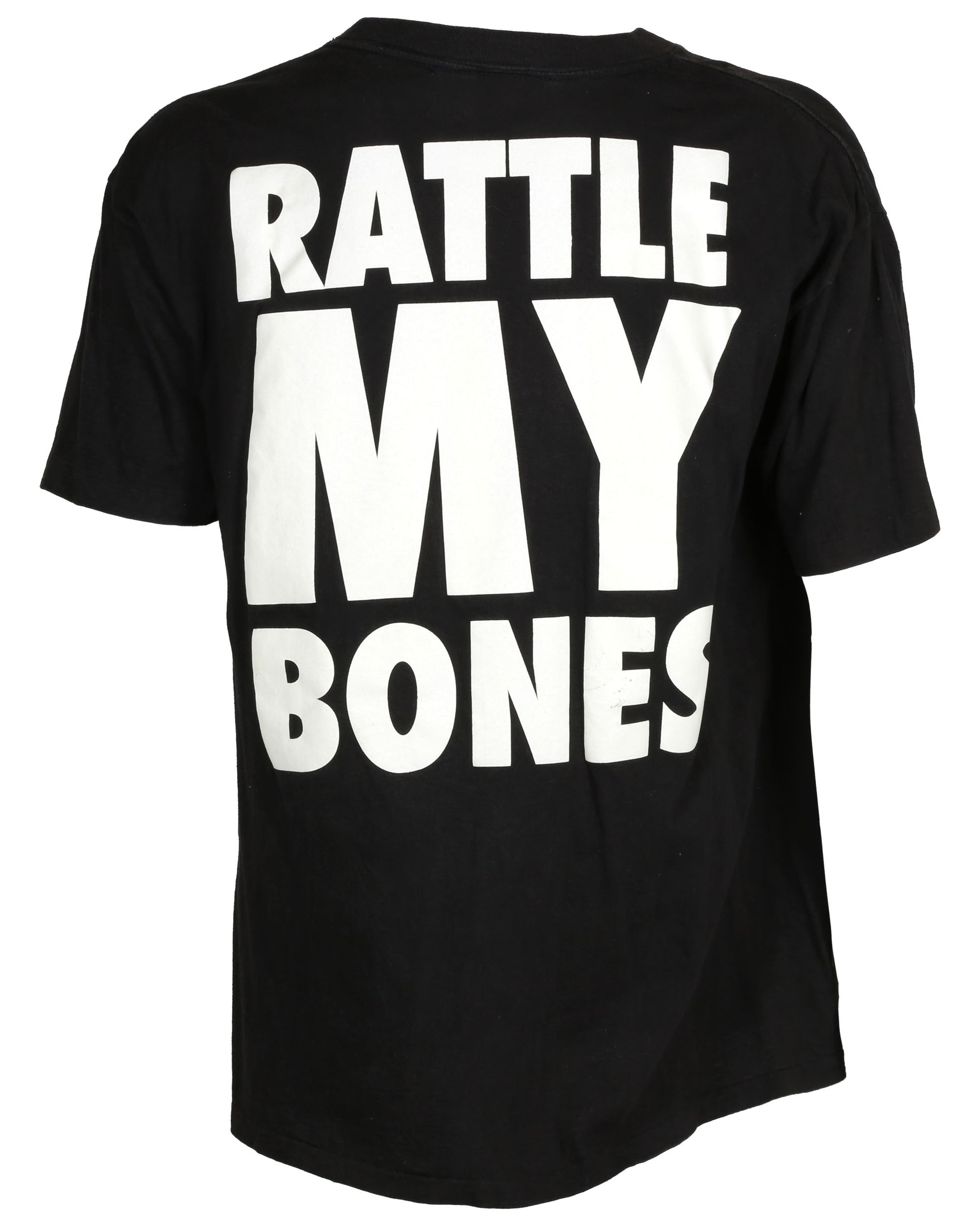 The first shirt is a black short-sleeve T-shirt, size Large, featuring a large white skull appliqué on the front. The back displays bold white text reading “RATTLE / MY / BONES.” Both the skull and the text are glow-in-the-dark. Two interior tags are present, with the top tag reading “WILD / ELEPHANT / UNDERWEAR CO.” and a second tag below providing care instructions and product information.