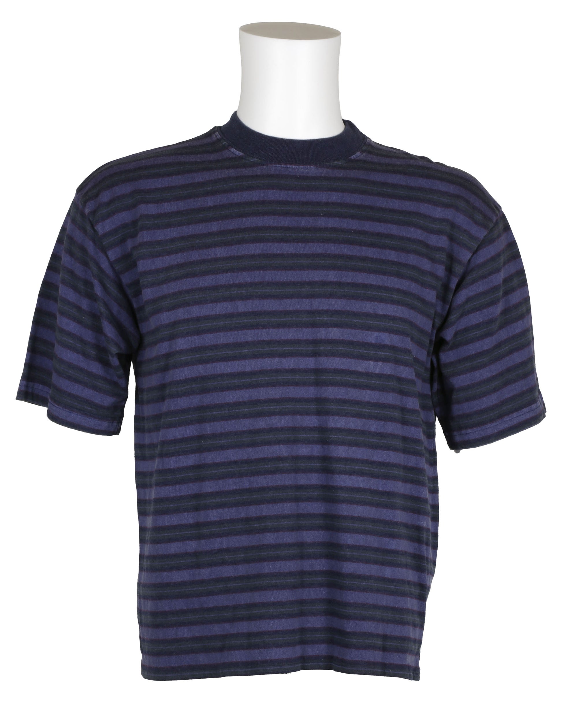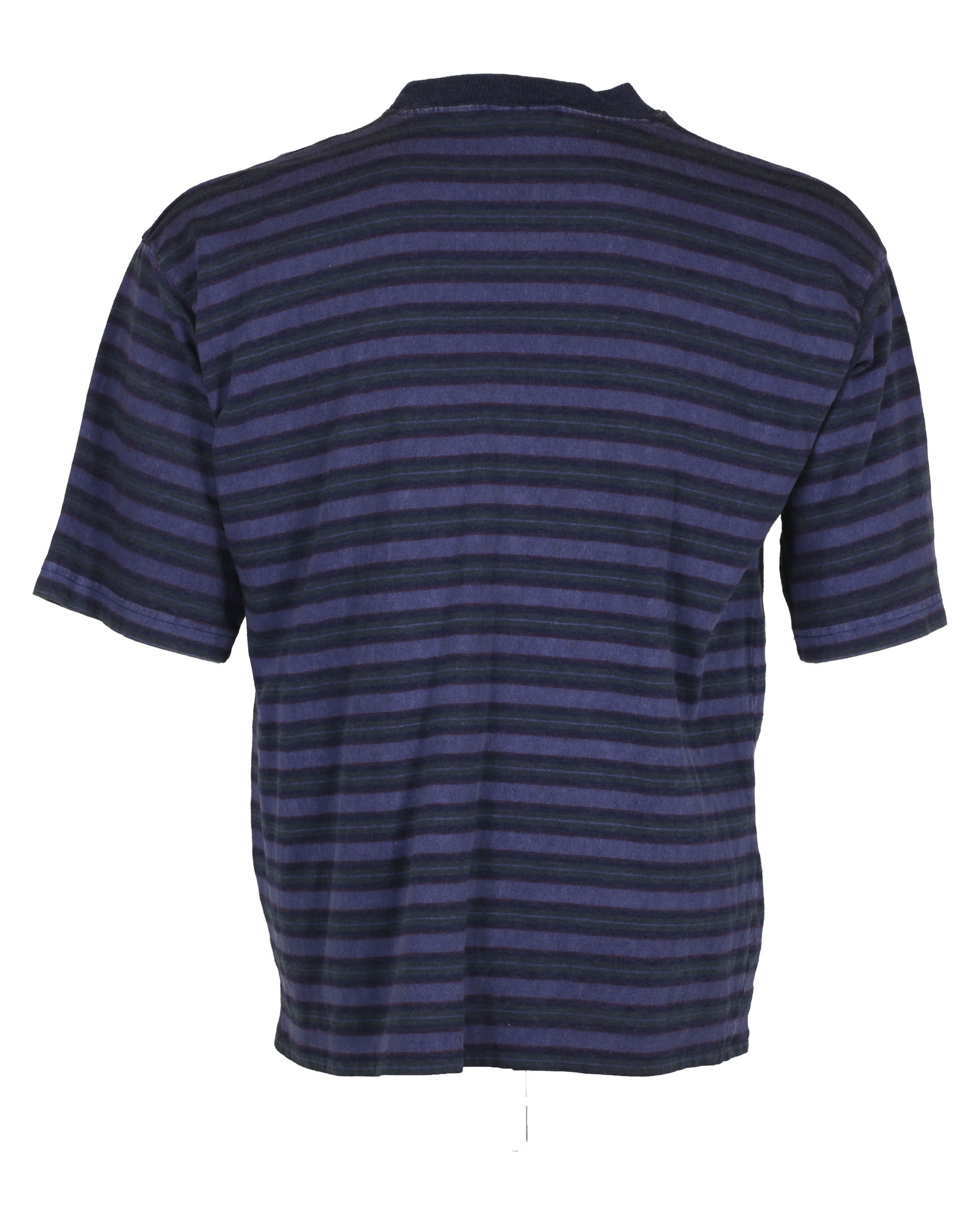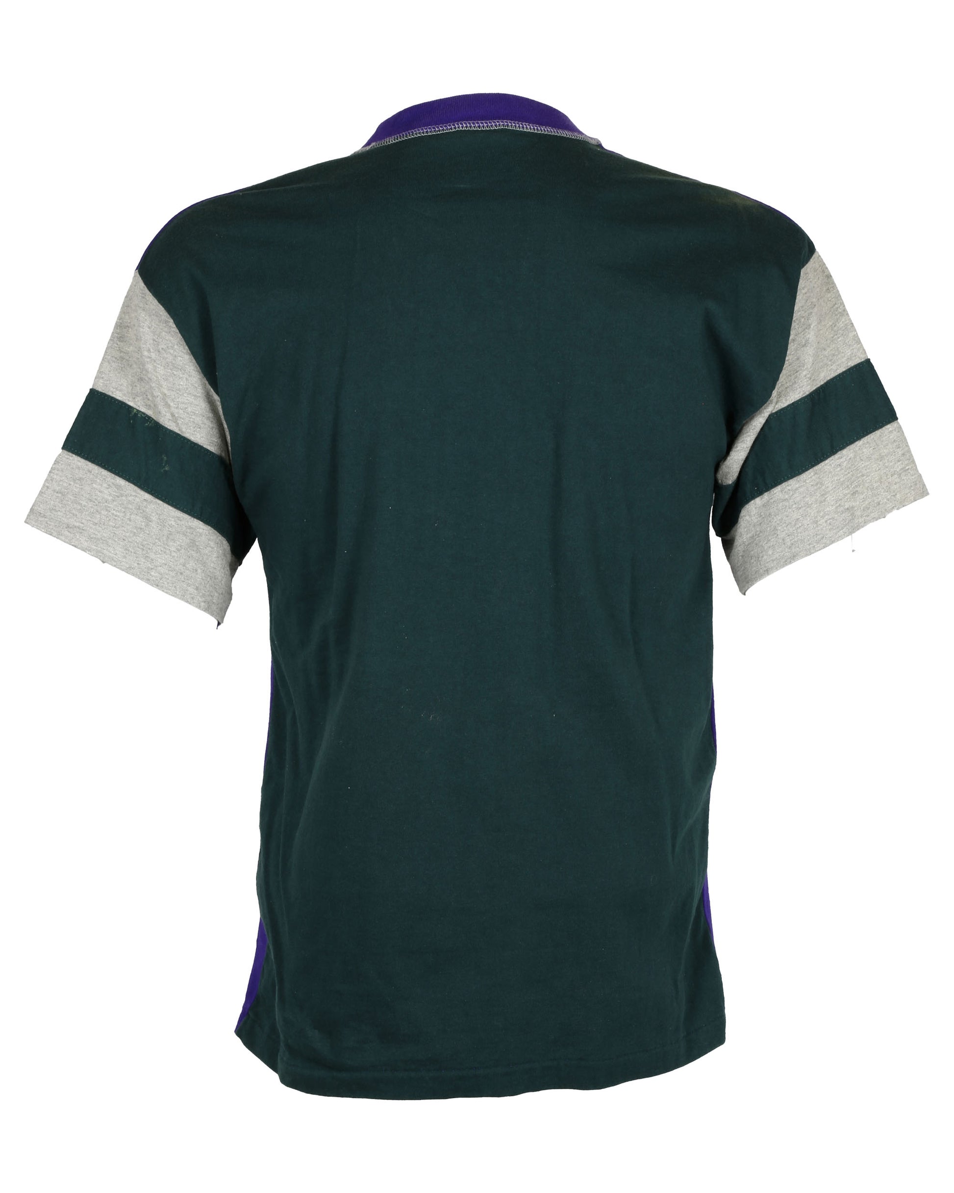The third shirt is a purple T-shirt with contrasting green and gray short sleeves and a green back panel. The interior tags at the back of the collar have been cut out.