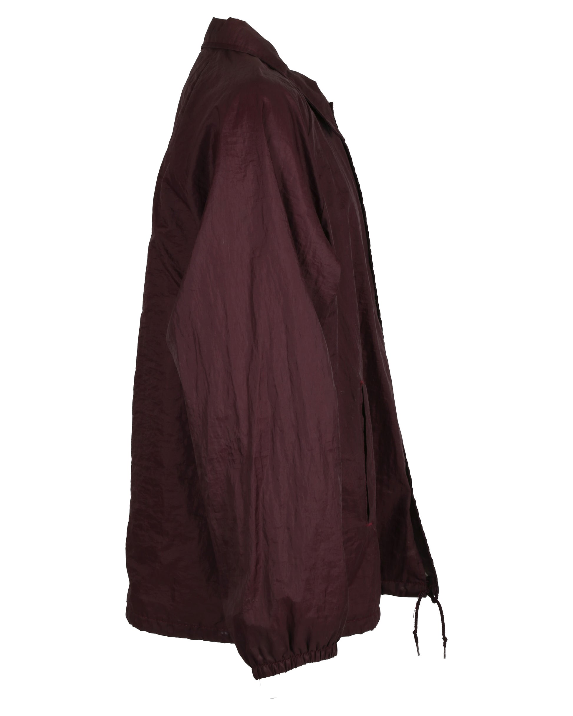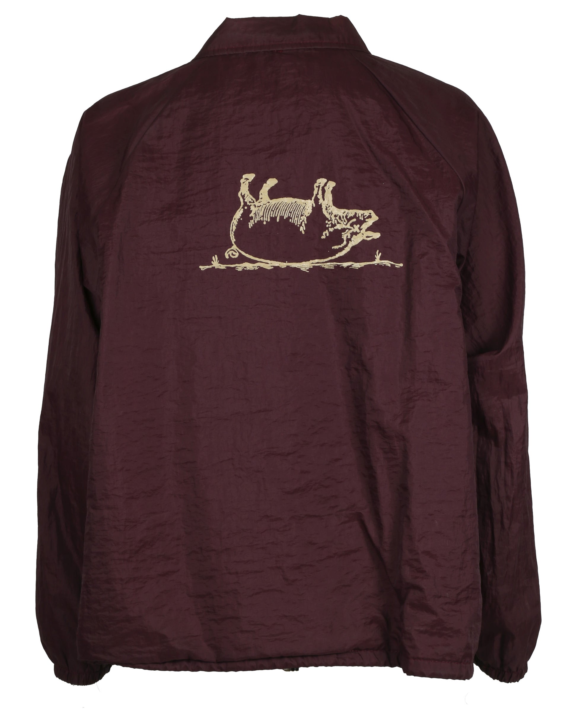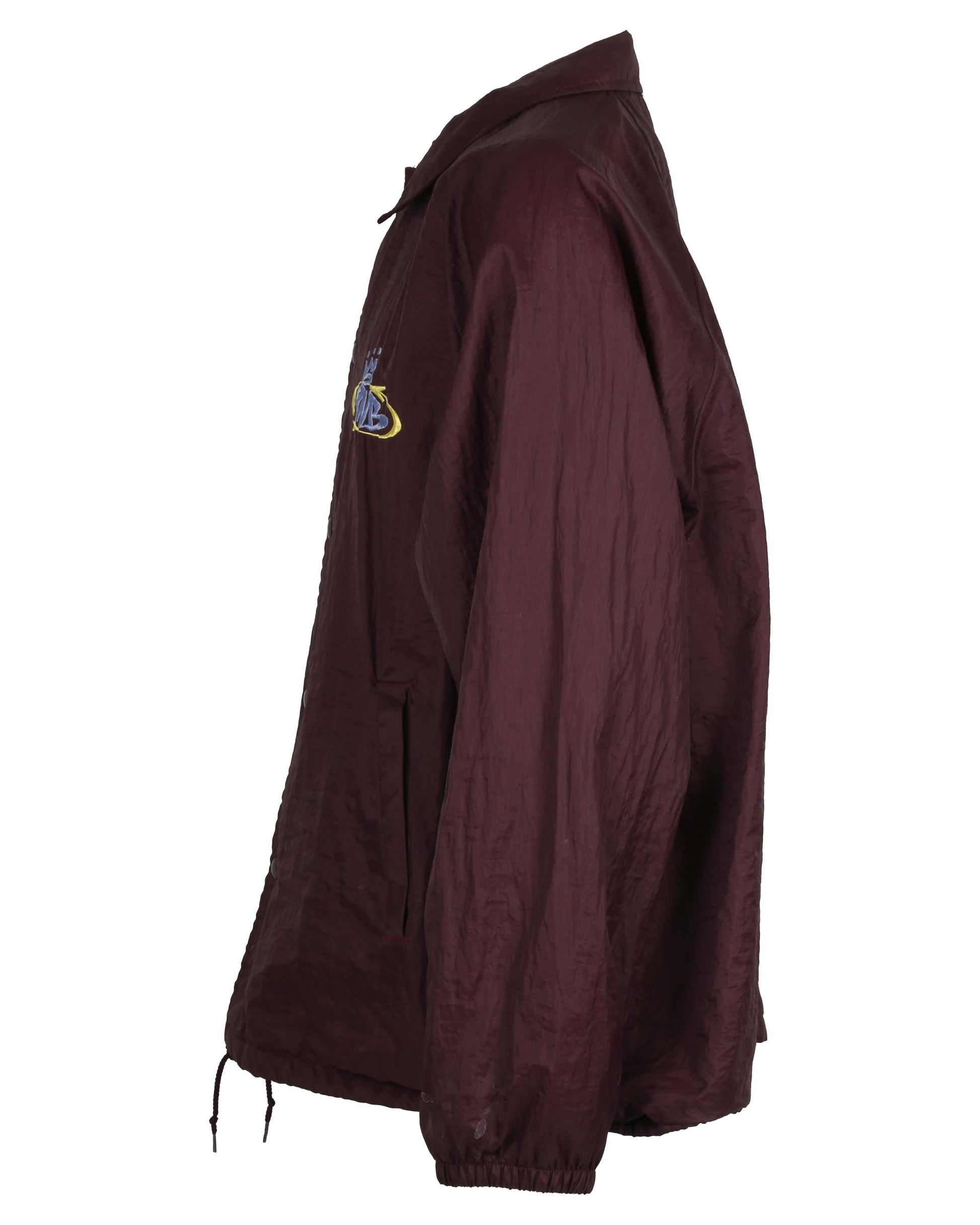 This costume ensemble and script pages are associated with the character Warren, portrayed by Brendan Sexton III, in the cult classic film Empire Records. The grouping includes Warren’s distinctive maroon windbreaker jacket featuring a polo-style collar and five snap-button front closure, with welt pockets at each side. The proper left chest is embroidered with a yellow oval emblem topped by a light blue crown and the letters “PMB,” while the center back displays a tan graphic of a pig lying on its back. The jacket has an adjustable maroon drawstring at the bottom hem and is lined with white cotton fabric, with the interior tag removed. Also included is a navy, olive, and tan striped shirt with a Banana Republic label at the neckline, paired with blue Dickies brand jeans sized 32x32, featuring welt pockets on the front and back, a tool pocket on the proper right thigh, and a hammer loop on the proper left thigh, reflecting Warren’s casual, working-class look in the film.