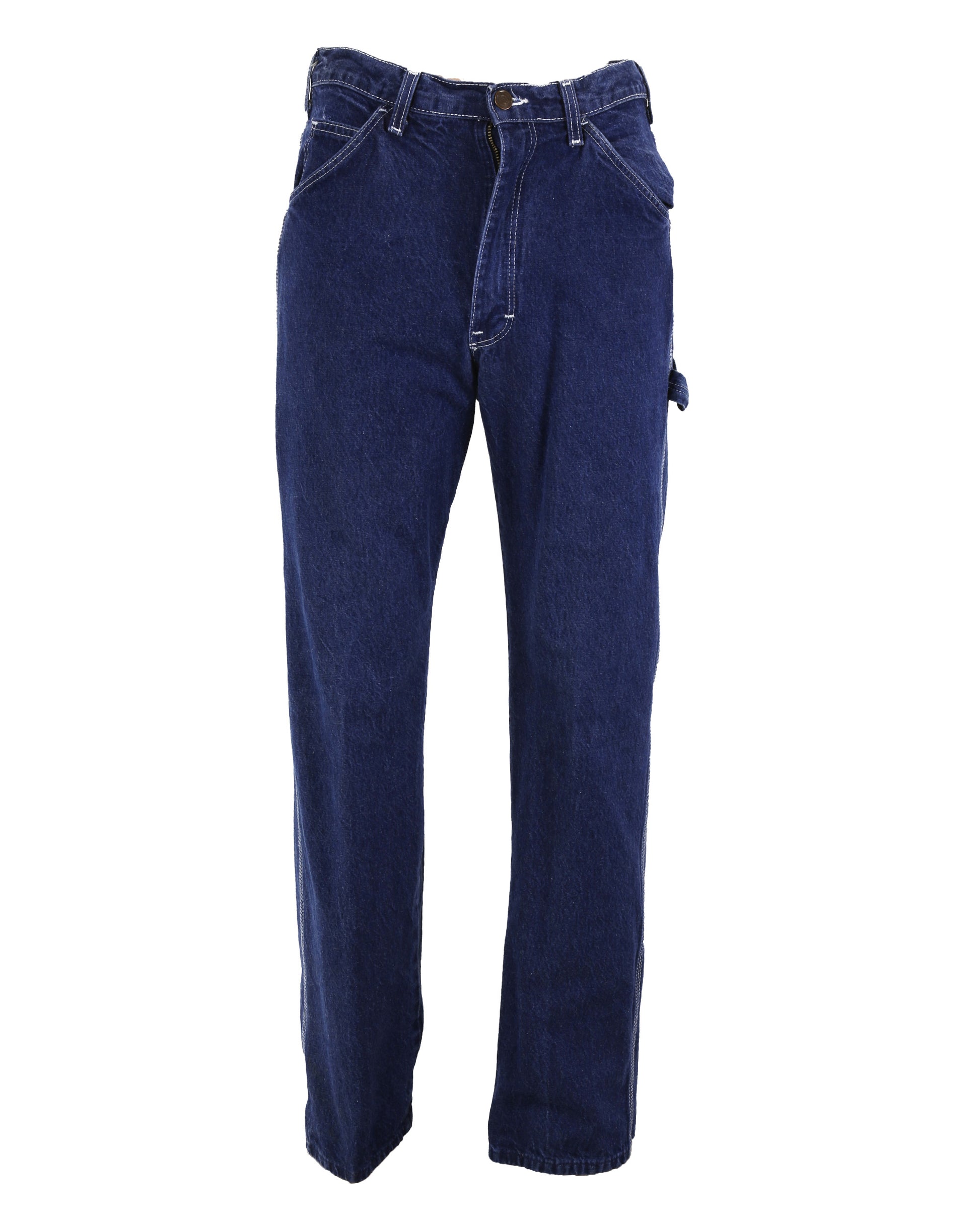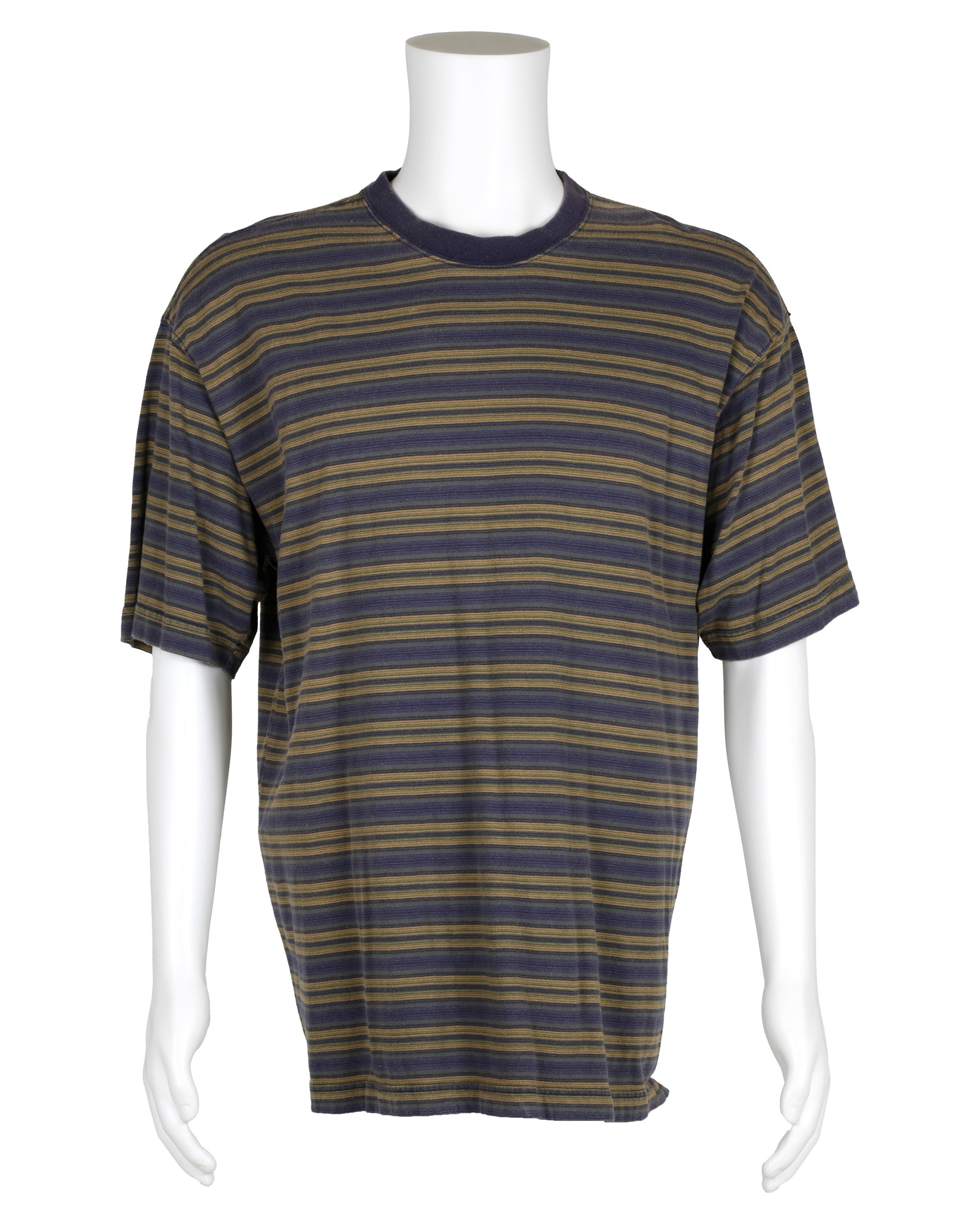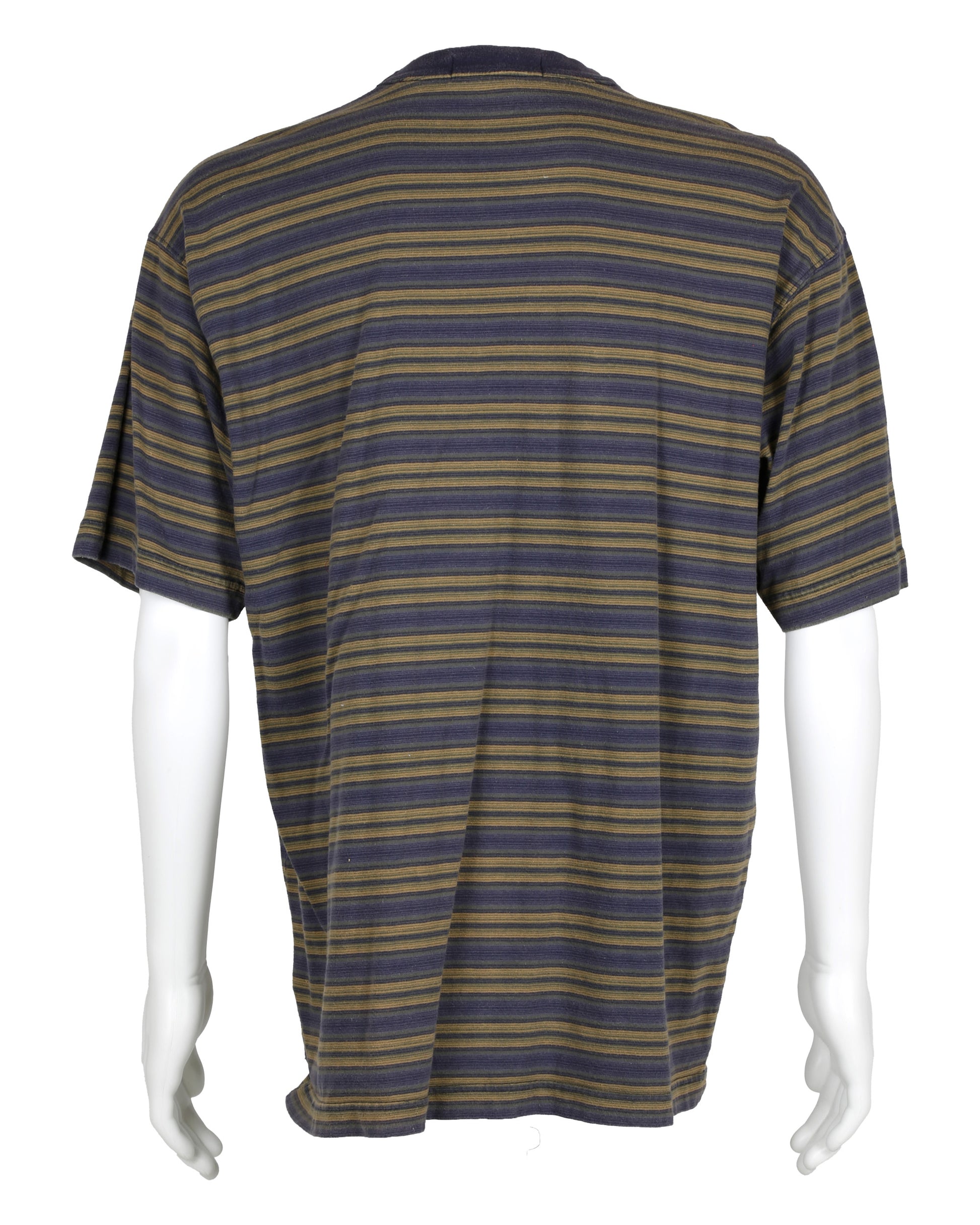 This costume ensemble and script pages are associated with the character Warren, portrayed by Brendan Sexton III, in the cult classic film Empire Records. The grouping includes Warren’s distinctive maroon windbreaker jacket featuring a polo-style collar and five snap-button front closure, with welt pockets at each side. The proper left chest is embroidered with a yellow oval emblem topped by a light blue crown and the letters “PMB,” while the center back displays a tan graphic of a pig lying on its back. The jacket has an adjustable maroon drawstring at the bottom hem and is lined with white cotton fabric, with the interior tag removed. Also included is a navy, olive, and tan striped shirt with a Banana Republic label at the neckline, paired with blue Dickies brand jeans sized 32x32, featuring welt pockets on the front and back, a tool pocket on the proper right thigh, and a hammer loop on the proper left thigh, reflecting Warren’s casual, working-class look in the film.