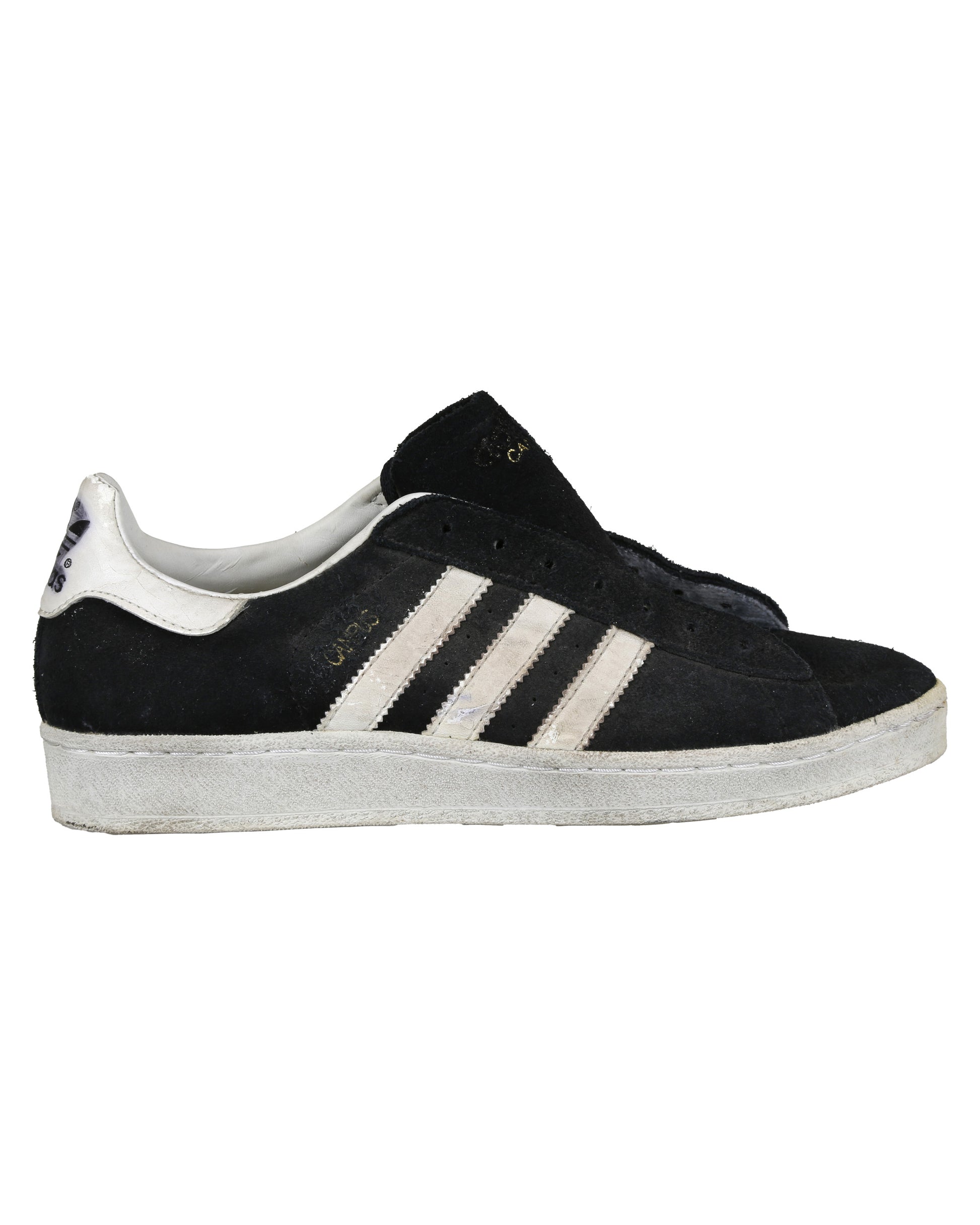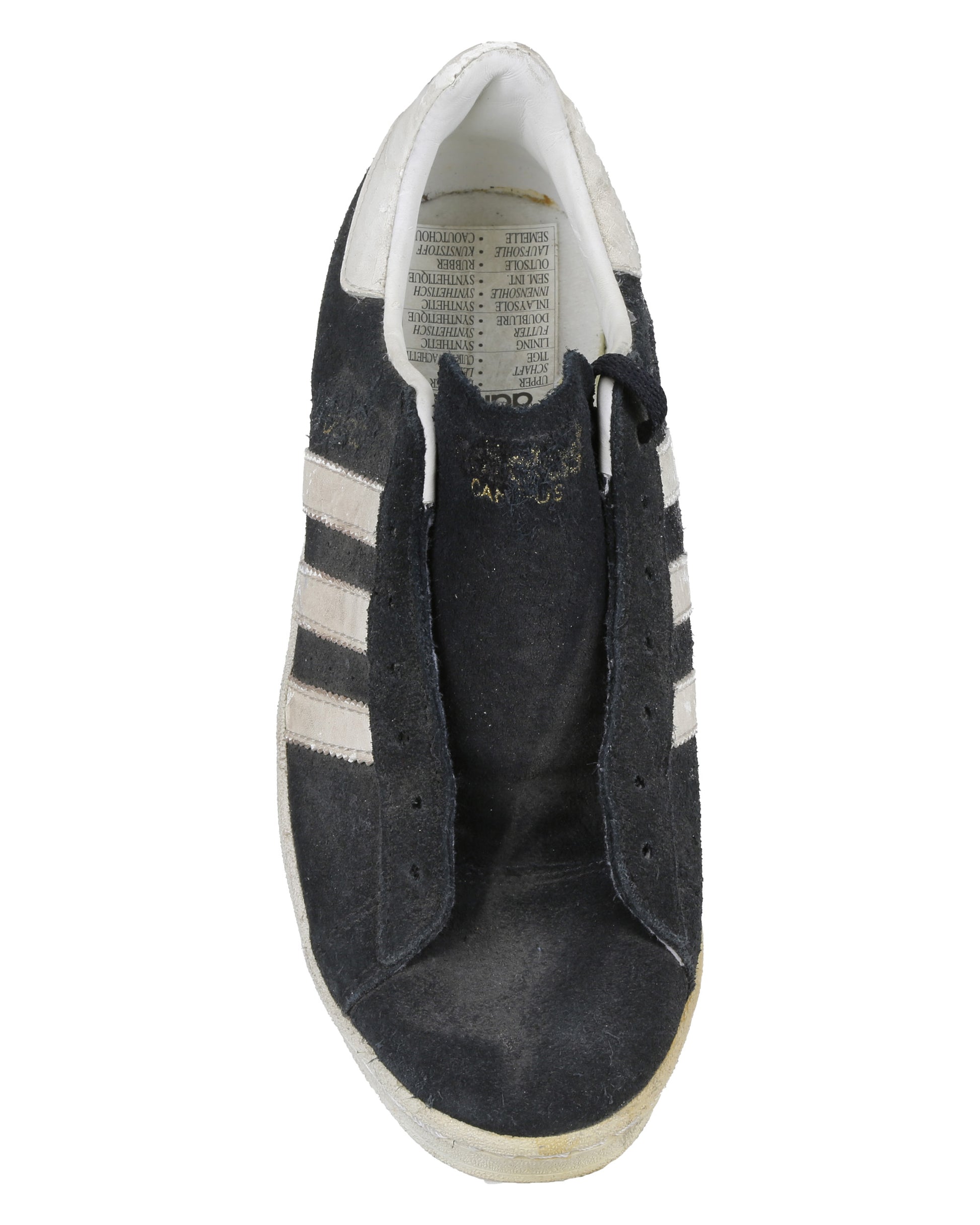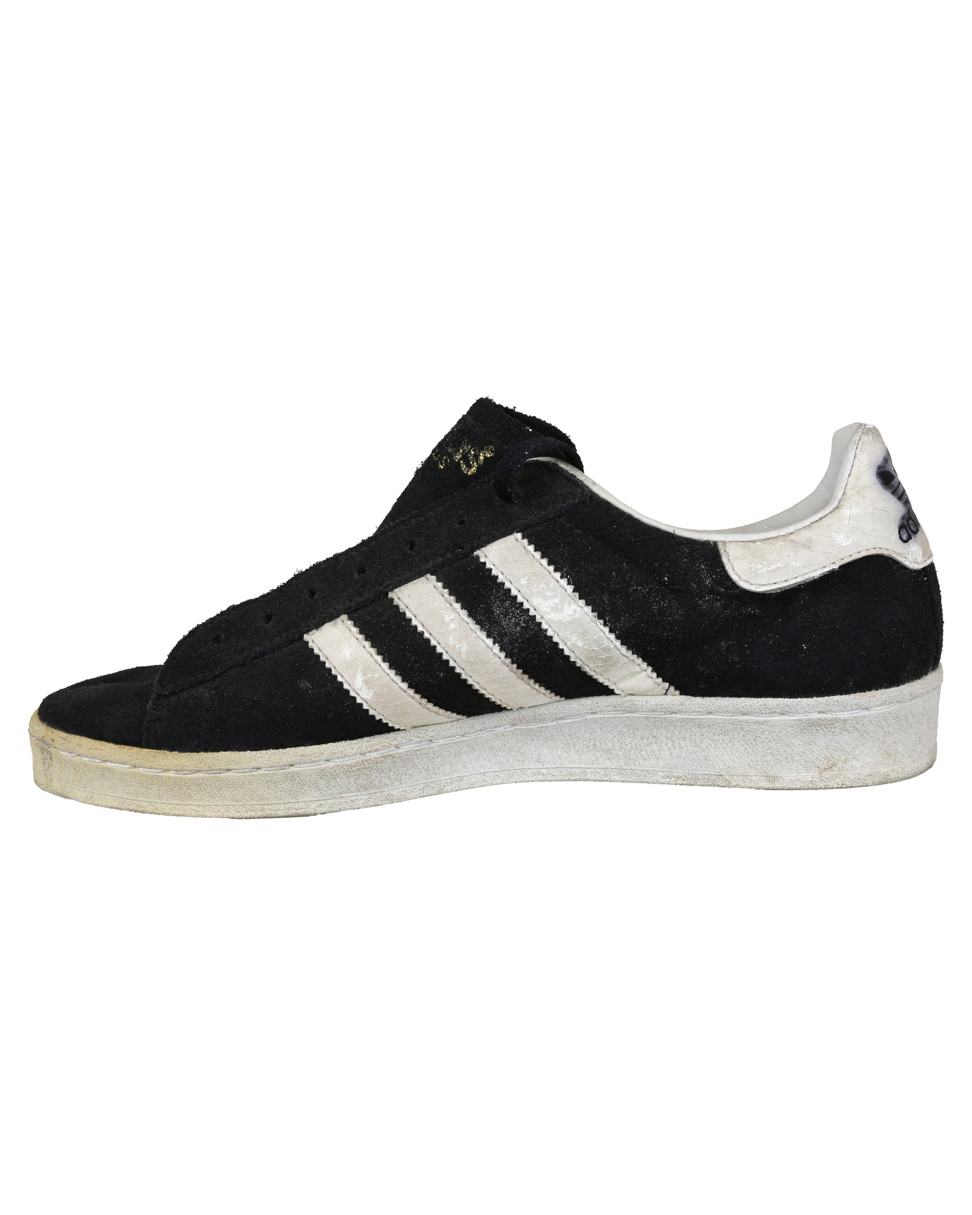 Completing the costume is a pair of Adidas Campus casual sneakers in size 7 1/2, consisting of both the proper right and proper left shoe. Each sneaker features black suede forefoot overlays, a white leather counter, white rubber sole, and three white leather diagonal stripes on each side. Gold “CAMPUS” lettering appears near the heel on the outer sides, with adidas branding present on the tongue labels, heel counters, interior tags, and insoles. Both shoes retain foam pieces attached to the tongues, with one black shoelace partially strung on the proper right shoe and the remaining lace loose inside, while the proper left shoe has no lace attached.