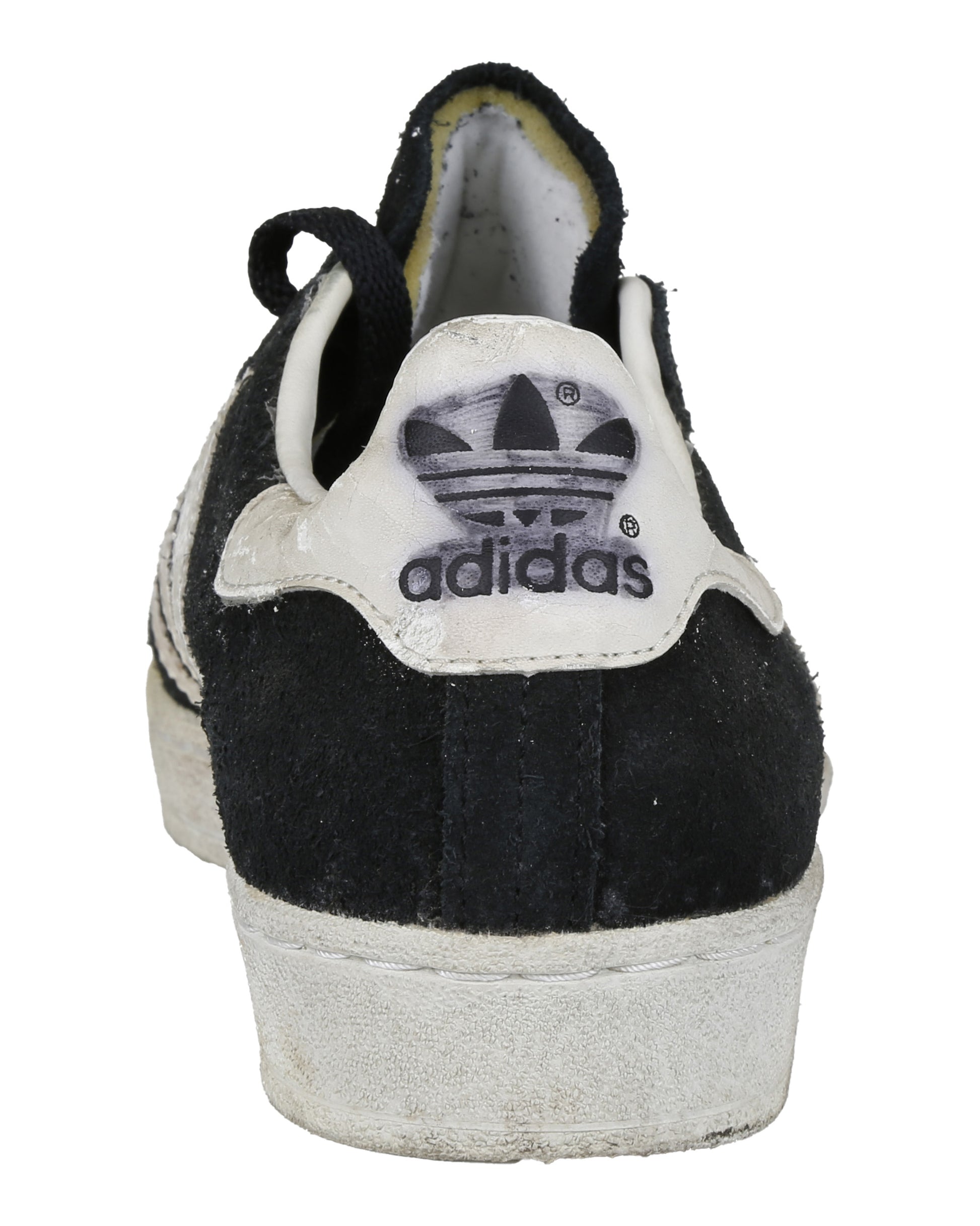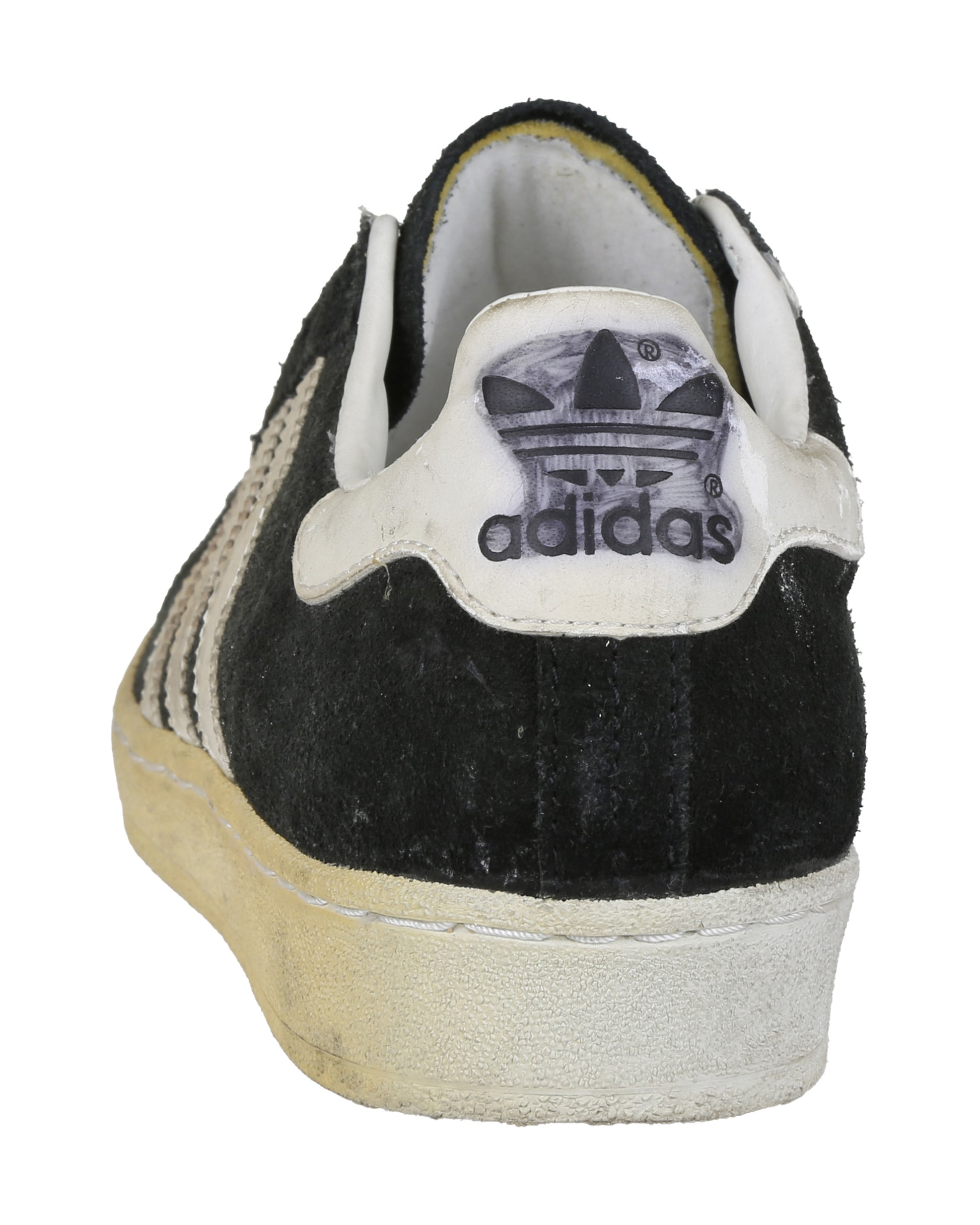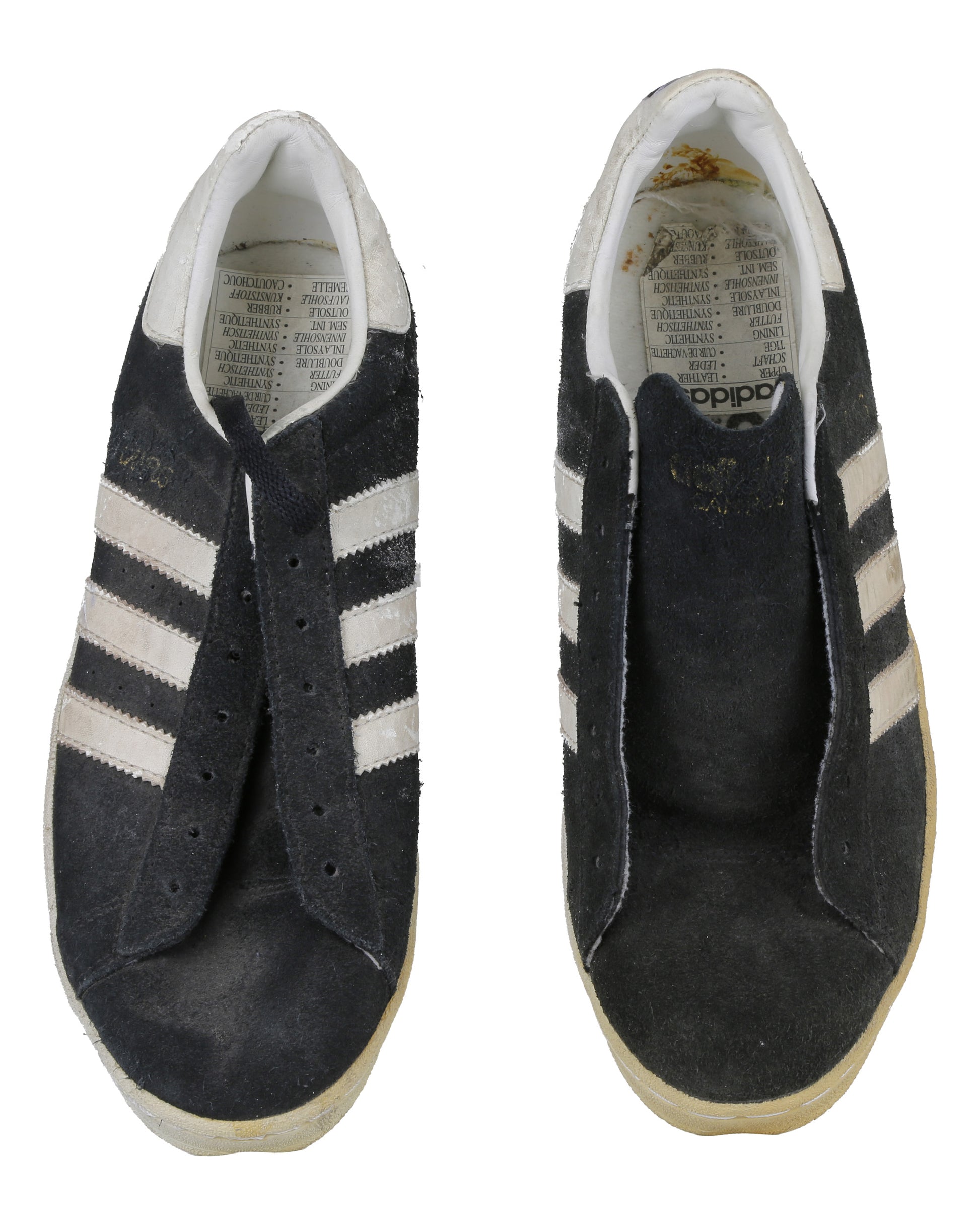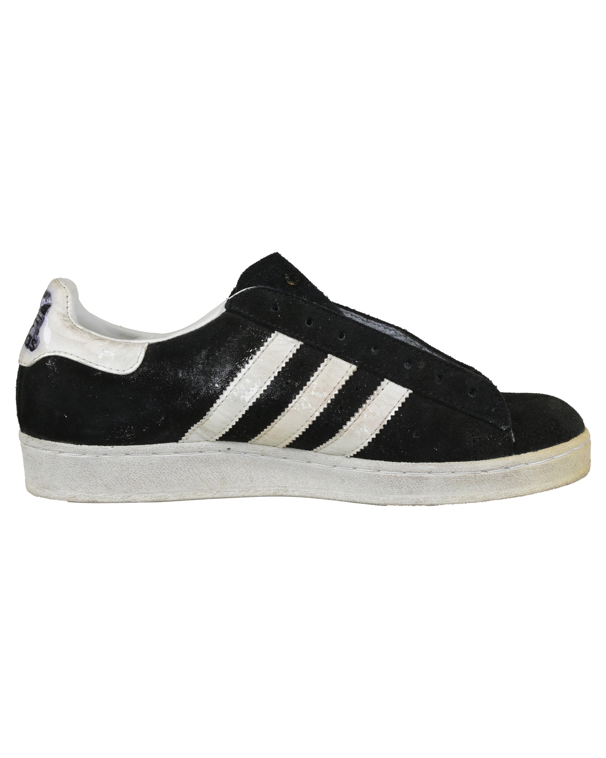 Completing the costume is a pair of Adidas Campus casual sneakers in size 7 1/2, consisting of both the proper right and proper left shoe. Each sneaker features black suede forefoot overlays, a white leather counter, white rubber sole, and three white leather diagonal stripes on each side. Gold “CAMPUS” lettering appears near the heel on the outer sides, with adidas branding present on the tongue labels, heel counters, interior tags, and insoles. Both shoes retain foam pieces attached to the tongues, with one black shoelace partially strung on the proper right shoe and the remaining lace loose inside, while the proper left shoe has no lace attached.