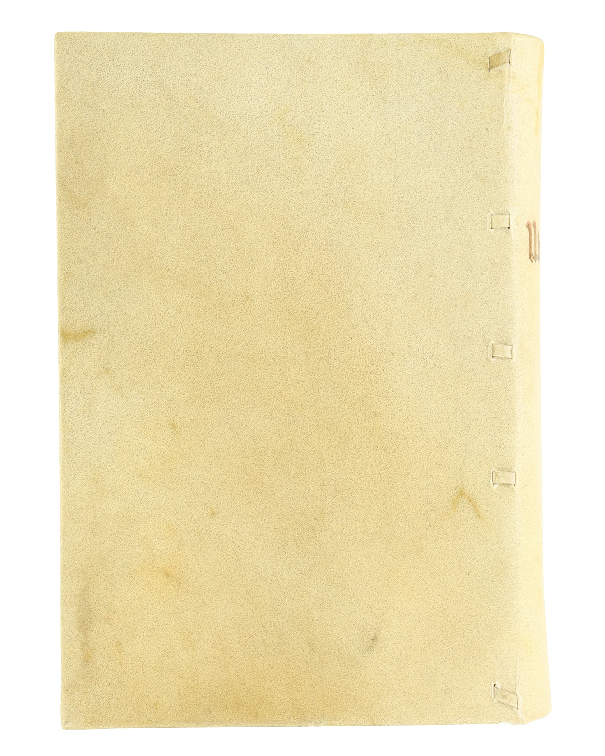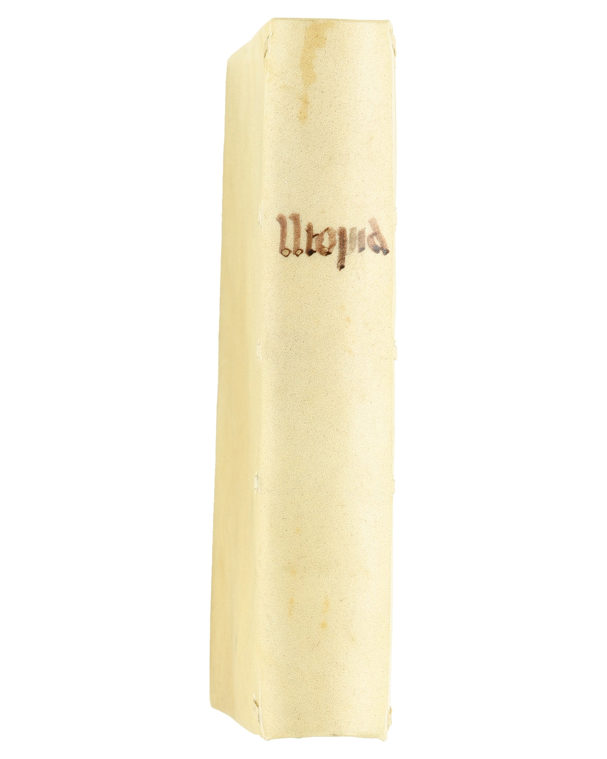 This prop book, representing Thomas More’s Utopia, is white with the title “Utopia” printed in brown on the cover. The interior pages are designed to resemble text printed by an early printing press, consistent with the film’s 16th-century setting. The cover features five raised leather bands as part of its binding, giving it an authentic period appearance.