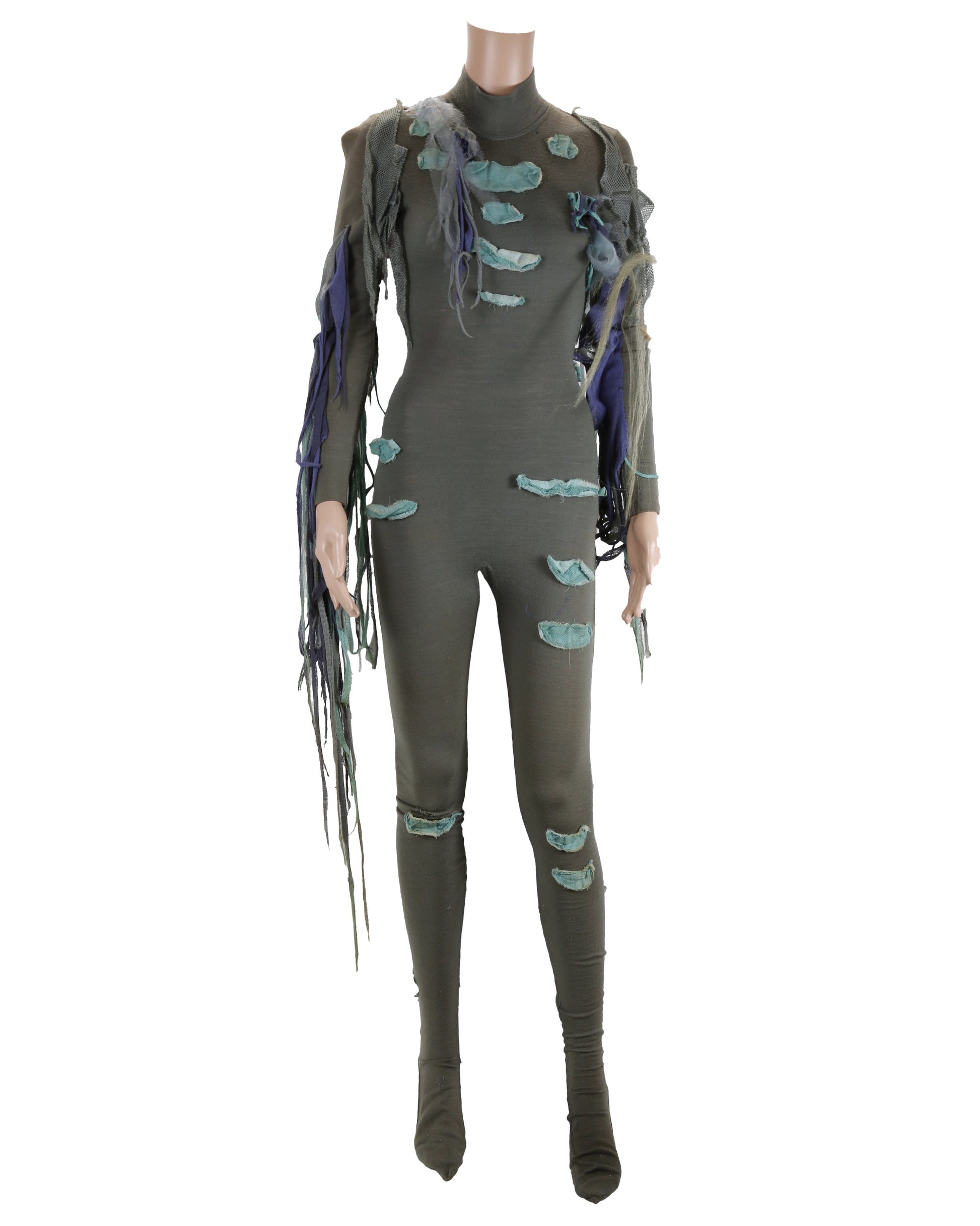 Condition is consistent with age and production use. Small holes are present throughout the legs and feet, with a medium-size hole at the proper right knee. Large holes are visible at the Achilles tendon area on both ankles. The applied mesh exhibits slight discoloration throughout. A piece of faux seaweed is no longer present on the proper right arm. Overall, the costume shows visible wear but remains structurally intact and suitable for display.