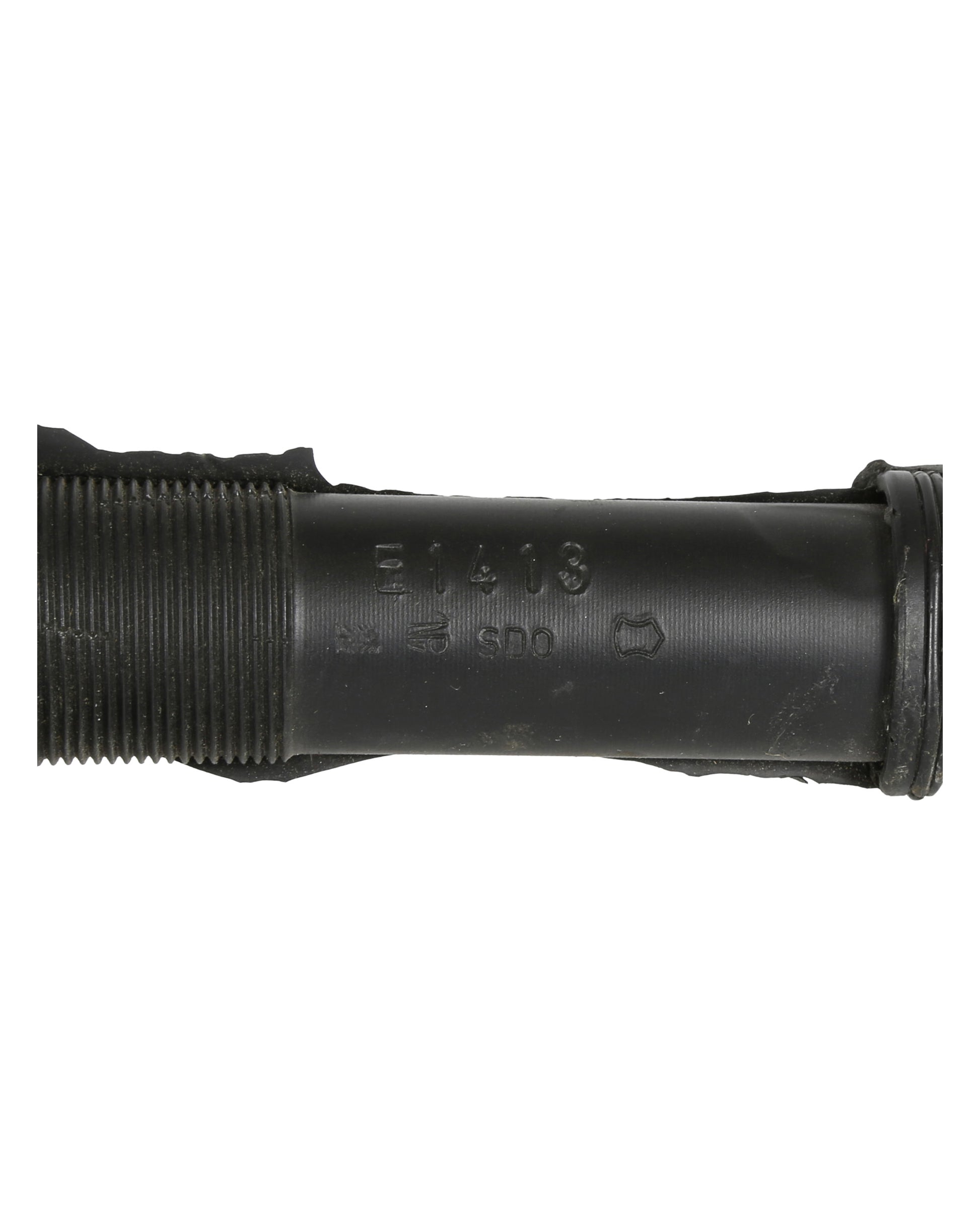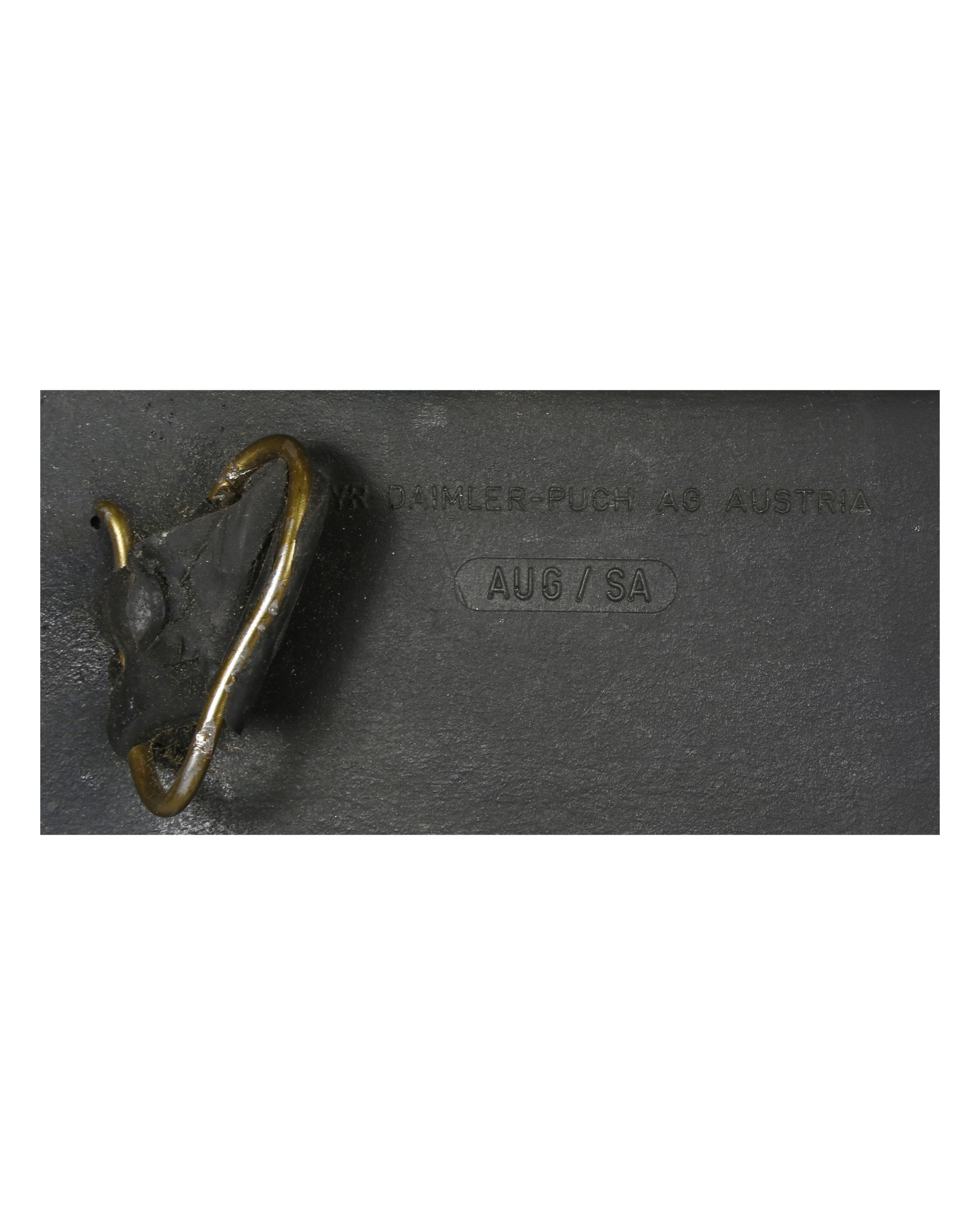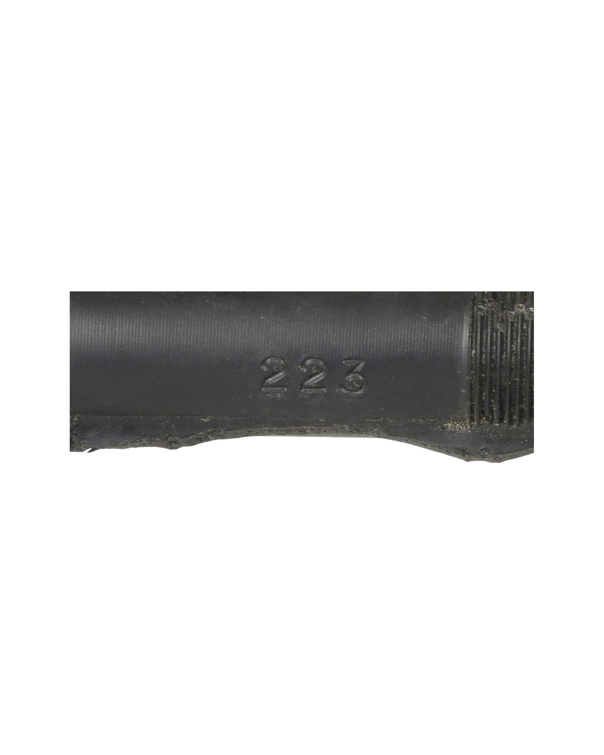 Own a piece of cinematic history with this henchman’s prop rifle from Harley Davidson and the Marlboro Man. This black rubber prop is a detailed replica of a Steyr AUG assault rifle, featuring a faux scope attached to the top of the frame, a long flat butt, high-capacity ammo magazine, and an elongated trigger guard that wraps around to connect to the handle. An additional handle is mounted on the front underside of the frame, and a metal buckle is positioned on the proper right side. The barrel includes a rimmed muzzle with oblong cutouts and detailed inscriptions, including “223” on the proper left side, “STEYR - DAIMLER - AB - AUSTRIA / AUG/SA” and “901SA198” on the proper right side, as well as markings near the ejection port and barrel muzzle, including “E1413” and several other small stamps. Numbers on both sides of the magazine indicate ammo count, reflecting the prop’s authentic design for on-screen use.