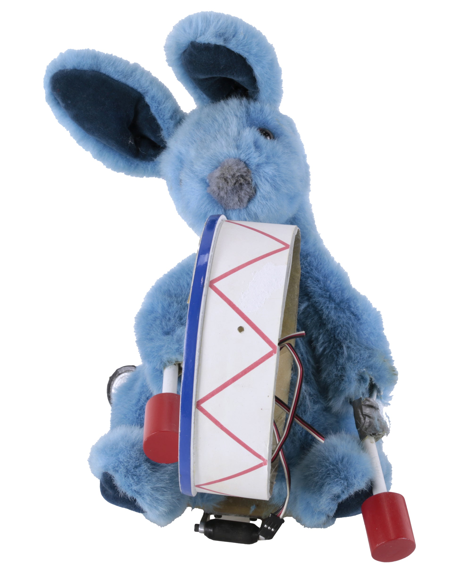 The proper left side of the drum has broken off and is missing. The drumstick and red mallet have fallen off and are detached from the proper left hand. The head is tilted toward the proper right side. The mechanics have not been tested and the piece is being sold as-is. Overall wear is consistent with age and use.