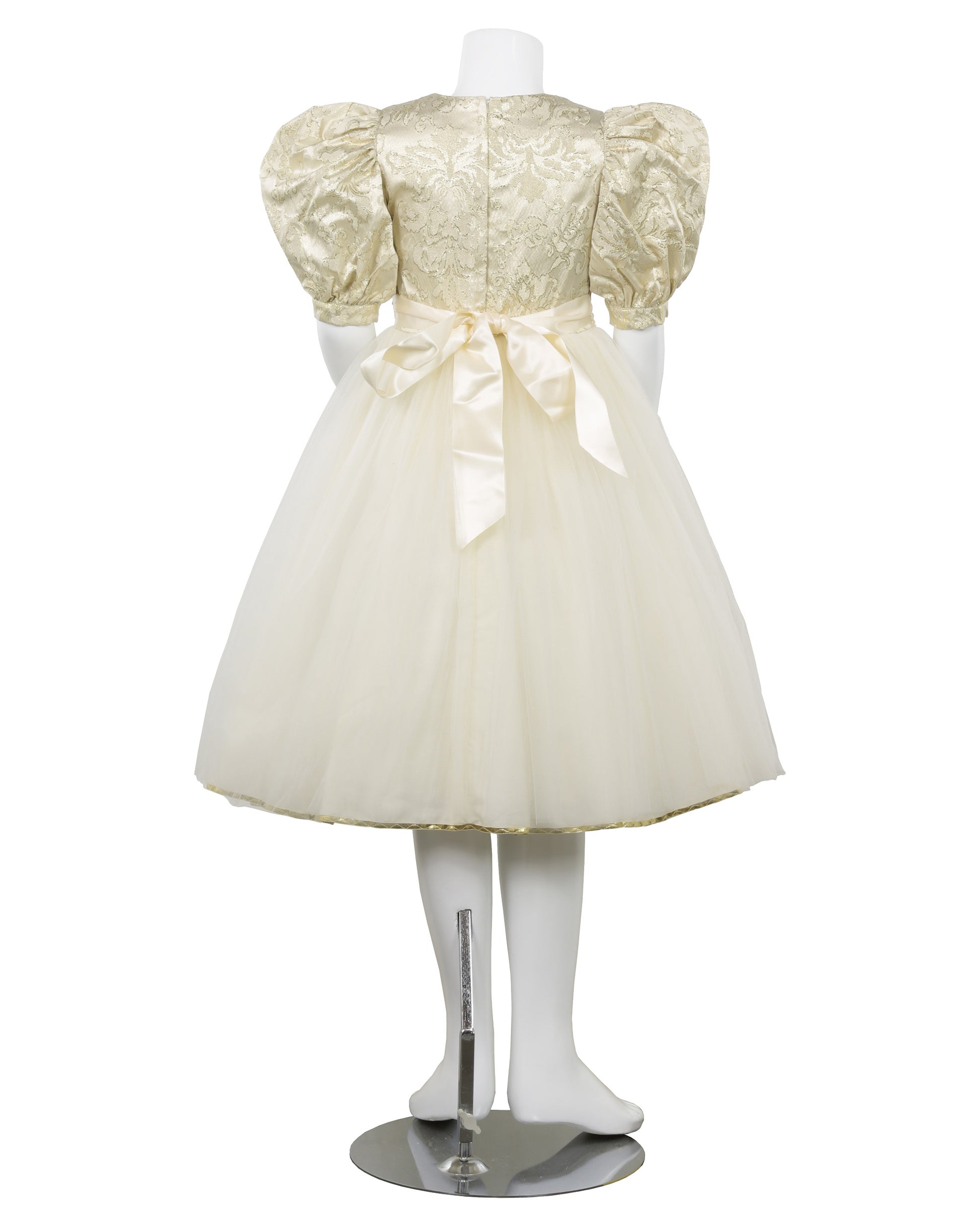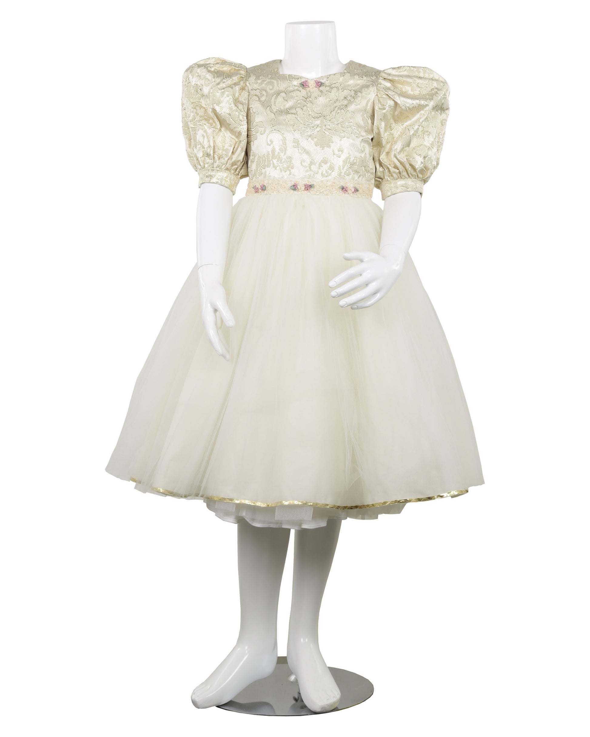 Step into the world of It Takes Two with this enchanting cream and gold dress worn by Ashley Olsen as Alyssa Callaway in the beloved 1995 family film starring Mary-Kate and Ashley Olsen.
