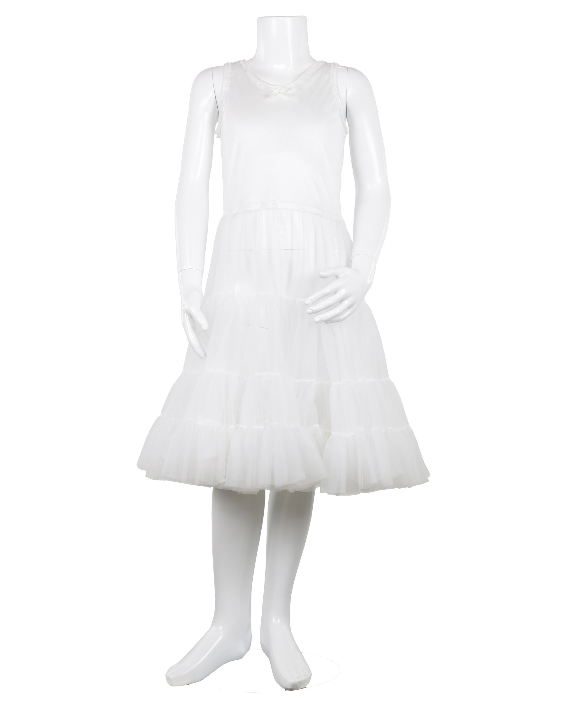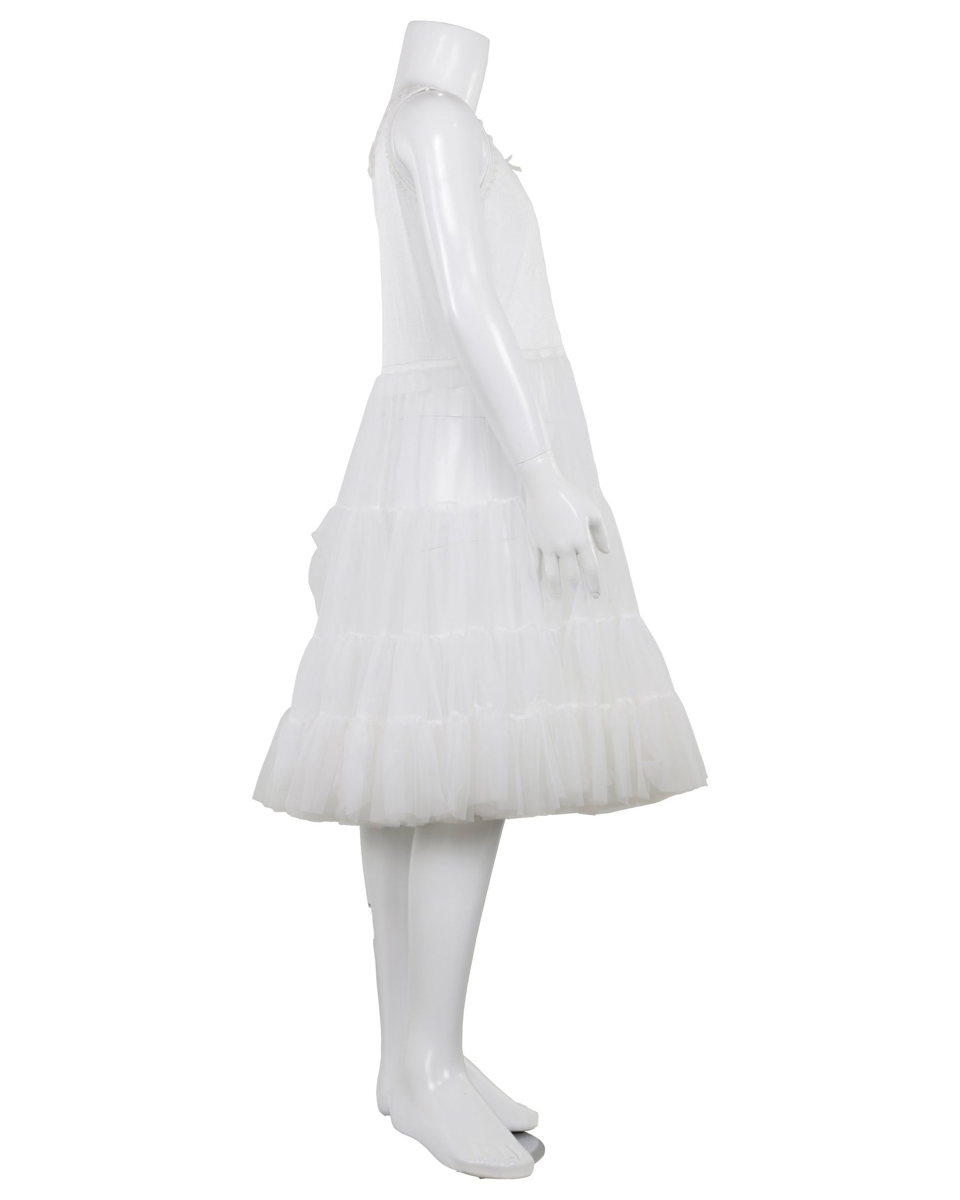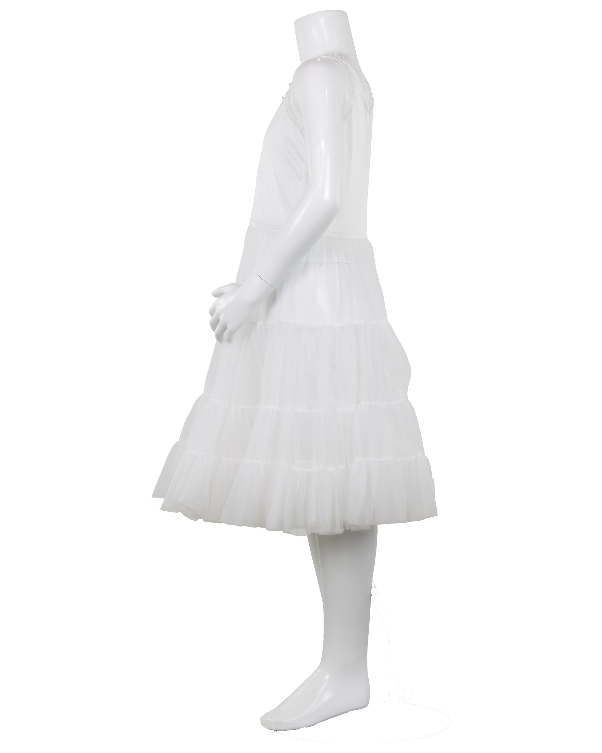 Also included is a matching white nylon slip featuring a white tulle skirt, lace trim neckline, and a small front bow. Both pieces are tagged Storybook Heirlooms, Size 7.