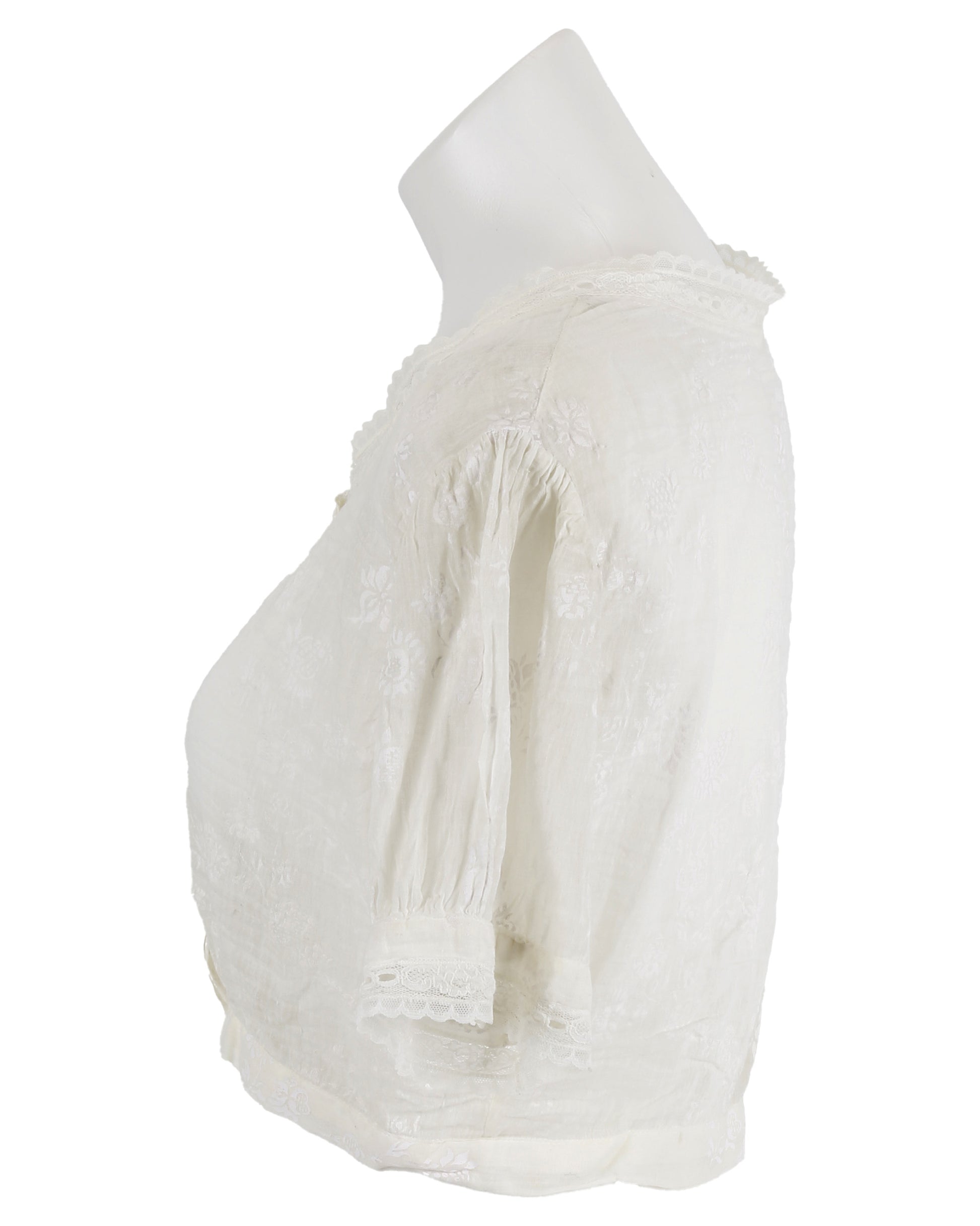 The costume consists of a black-and-white sleeveless pinafore–style dress featuring two functional side pockets. The reverse of the dress includes snap closures along with hook-and-eye fastenings throughout, allowing for a secure and adjustable fit. Paired with the dress is a white cotton short-sleeve shirt with a front button-down closure. The shirt features a delicate white floral print across the fabric, with the edges of the neckline and sleeves trimmed in white lace, adding subtle period detail.