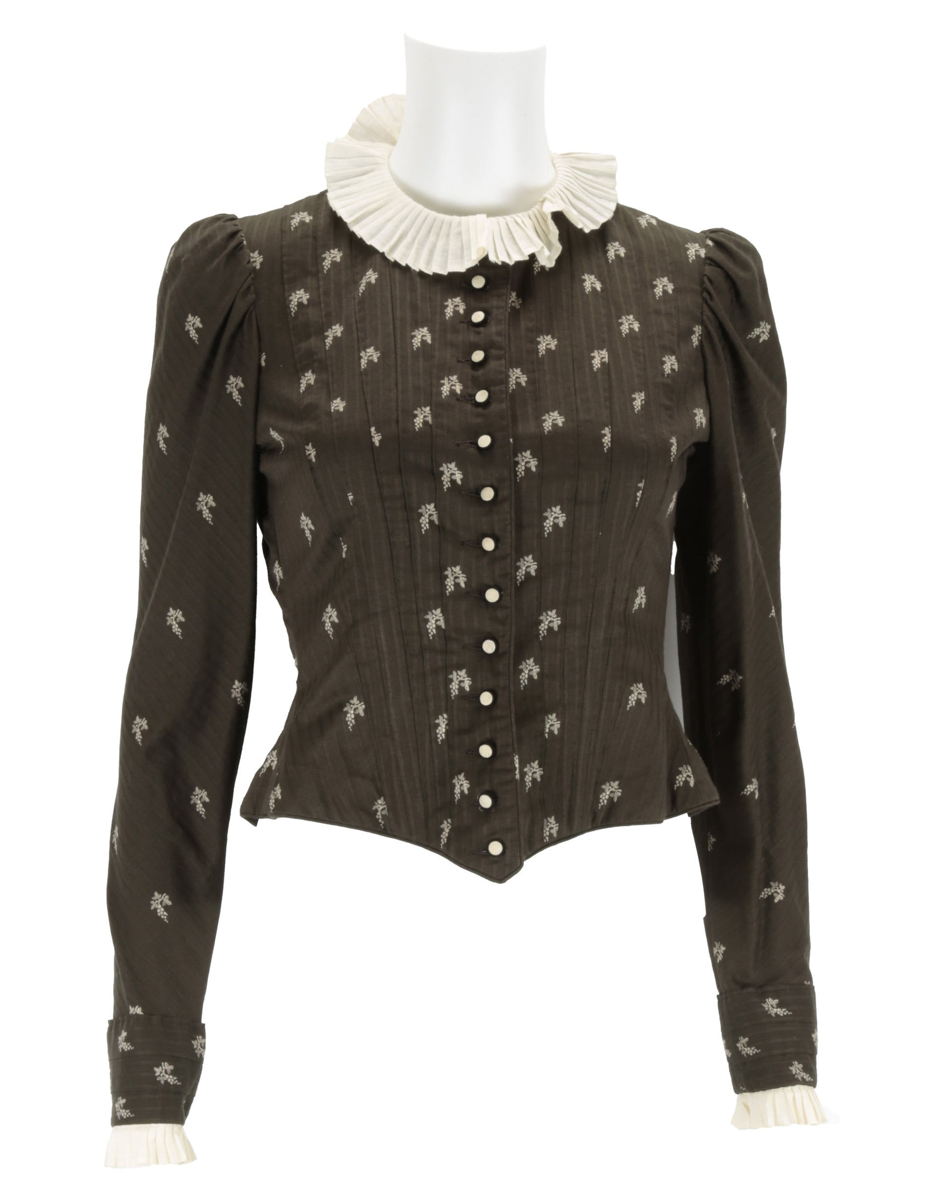 The costume consists of a long brown, long-sleeved shirt featuring a delicate cream print of grape bunches and leaves. The obverse center button closure uses cream and black fabric-covered buttons, while the cuffs and collar are trimmed with white ruffles. The shirt is corseted on the interior, providing structured tailoring as seen on screen, and bears the Angels & Bermans interior tag.
