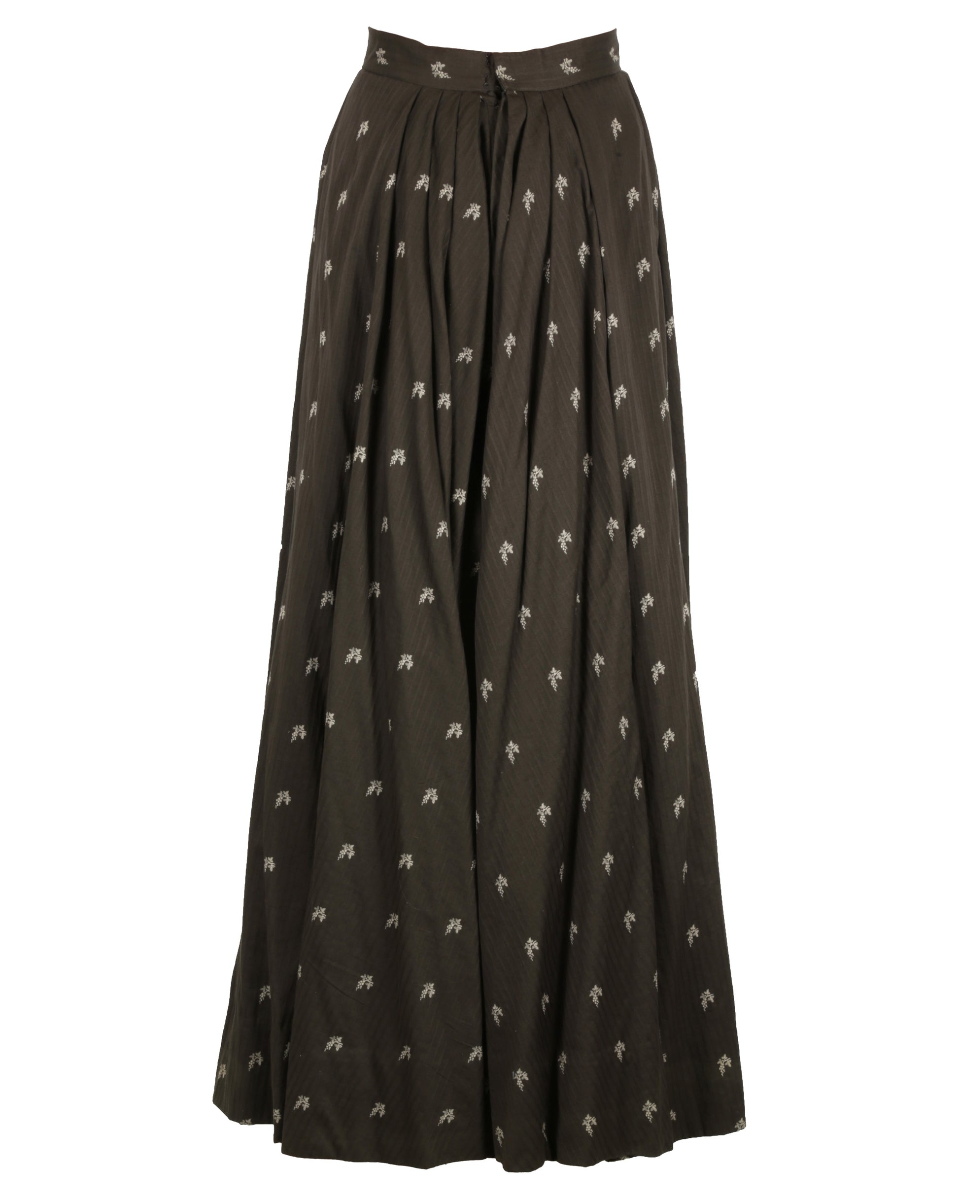The matching long brown skirt mirrors the cream grape-and-leaf print and features a reverse center snap, button, and hook-and-eye clasp closure for a seamless fit. The skirt also retains the Angels & Bermans interior label, confirming its provenance.