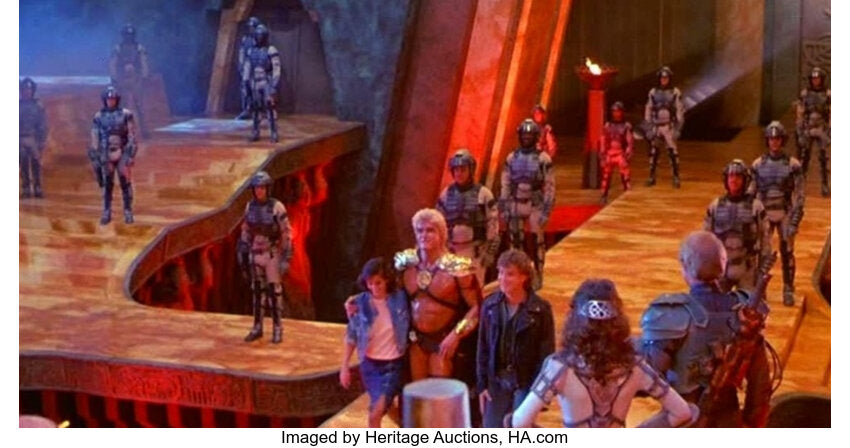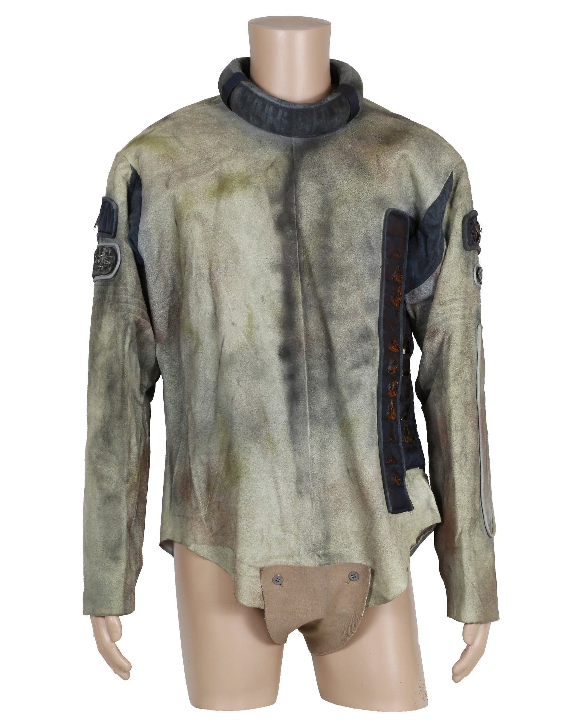 Offered here is a set of two Eternian Soldier shirts from the 1987 live-action film Masters of the Universe, produced by Mattel and Cannon Group. These distinctive costumes were crafted by Western Costume Co., one of Hollywood’s most iconic wardrobe suppliers, and exemplify the high-quality leatherwork and vibrant color palette of the film’s fantastical universe.