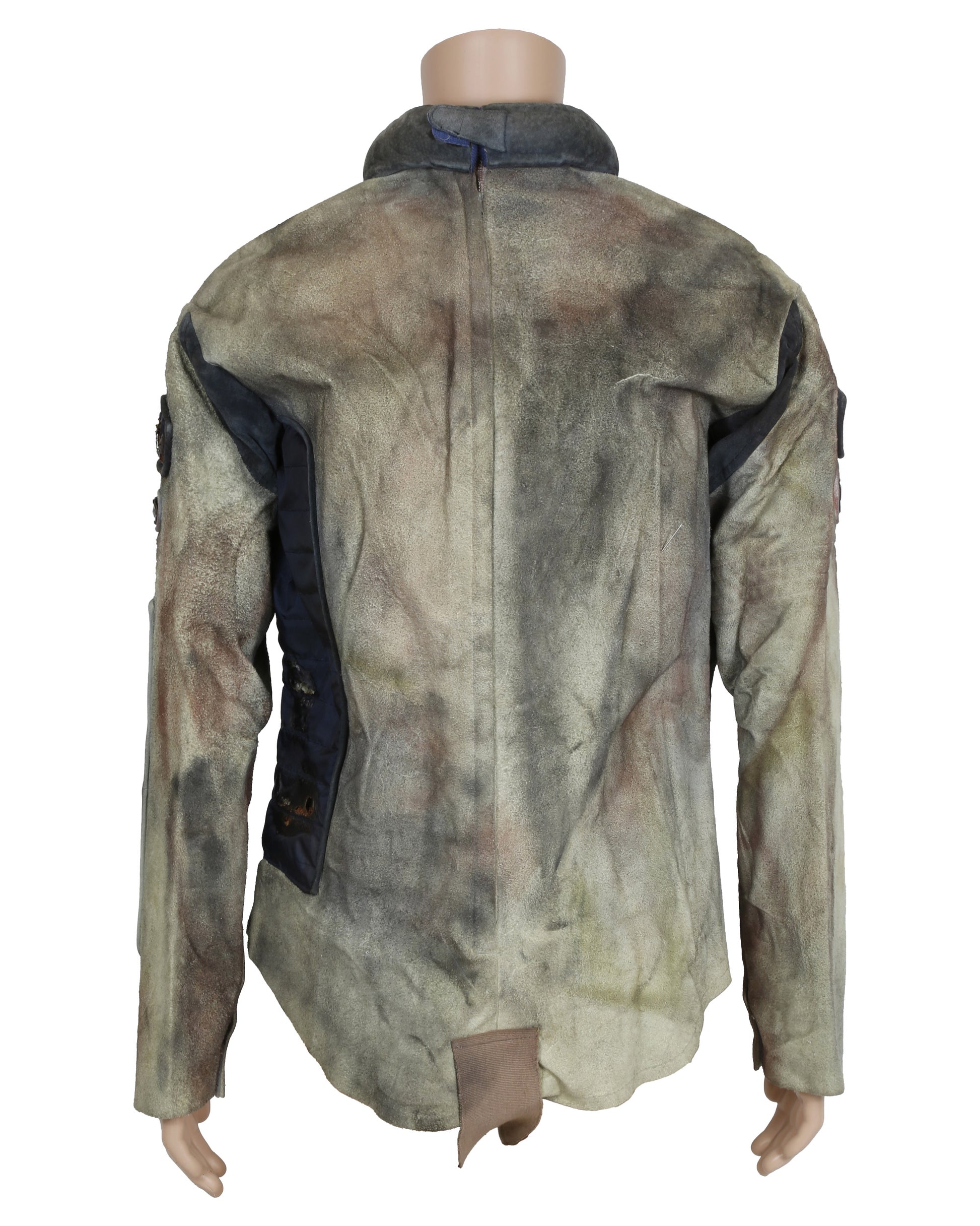 Both Eternian Soldier shirts appear to be intentionally distressed, with spots of discoloration throughout consistent with the on-screen design. Several holes in the blue padding appear to be intentional, though the padding material is flaking in areas. One shirt has a broken zipper at the reverse closure. Overall, the shirts retain their studio-crafted appearance and reflect the authentic production design from Masters of the Universe (1987).