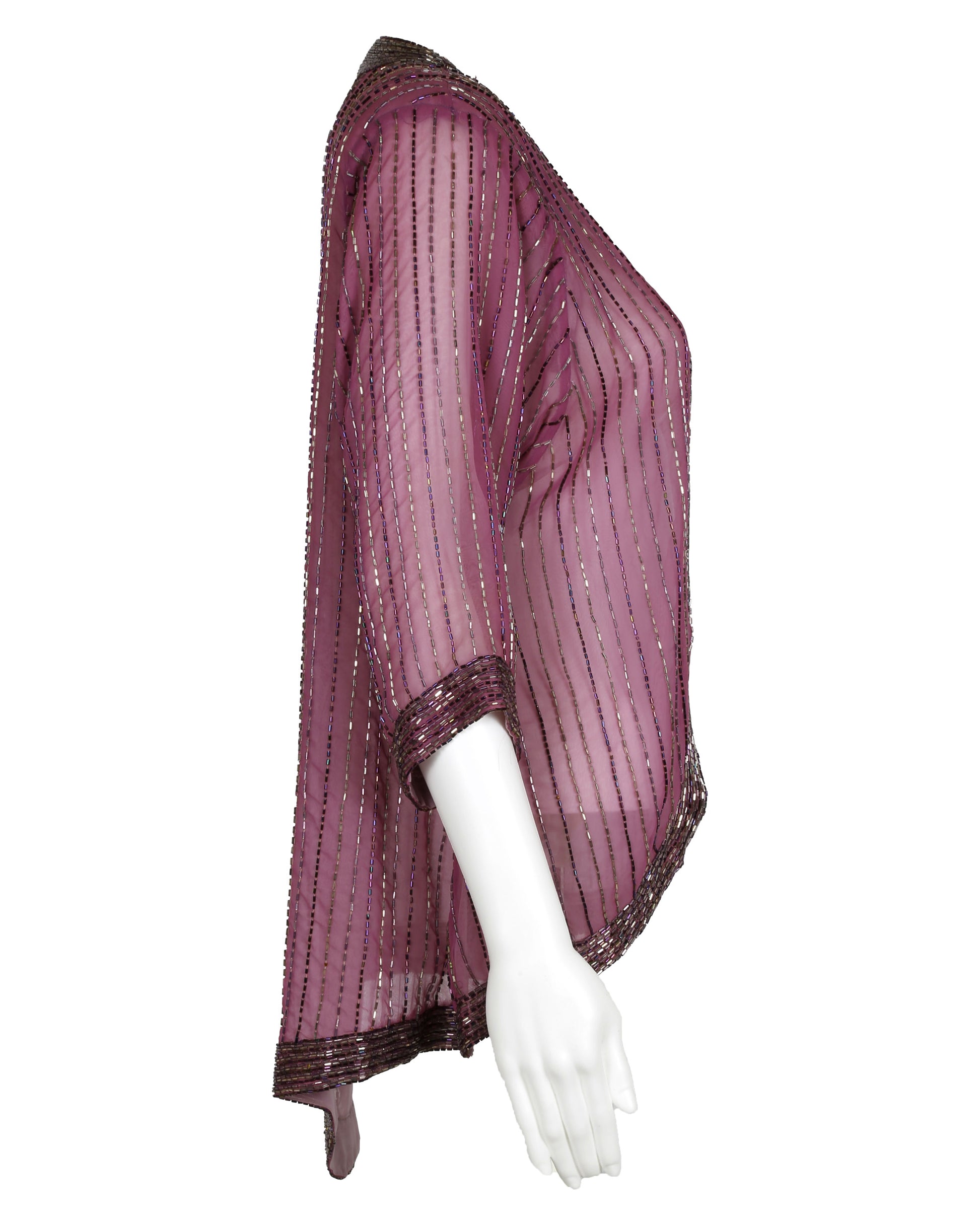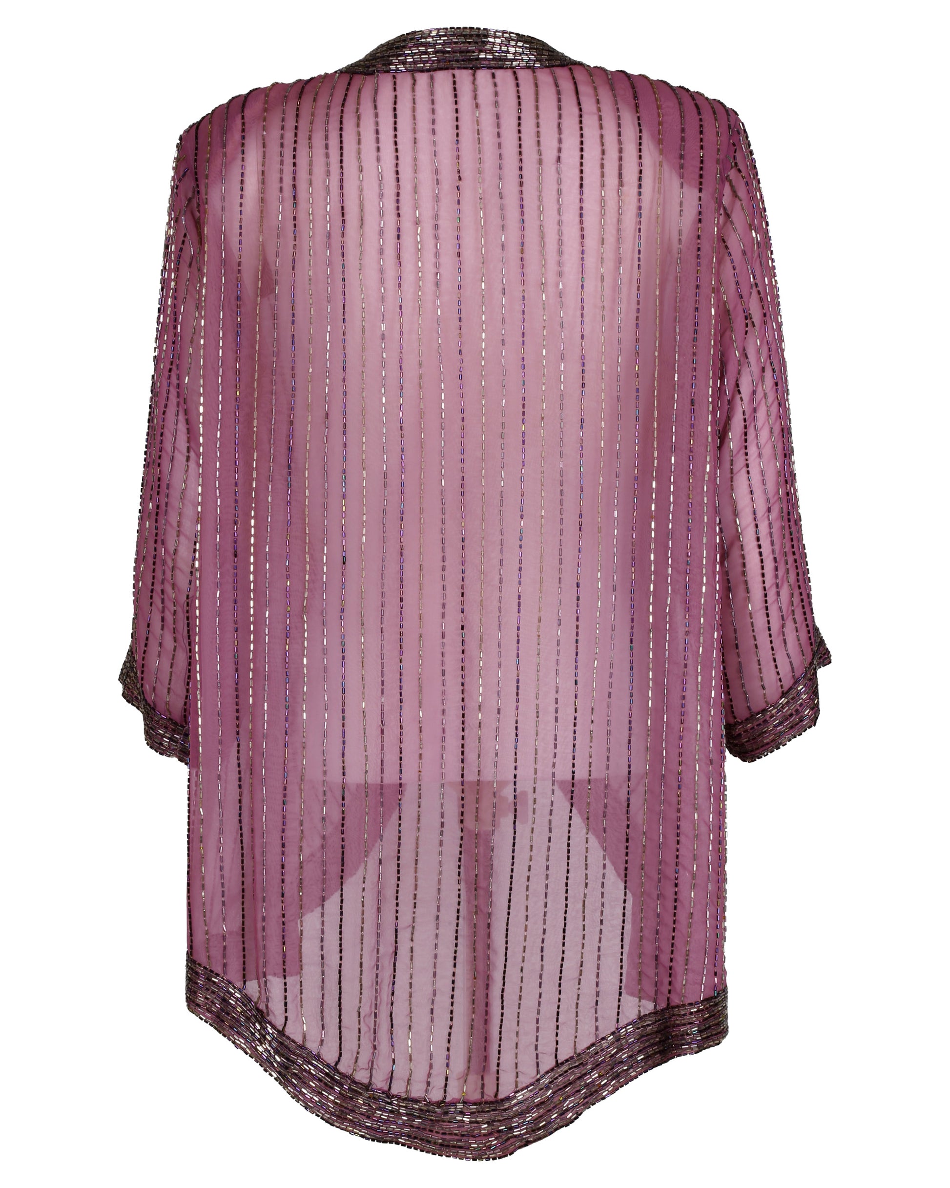 This light pink-purple nylon organza jacket features three-quarter sleeves and is richly embellished with purple and silver bugle beadwork, arranged in dense horizontal and vertical lines for a dramatic stage sparkle. The edges of the sleeves, collar, center seam, and bottom hem are finished with an impressive 1.375” bead trim, giving the jacket both weight and presence under concert lights.