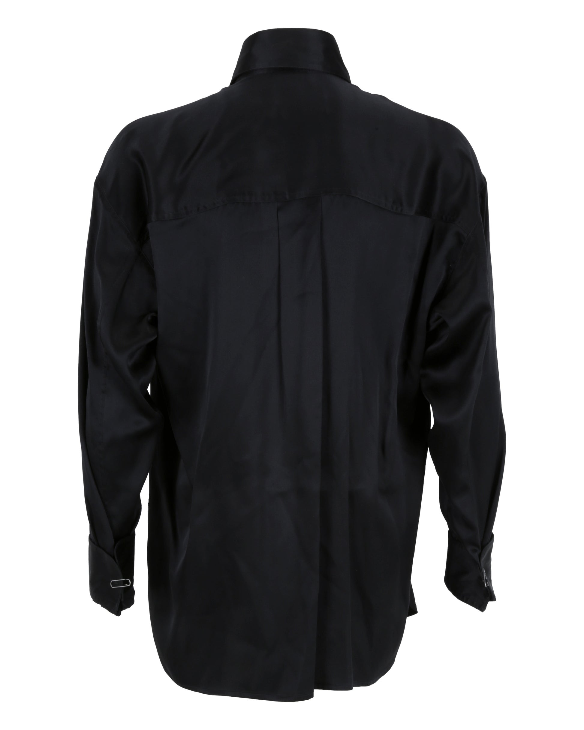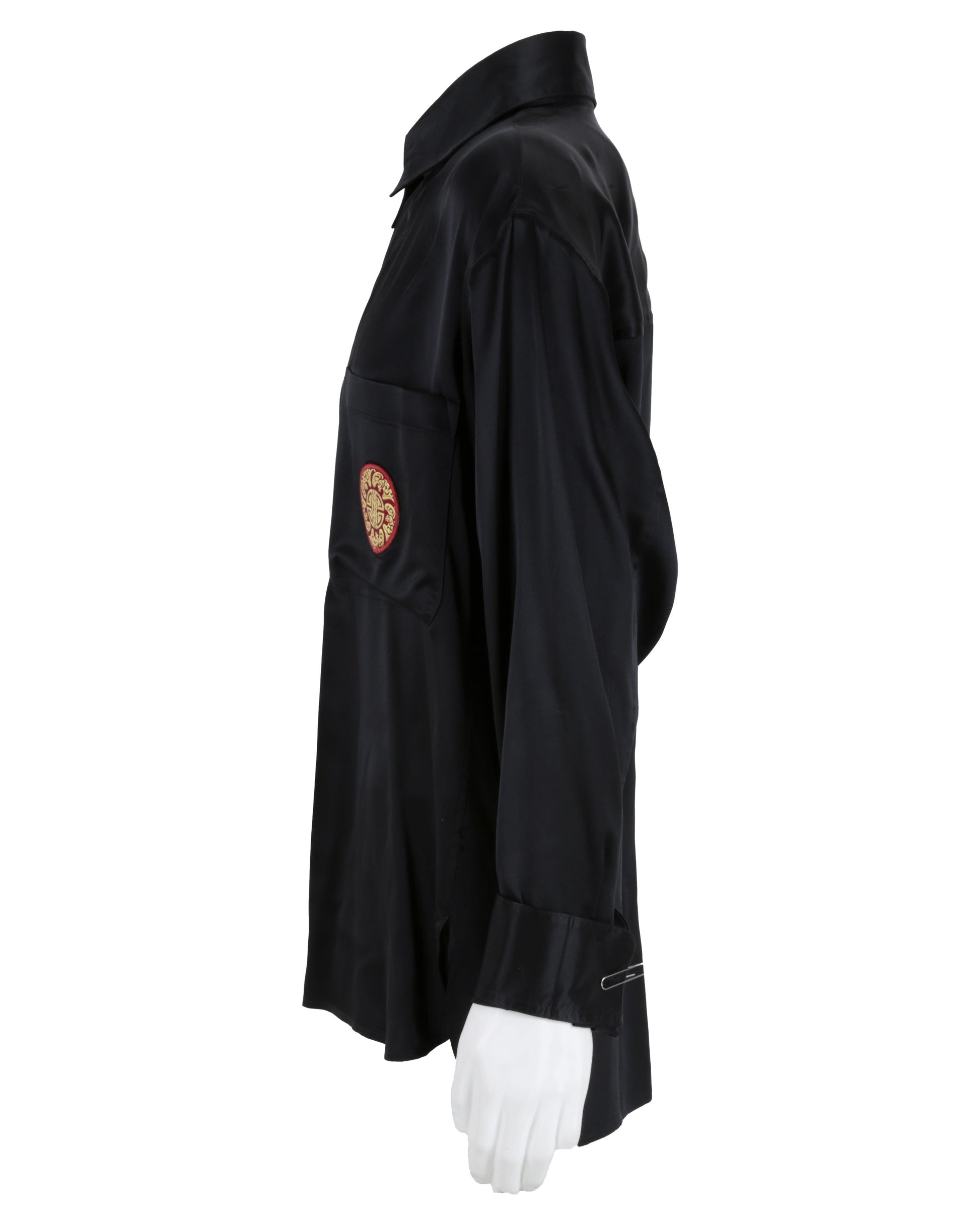 Accompanying the vest is a black silk shirt by Brian McKinney with a button front closure and a chest pocket on the proper left side. The pocket is accented with a round red patch displaying a gold Chinese-style embroidered image that complements the vest’s design. Together, these pieces form a cohesive and visually impactful ensemble associated with Montel Williams’ appearance at a major televised comedy event.