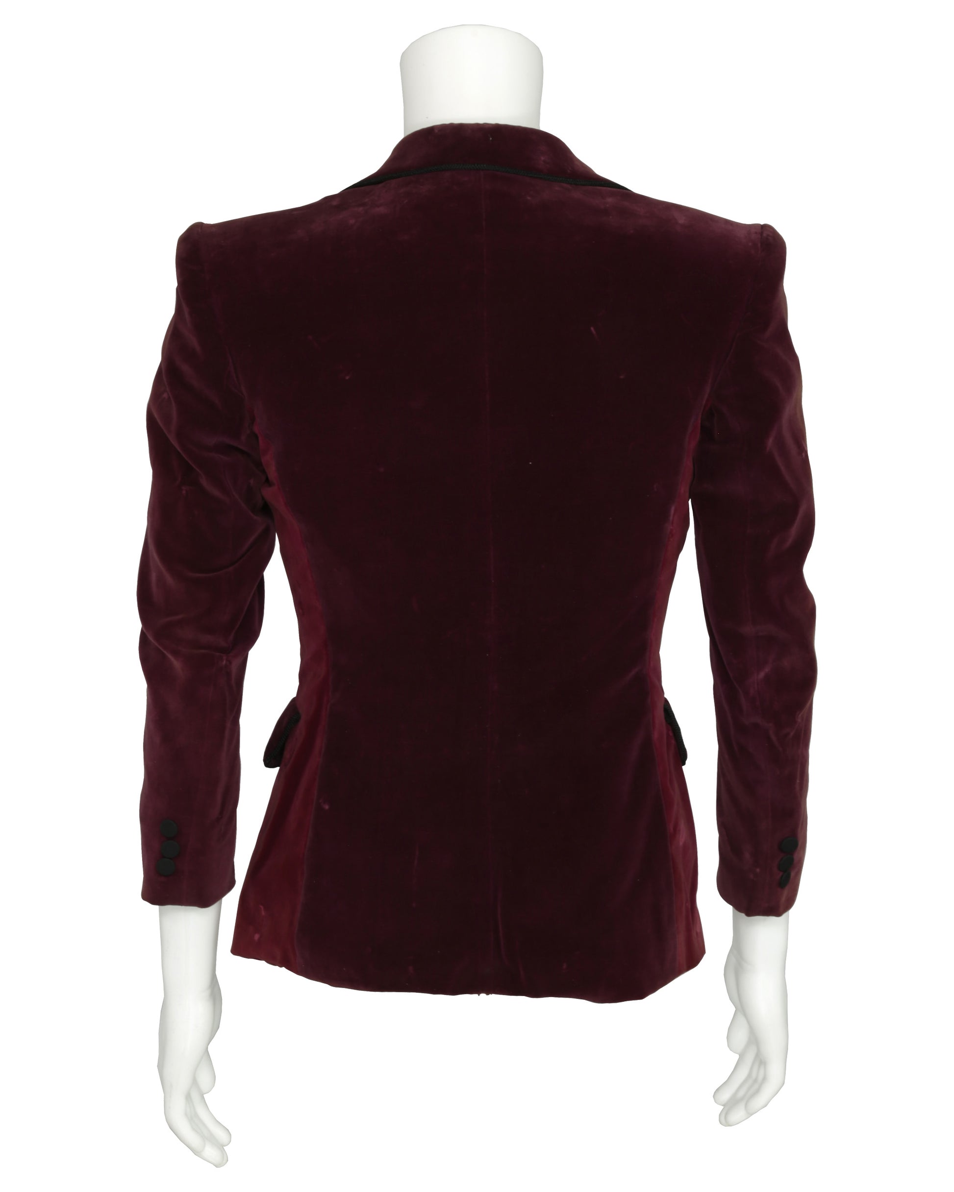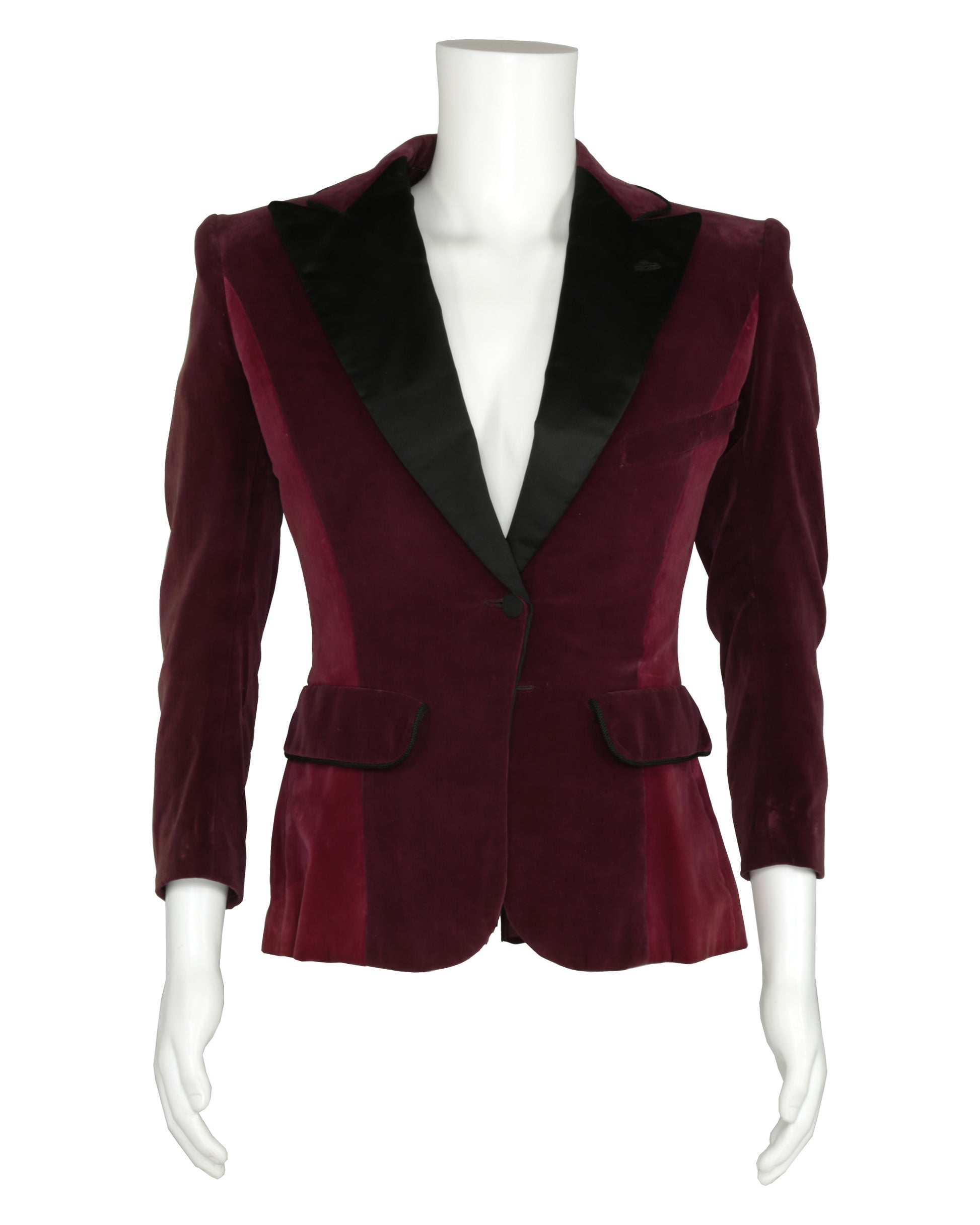Offered here is the burgundy velvet stage jacket worn by Vivian Blaine as Sally Templeton in the classic 20th Century Fox musical “Nob Hill” (1945). This elegant jacket is crafted in rich burgundy velvet and features black satin peaked lapels, a single-button front closure, a proper-left chest pocket, and two side pockets with flap closures.