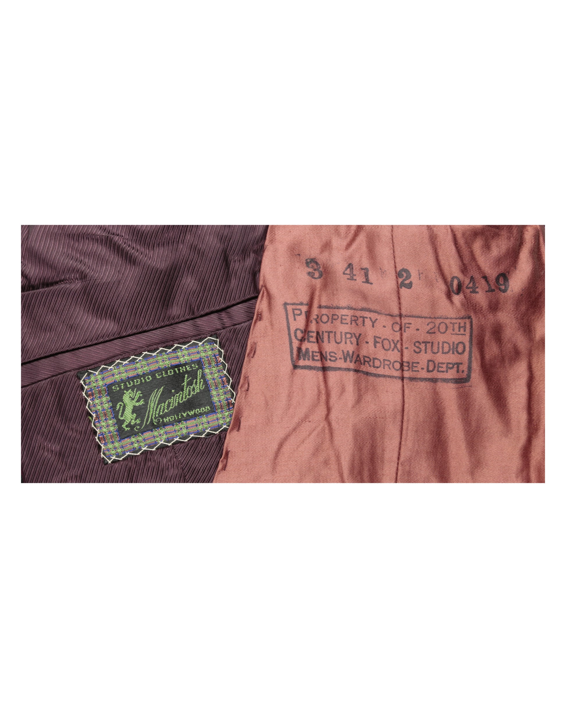 Additional 20th Century Fox wardrobe department stamp marks appear near the proper-right sleeve, reading: “3 41 2 0419 / PROPERTY OF 20TH / CENTURY STUDIO / MENS WARDROBE DEPT.”