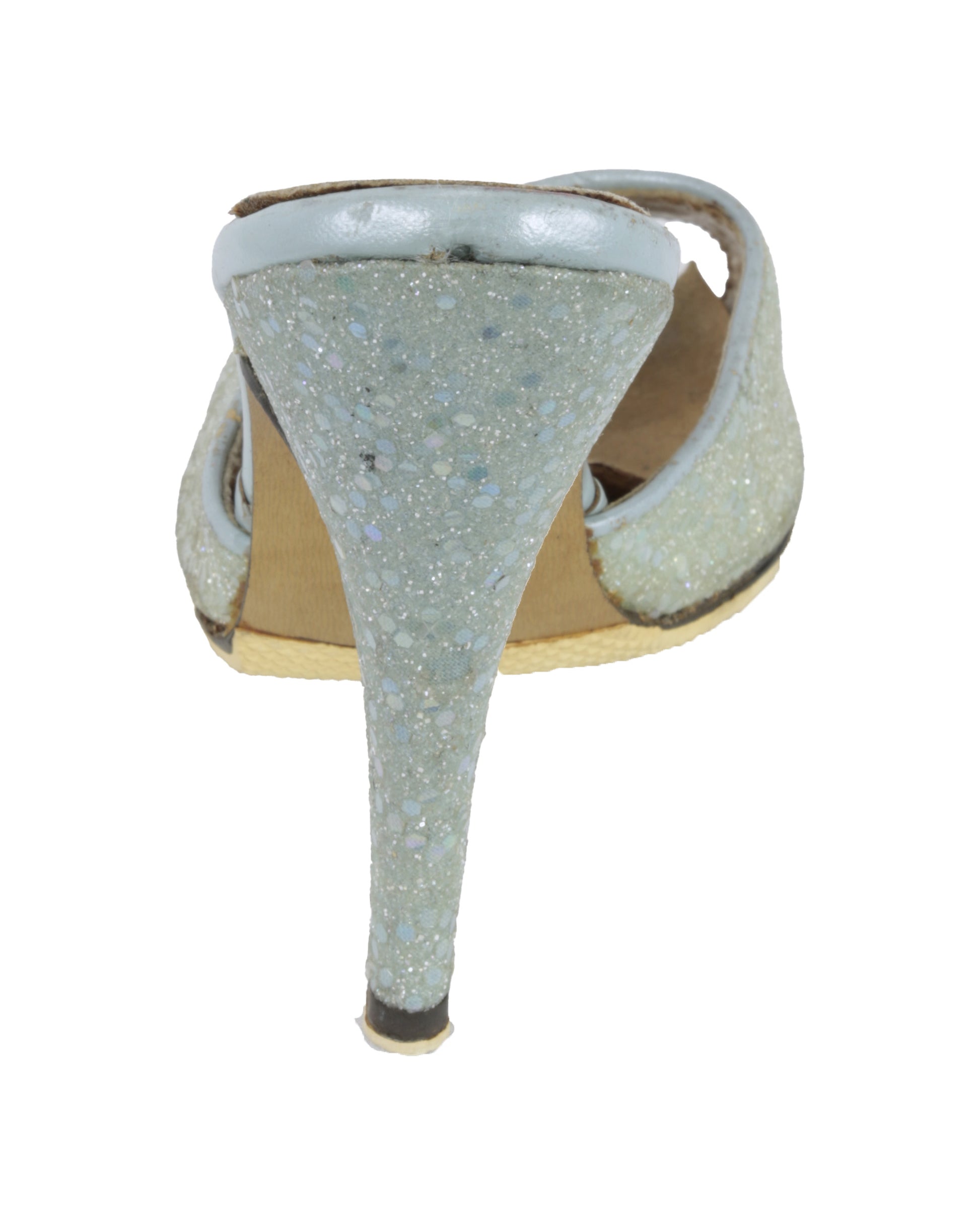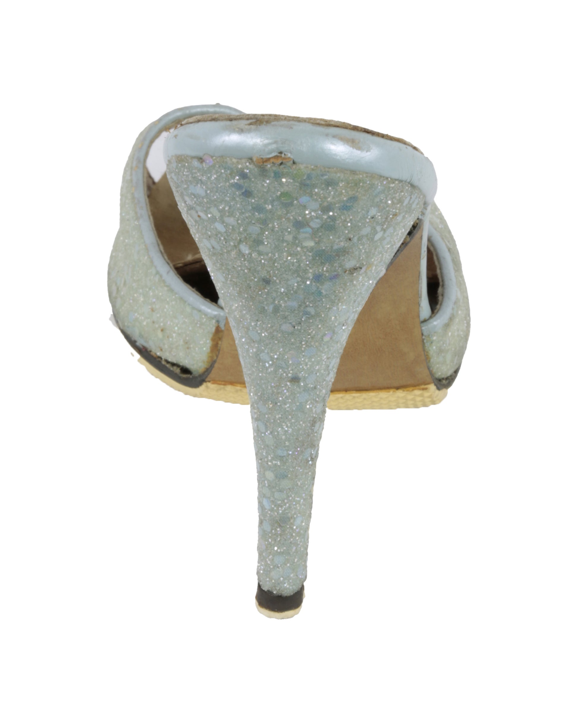 The proper right shoe shows yellowing to the sequins, a worn and lifting insole, slight misshaping to the top of the shoe, and black accretions on the sole at the ball of the foot. The proper left shoe shows yellowing to the sequins, a worn and lifting insole, and slight misshaping to the top of the shoe.