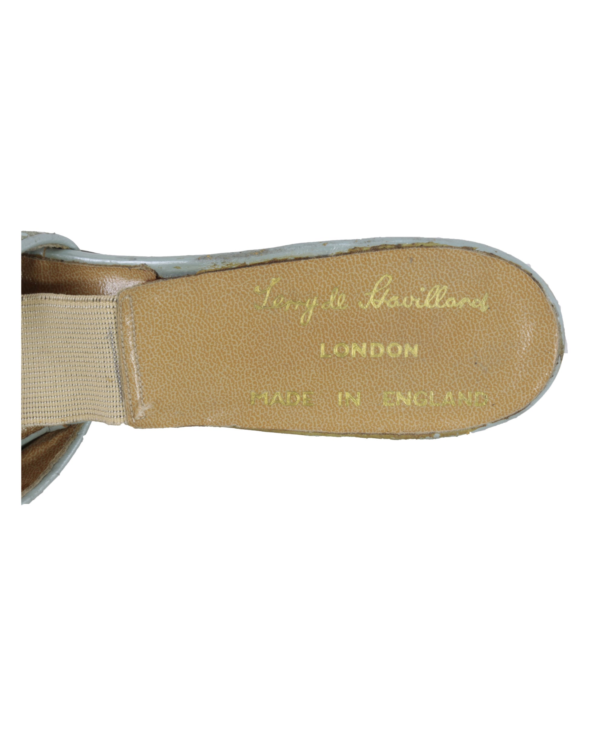 The instep of each shoe is marked “Terry de Havilland / LONDON / MADE IN ENGLAND,” underscoring their English craftsmanship and vintage designer pedigree. The shoes are finished with white soles that provide a striking contrast to the sequined uppers.