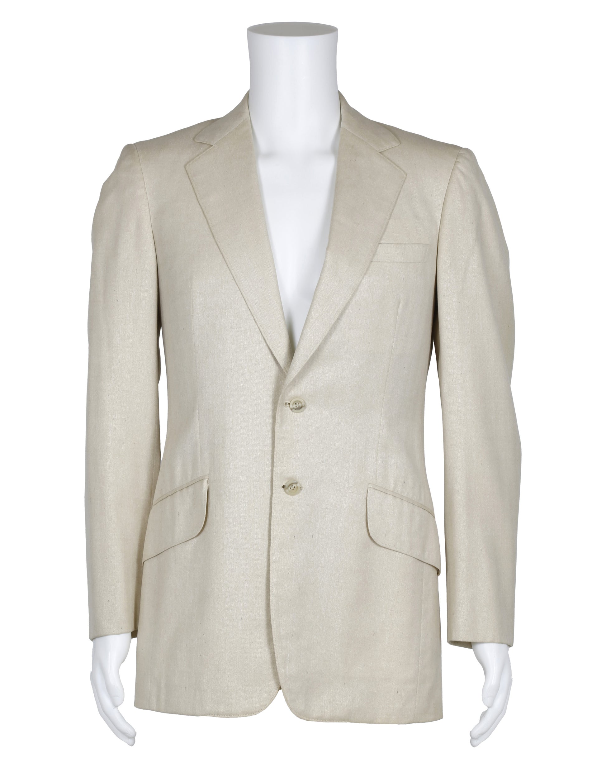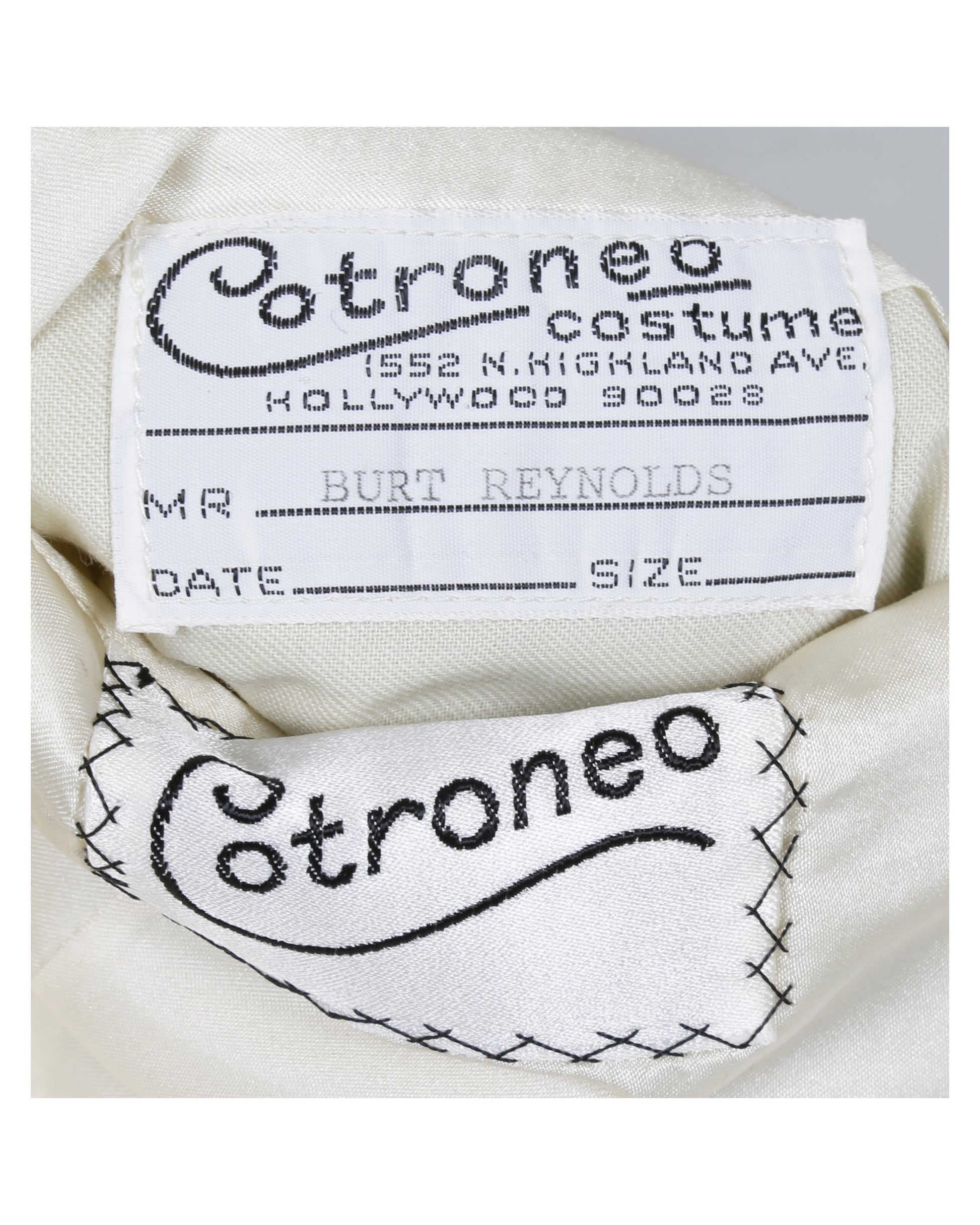 This off-white sports coat features a classic notched lapel, two-button front closure, a proper left breast pocket, and two side flap pockets, capturing the sophisticated yet casual style that defined Reynolds’ on-screen wardrobe during the early 1980s. Inside, a label sewn below the proper right breast pocket reads “Cotroneo”, the noted Hollywood tailor responsible for countless film and television costumes. An additional interior tag sewn into the proper right breast pocket reads: