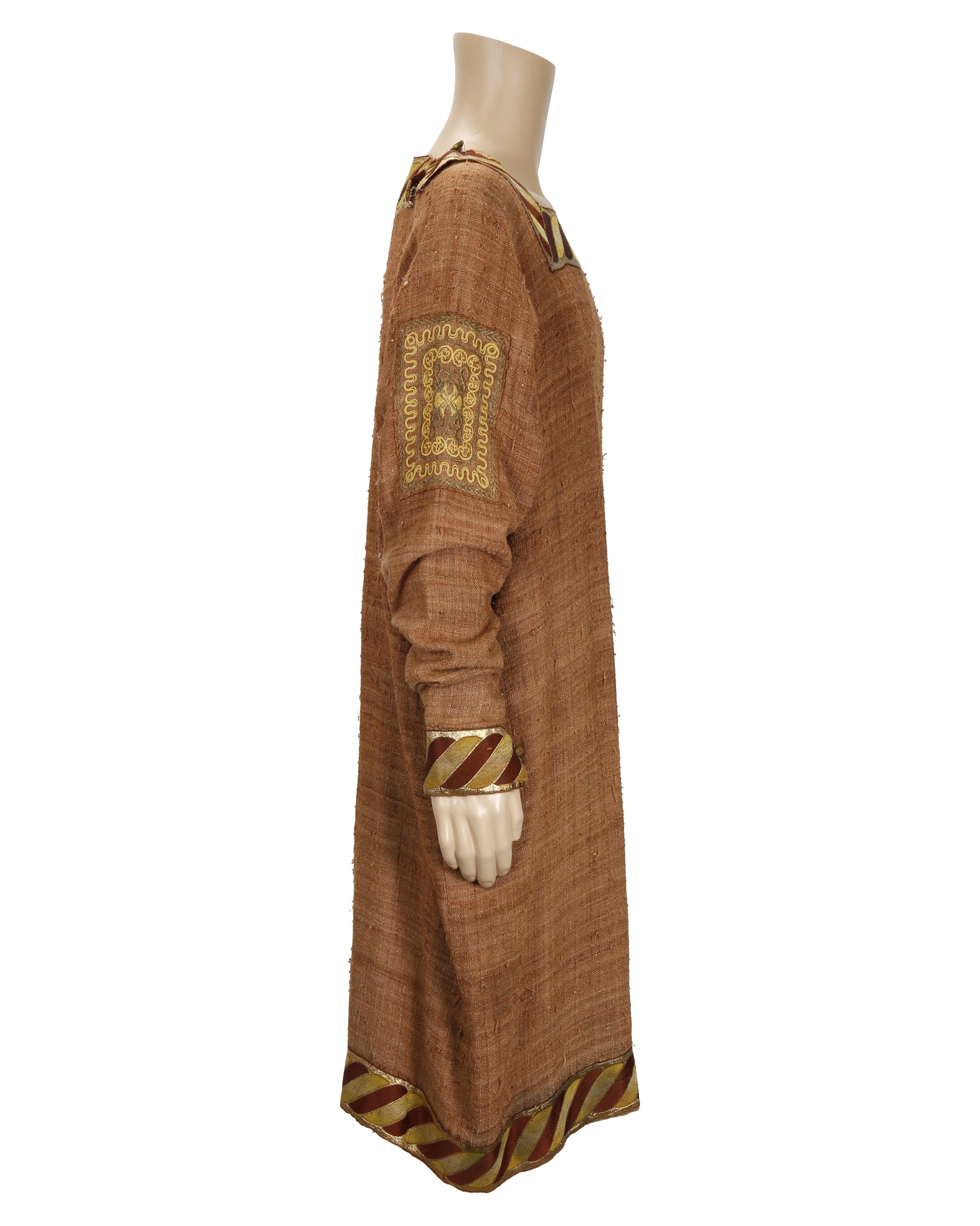 Offered here is an elegant copper-colored linen tunic worn by Franco Nero in the 1972 historical drama Pope Joan, a film exploring the legendary tale of a woman who disguised herself as a man to ascend the papal throne. Designed and crafted by the renowned London costume house M. Berman Ltd., this striking garment exemplifies the rich period styling characteristic of early 1970s European cinema.