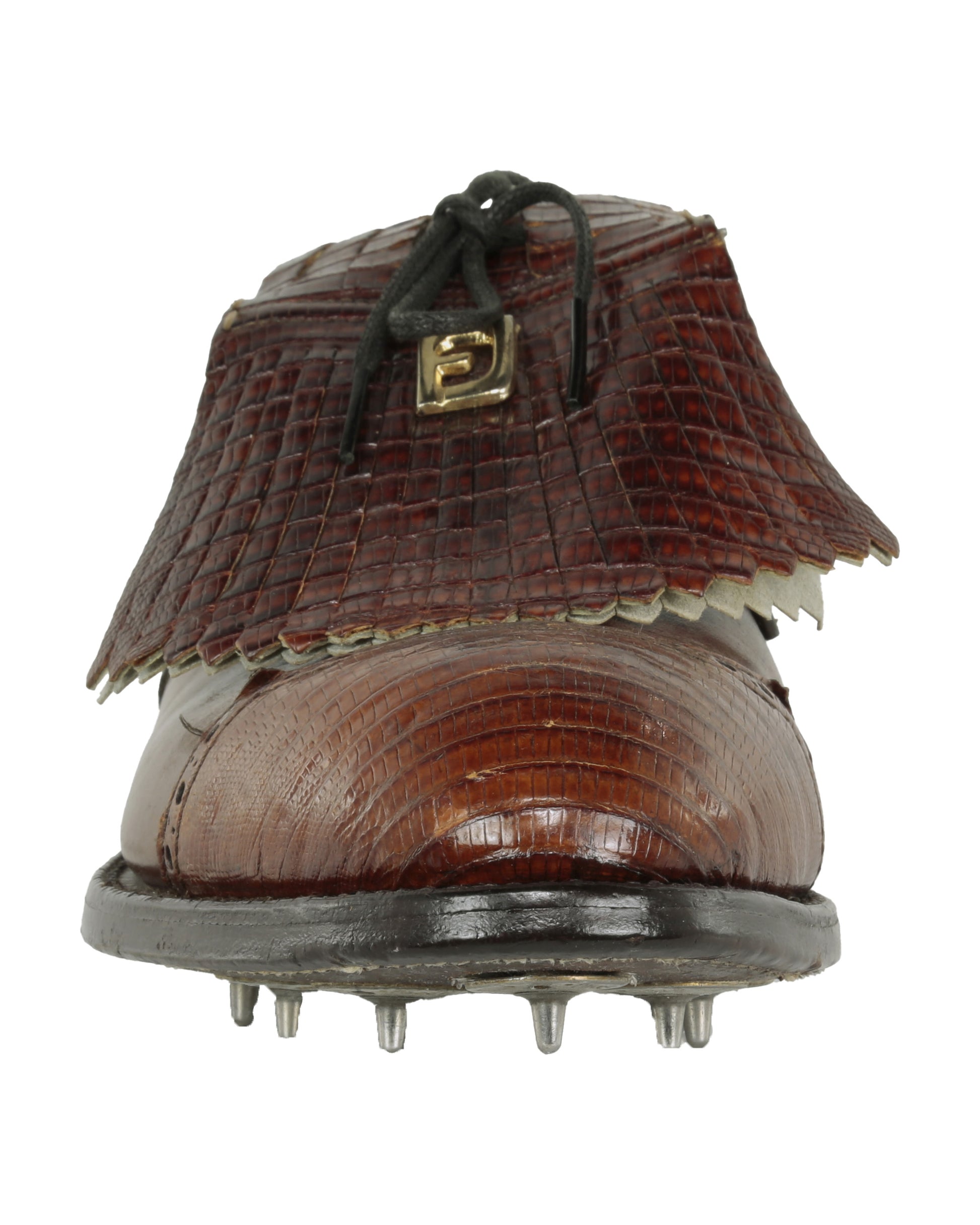 Shoes: Pair of brown alligator skin golf shoes with lace cover and gold-toned “FJ” decoration on cover. FootJoy brand.