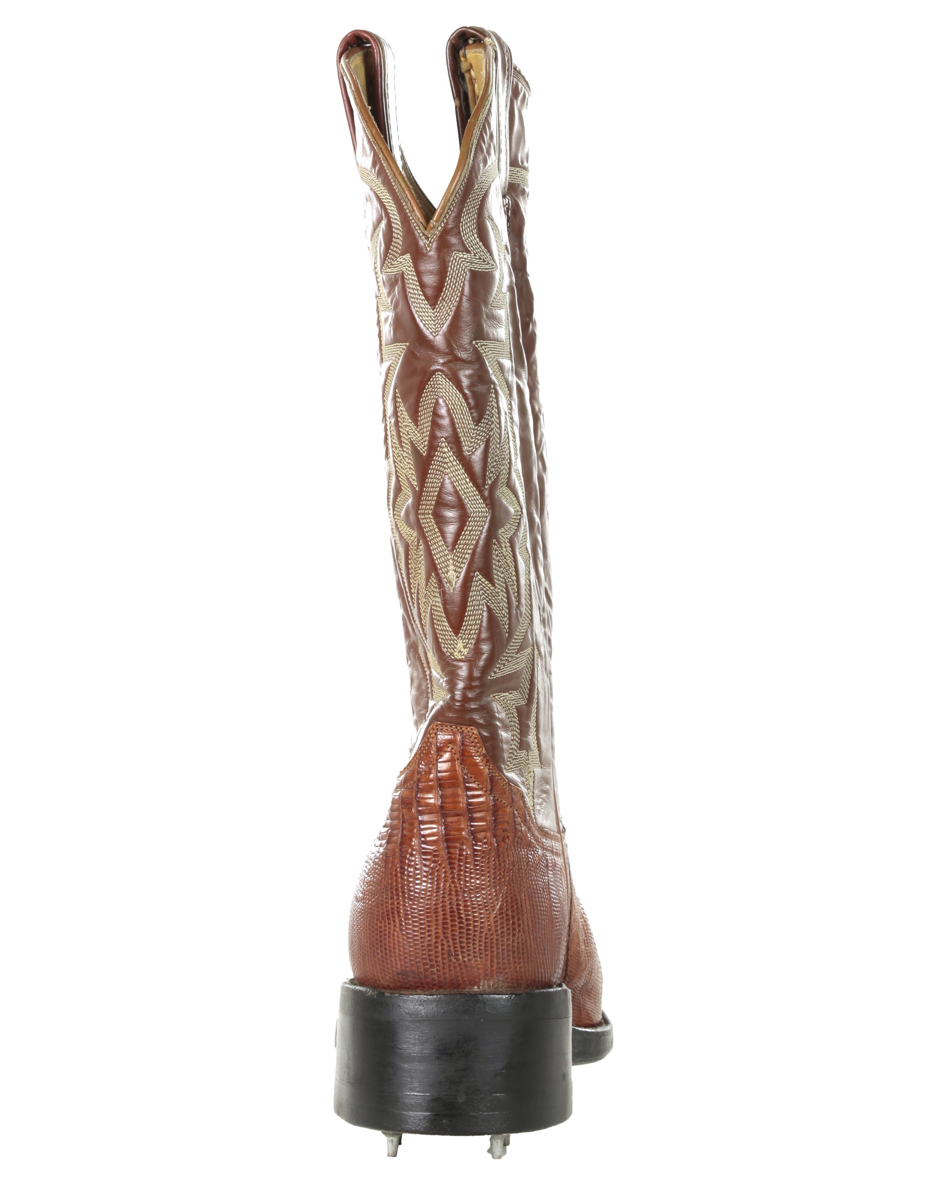 Boots: Pair of brown leather cowboy boots with decorative tan stitching throughout. Sole of shoe has golf cleats throughout.