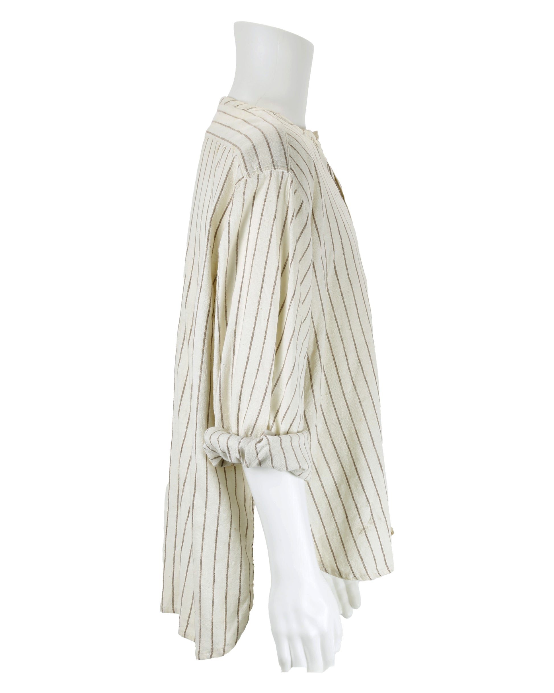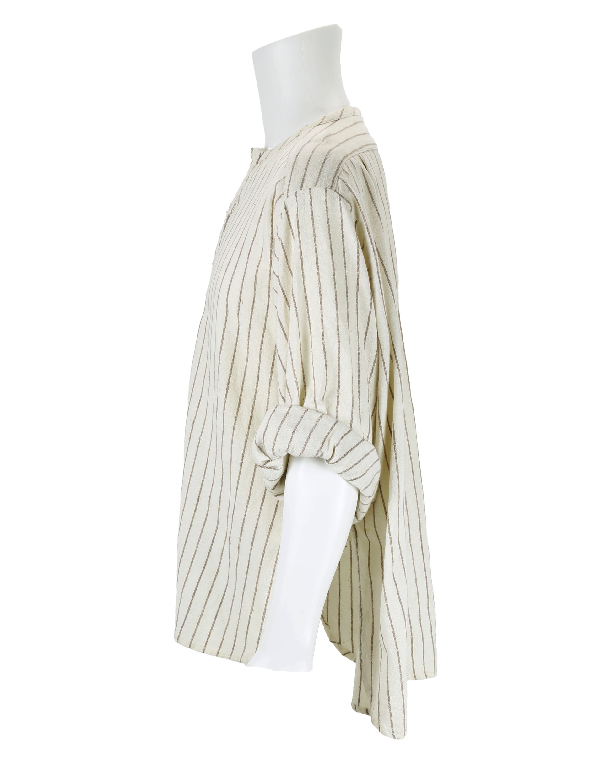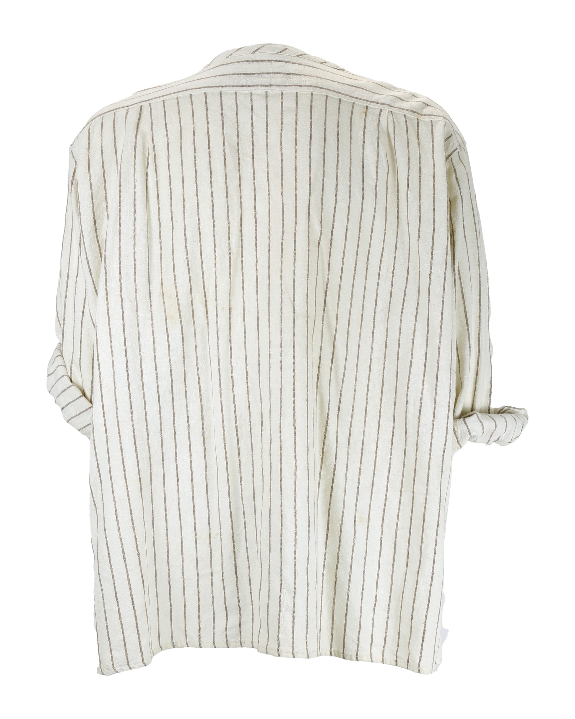 This Tarzan shirt from Tarzan and the Lost City is a distinctive production-made wardrobe piece associated with the character of Tarzan, portrayed by Casper Van Dien. The shirt is cream in color with subtle tan pinstripes and features long sleeves with a clean, collarless design that fastens with a button-down closure at the center of the obverse. The minimalist neckline and absence of lapels contribute to the period-inspired aesthetic seen in the film. Cufflink-style cuffs add a refined tailoring detail, while long slits at the bottom on each side allow for ease of movement and a dramatic silhouette when worn. An interior tag at the collar reads “TARZAN / NAME,” indicating its use as a character-designated costume piece.