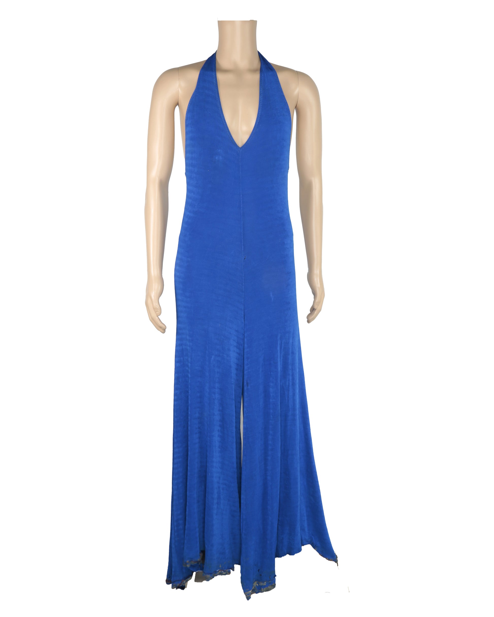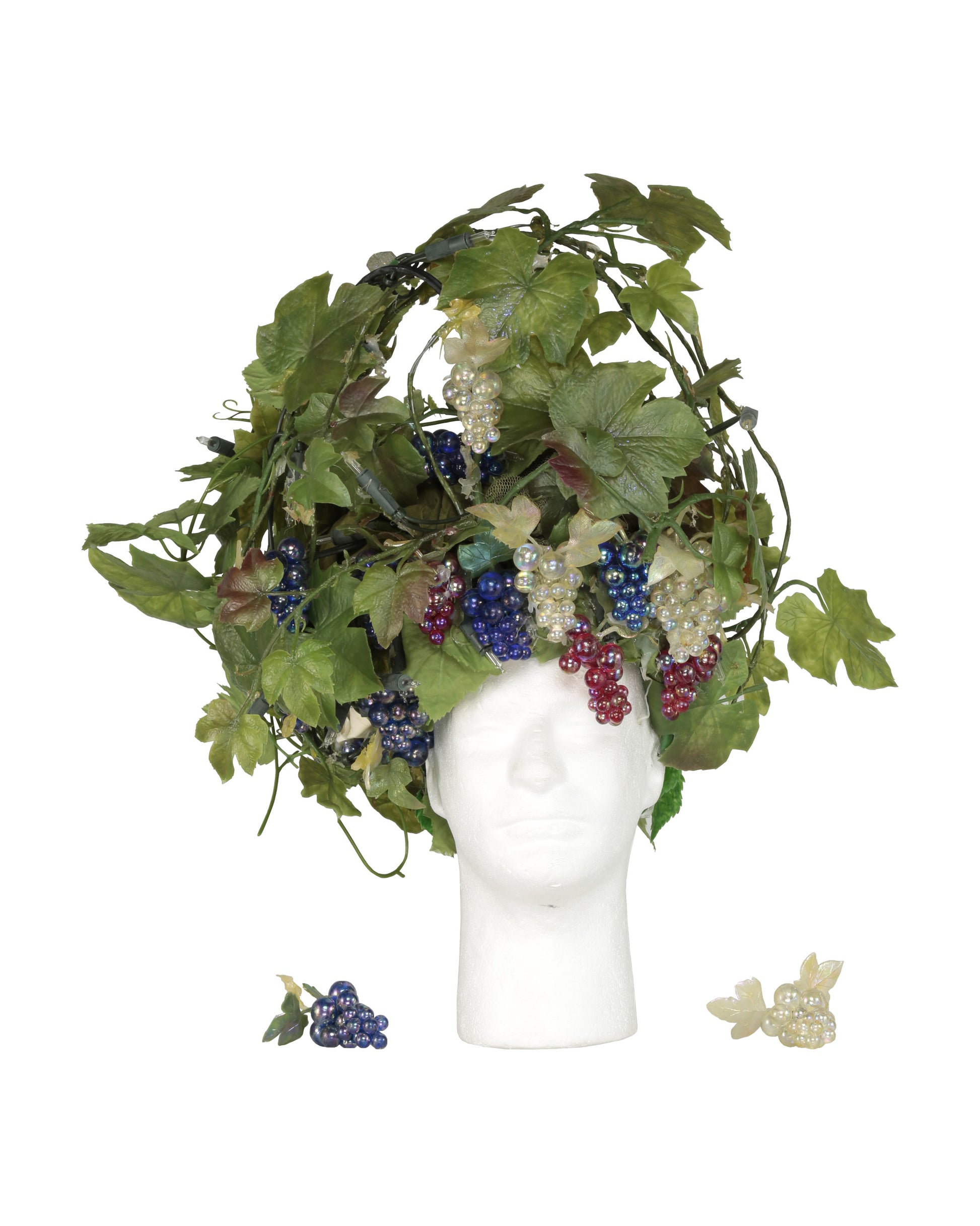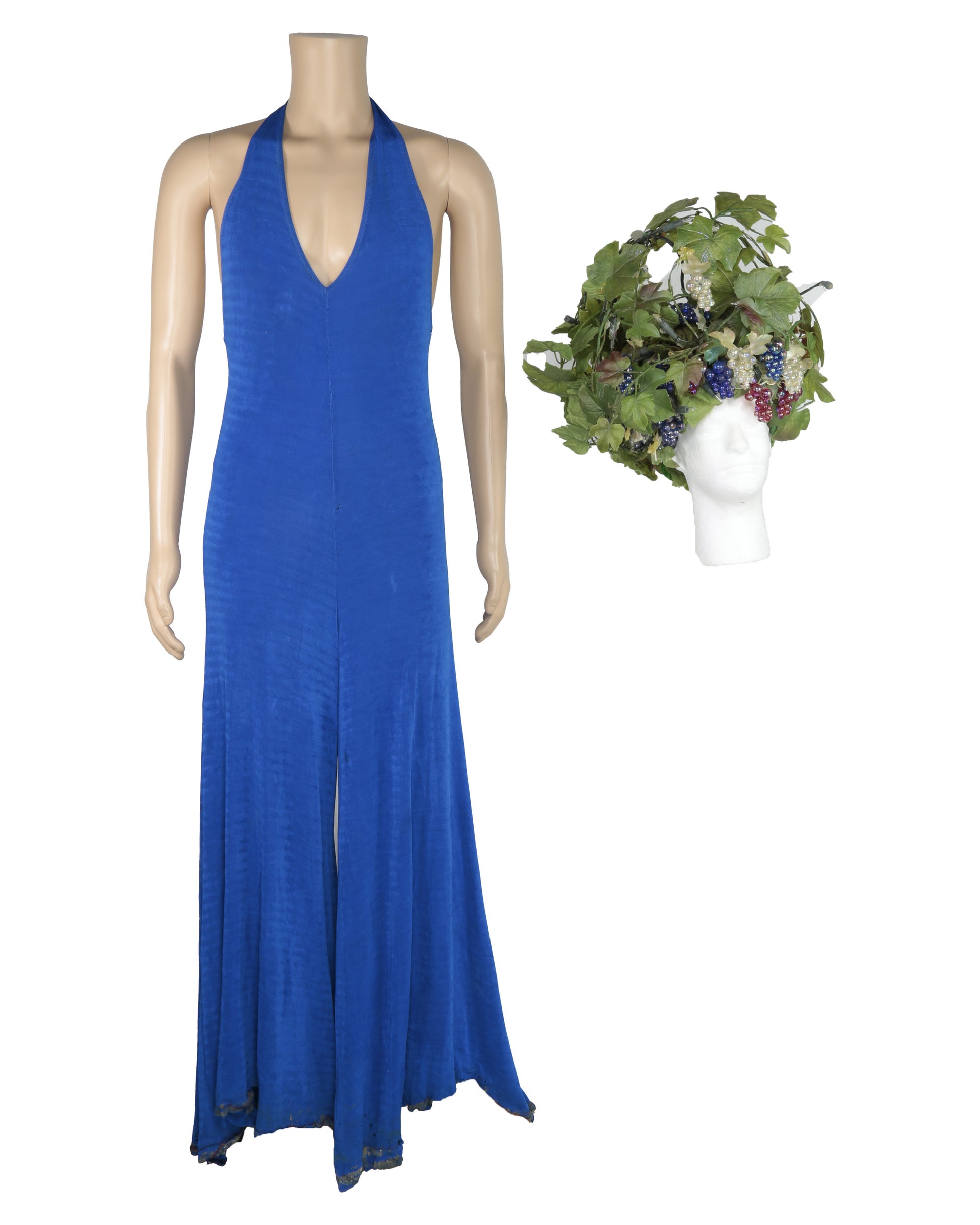 This striking production-made costume from The Adventures of Priscilla, Queen of the Desert is associated with the character Bernadette Bassenger, portrayed by Terence Stamp, and reflects the film’s bold, theatrical aesthetic. The ensemble features a vivid blue spandex jumpsuit designed with a halter-style top that ties at the back of the neck and dramatic wide pant legs that create a flowing silhouette. Completing the look is an elaborate statement hat constructed of faux grape clusters and grape leaves, with white Christmas lights strung throughout the top of the headpiece for added visual impact.