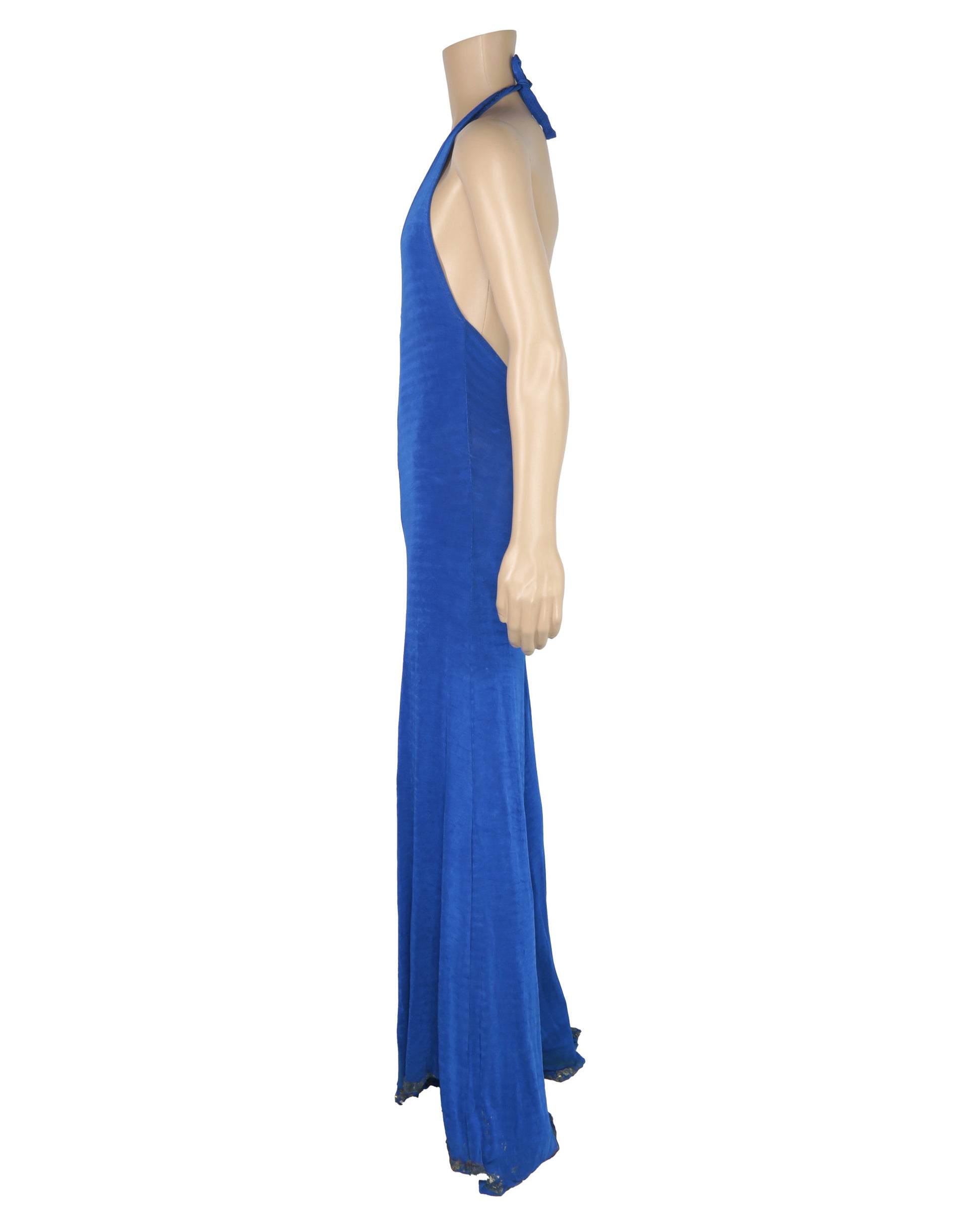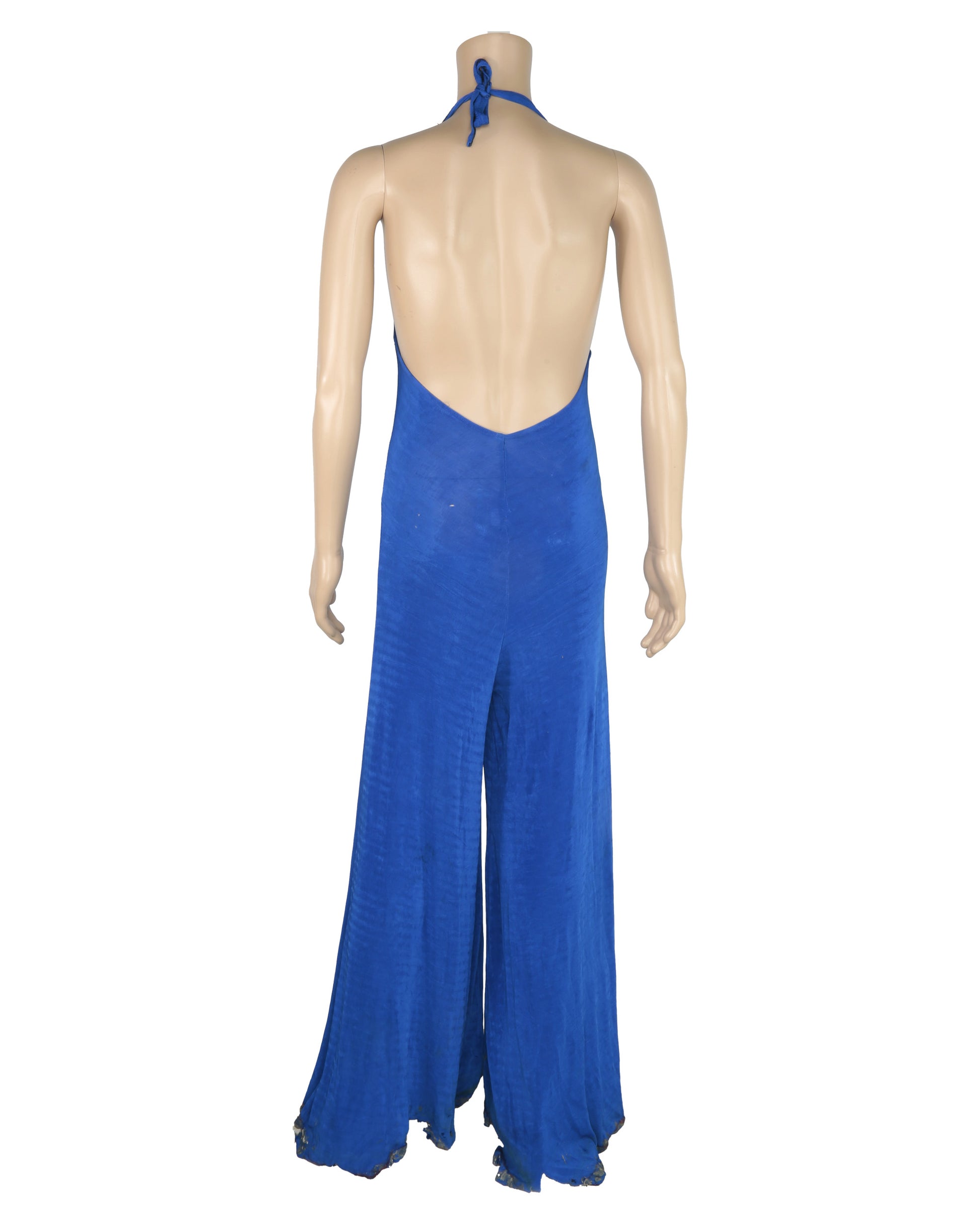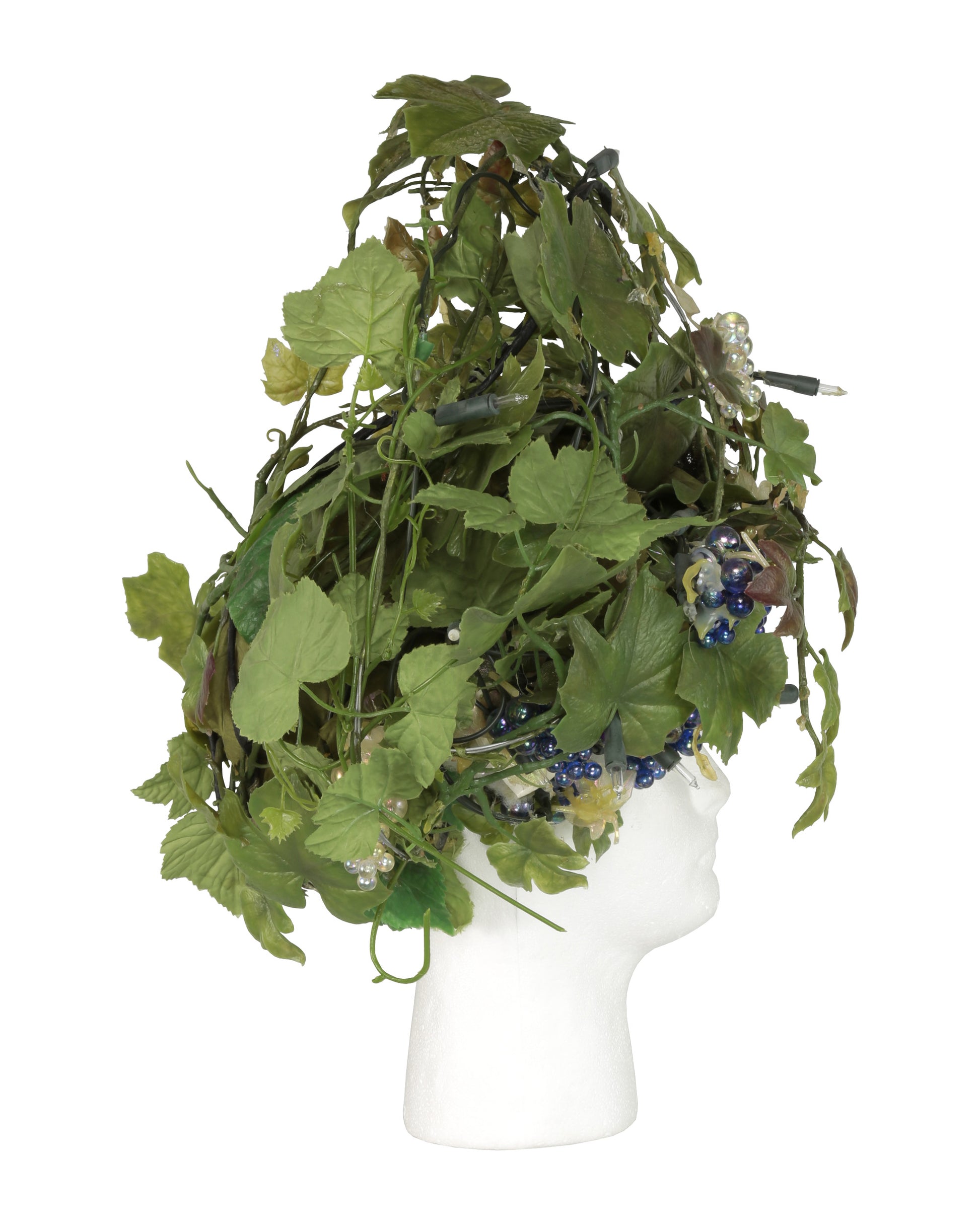 This striking production-made costume from The Adventures of Priscilla, Queen of the Desert is associated with the character Bernadette Bassenger, portrayed by Terence Stamp, and reflects the film’s bold, theatrical aesthetic. The ensemble features a vivid blue spandex jumpsuit designed with a halter-style top that ties at the back of the neck and dramatic wide pant legs that create a flowing silhouette. Completing the look is an elaborate statement hat constructed of faux grape clusters and grape leaves, with white Christmas lights strung throughout the top of the headpiece for added visual impact.