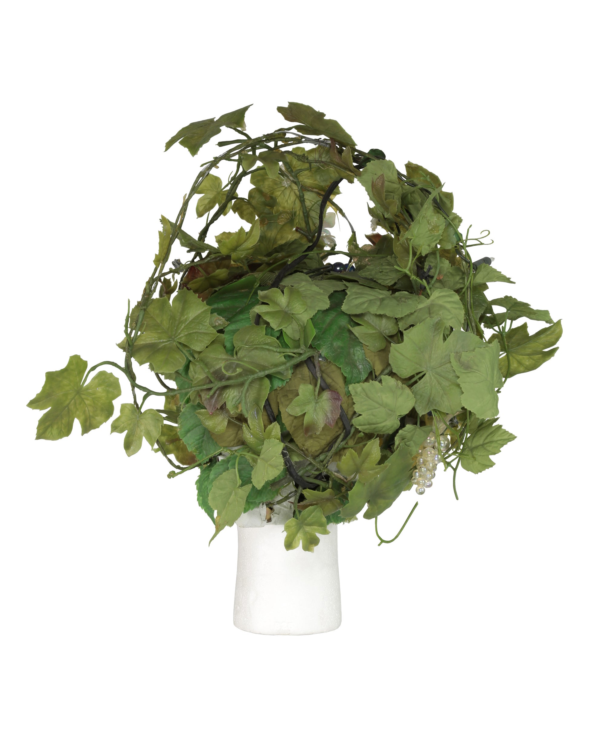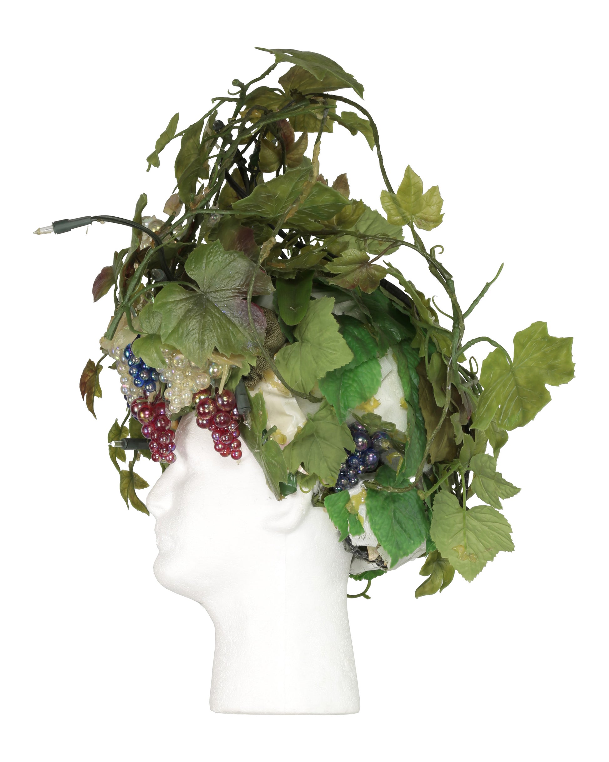 The jumpsuit exhibits adhesive residue throughout the bottom of the pant legs from a platform that was previously attached and removed prior to acquisition by Planet Hollywood. The hat has a few sectios of grapes that have fallen off, along with small areas of loss present throughout.