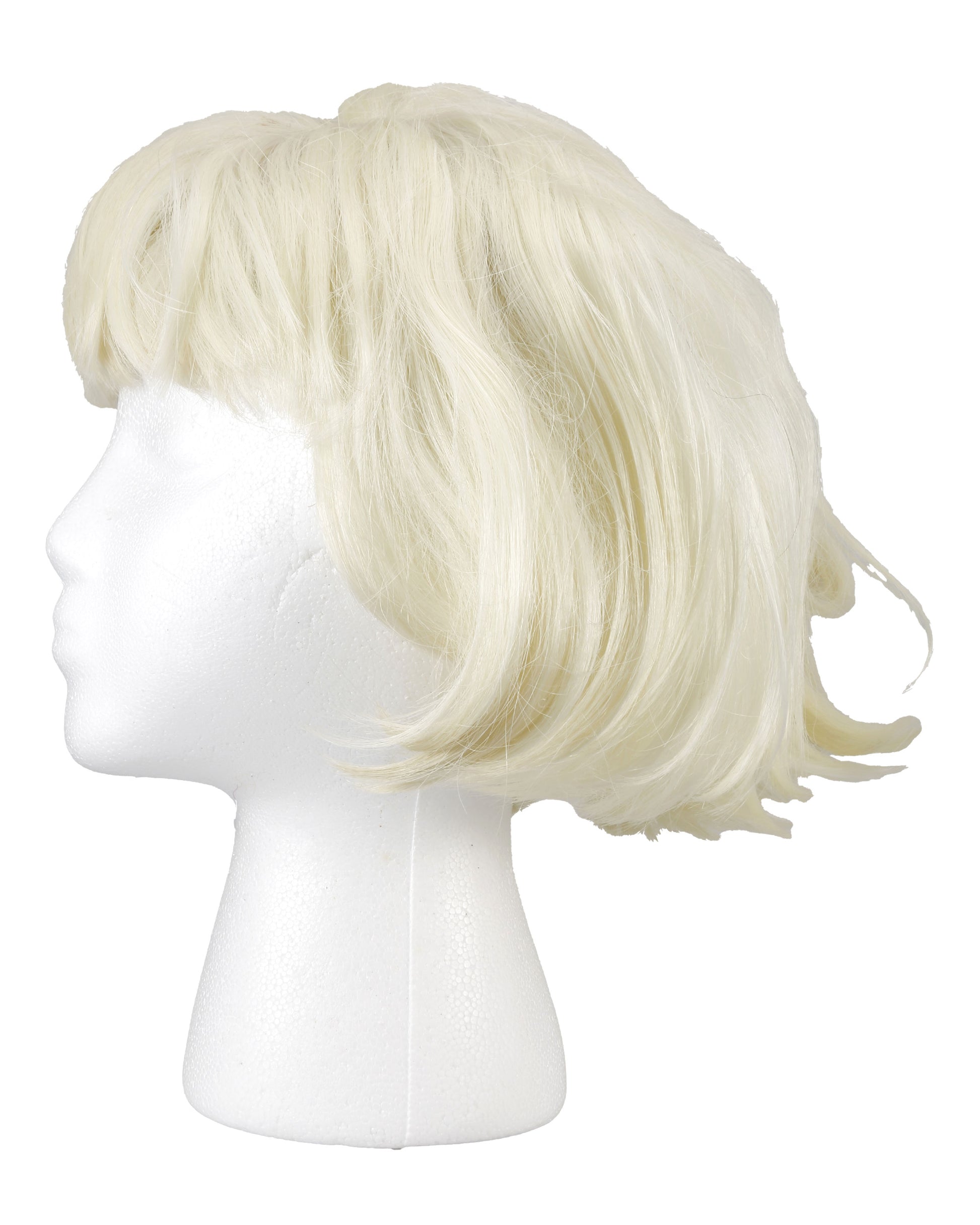Condition shows light wear consistent with prior use. The wig is slightly unkempt with flyaways and some misshapen hair, and there is a stain on the top where the bangs part forward.