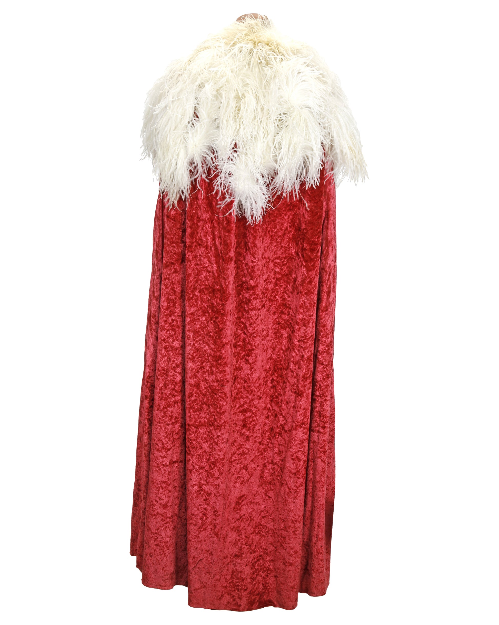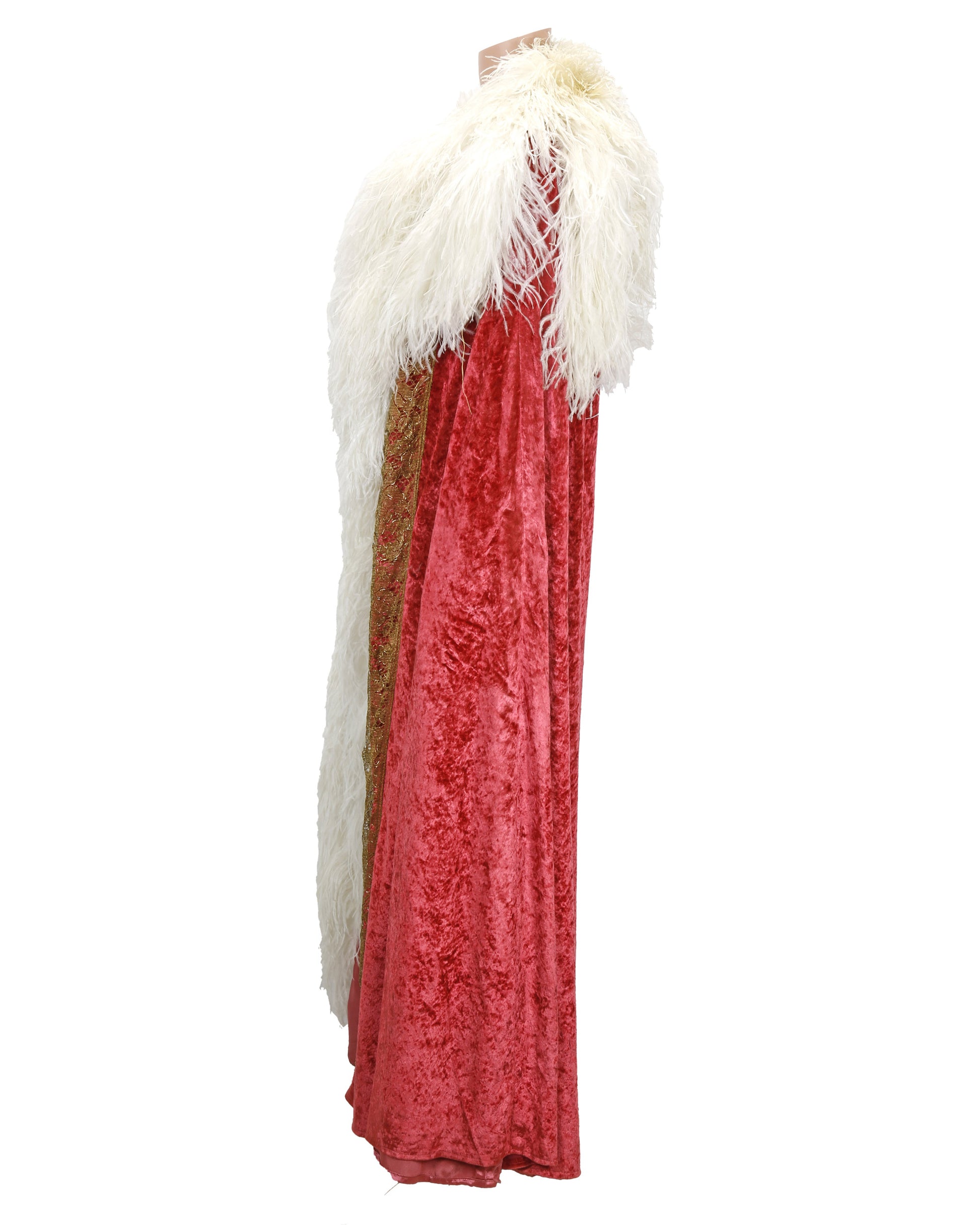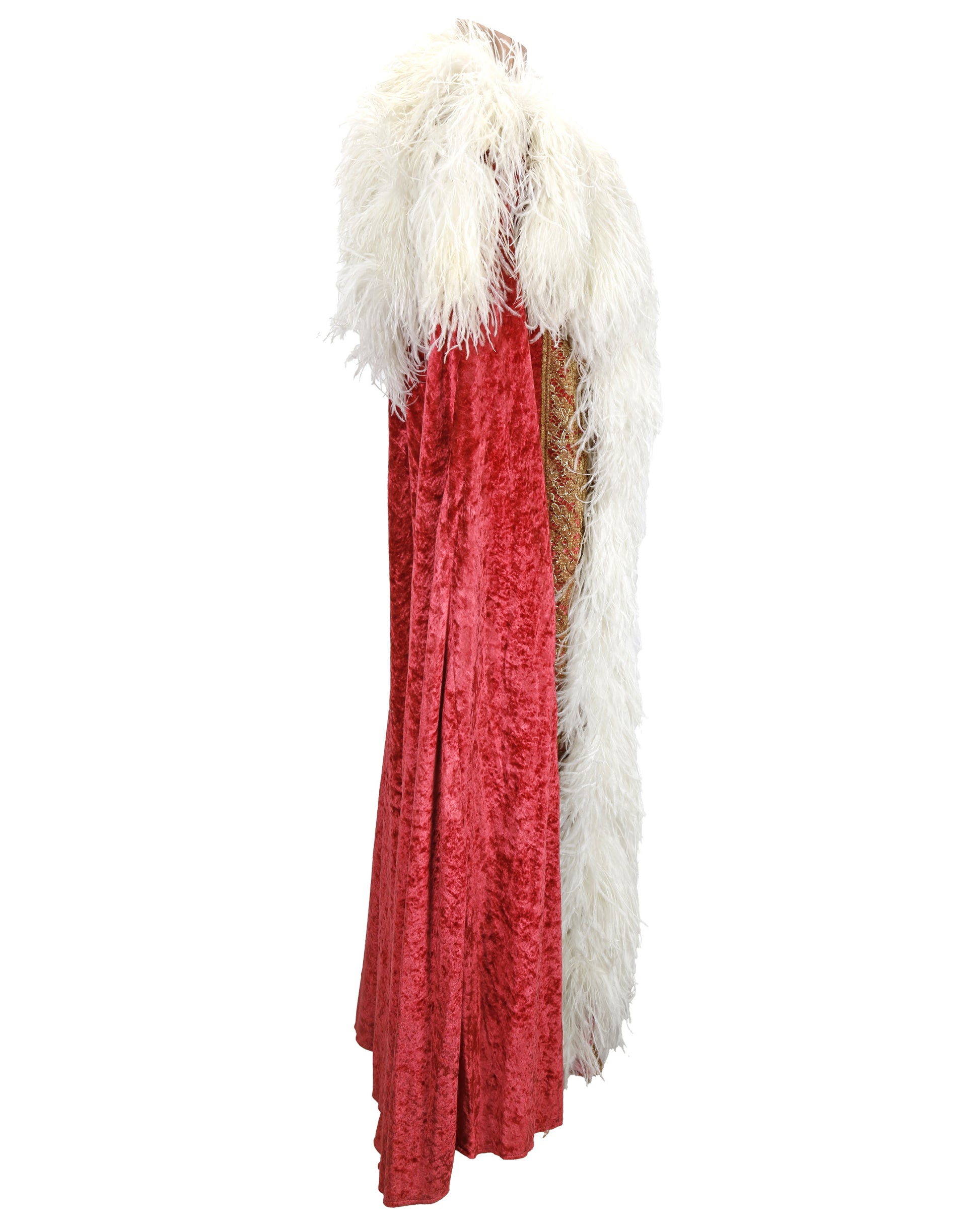 Offered here is a striking red velour robe worn by Twiggy in the 1986 adaptation of The Little Match Girl. This luxurious garment exemplifies the glamour and attention to detail of period costume design, featuring white feather trim around the collar and down the lapel paired with decorative gold-toned lace detailing that runs alongside the feathers for a refined and theatrical finish.