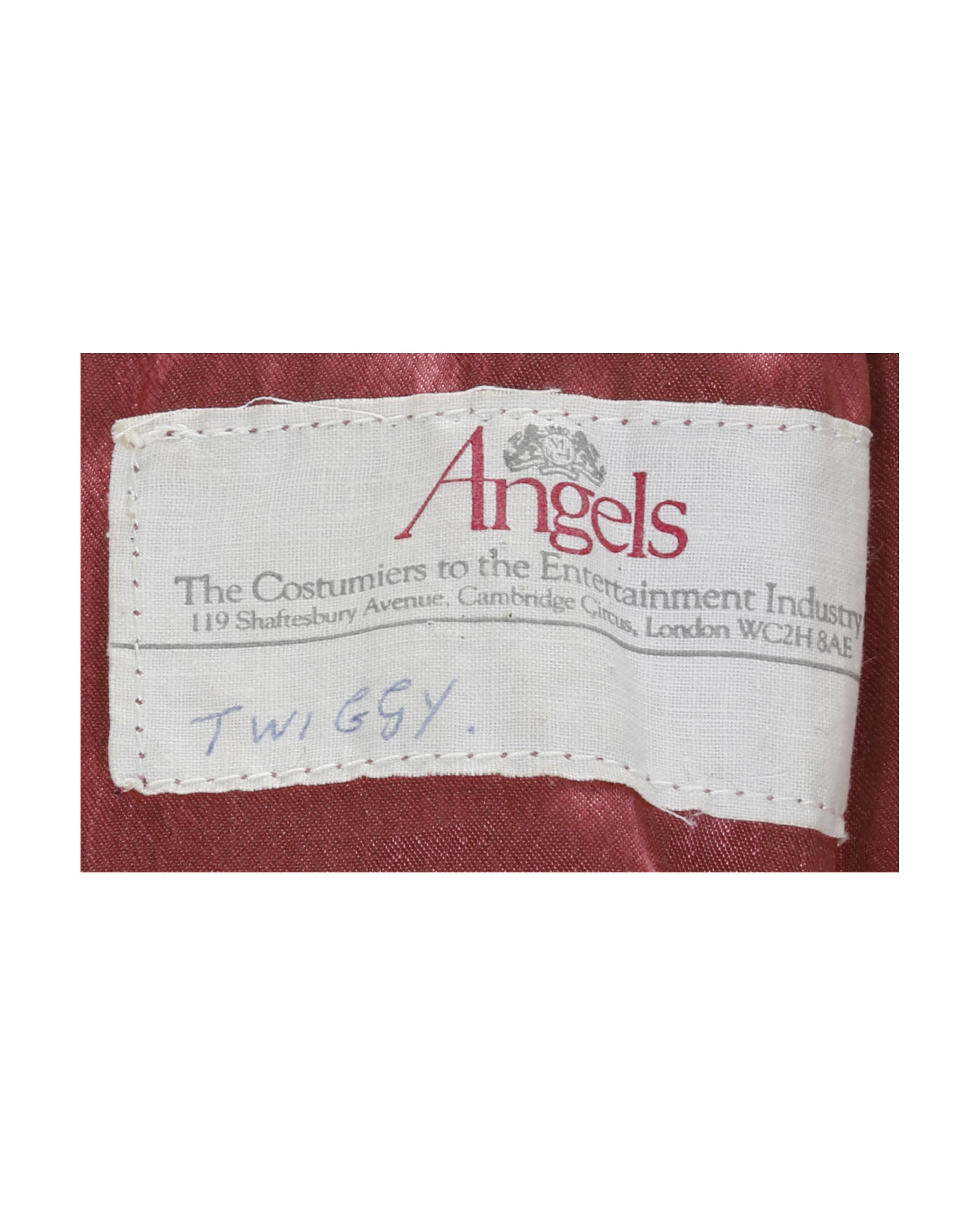 The interior is fully lined with a silk-like fabric, ensuring comfort and quality, and bears the “Angels” label sewn at the top center with handwritten notation reading “TWIGGY”, confirming its association with the iconic model and actress. This robe represents a rare opportunity to acquire a screen-used costume from a notable television adaptation, combining both visual impact and authentic provenance.
