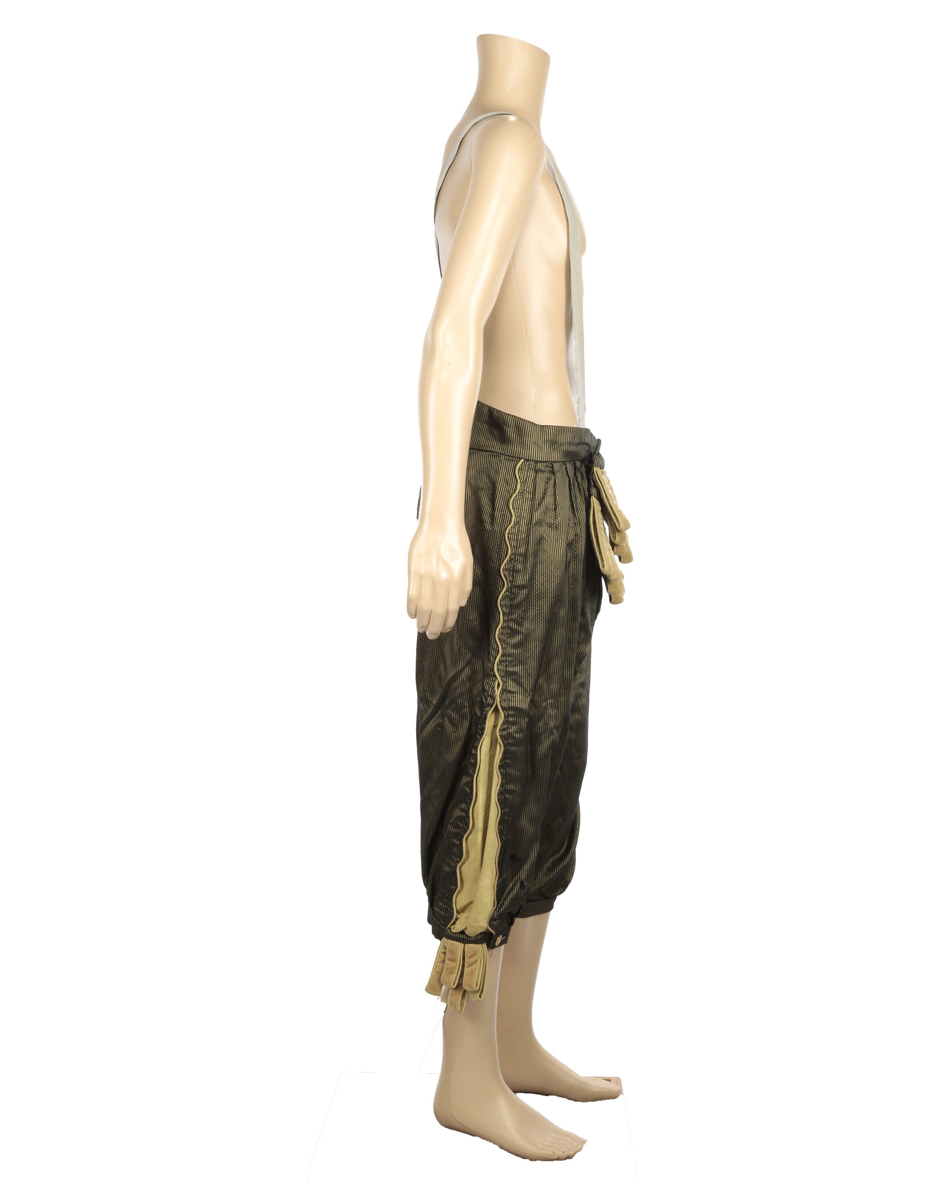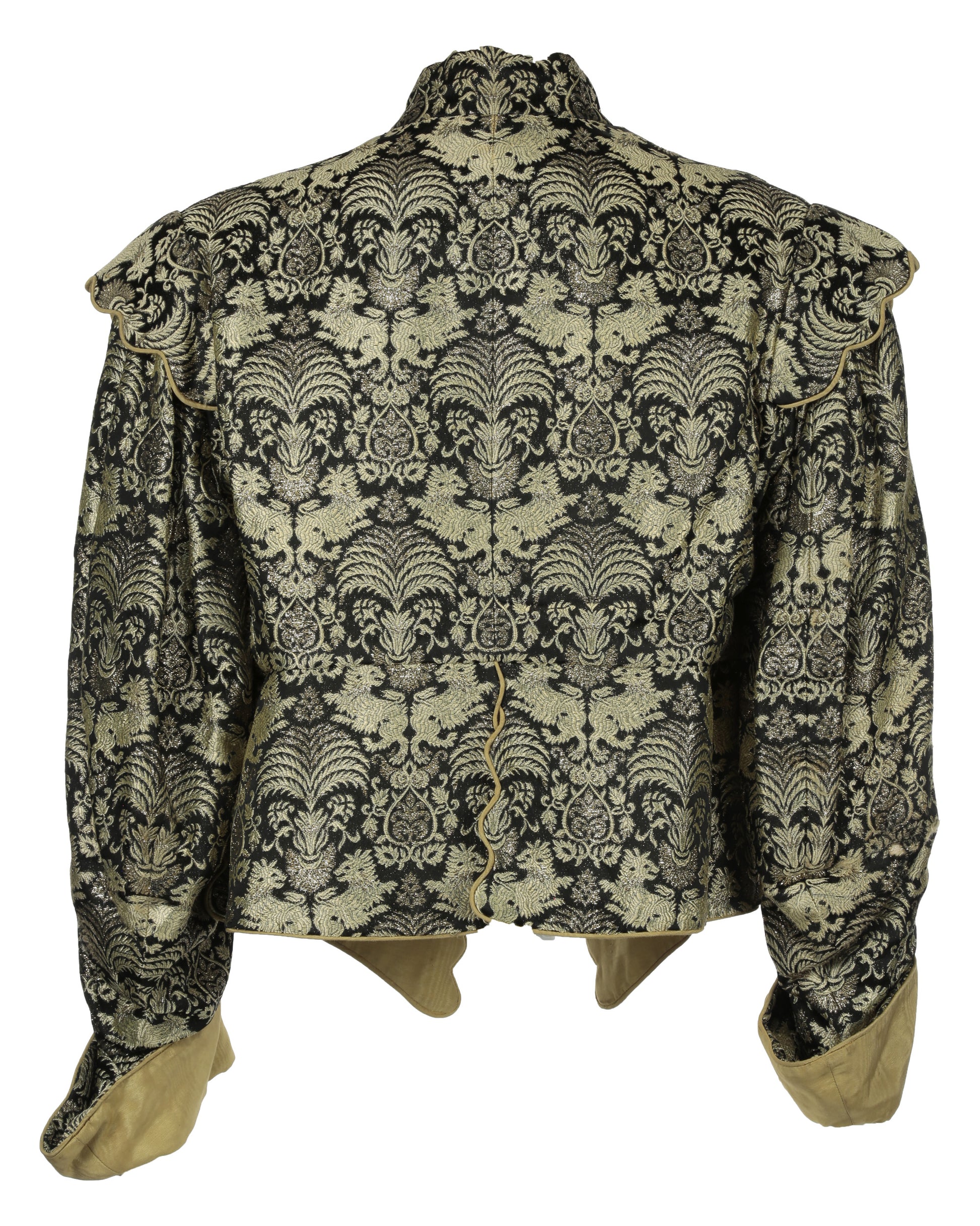 The costume includes a black jacket adorned with intricate gold and gold lamé embroidery in scrolling designs, leaves, and lion motifs. The wavy center seam is trimmed with gold silk and features a gold lamé-covered button closure. The long sleeves have decorative wavy slits along the outer sides and overturned gold cuffs, while the interior is lined with luxurious gold silk-satin fabric. Accompanying the jacket is a pair of black velvet and gold pinstripe breeches, featuring gold corded trim running along the outer sides of each leg. The trim splits into a wavy pattern toward the lower half, revealing the shimmering gold lining beneath. The breeches are detailed with tan velvet tassels covering the button front closure and additional tassels at the cuffs, each secured by gold buttons. The reverse center waistband features a black lace-up tie closure, and the interior includes gray elastic suspender straps sewn in for practical on-set use.