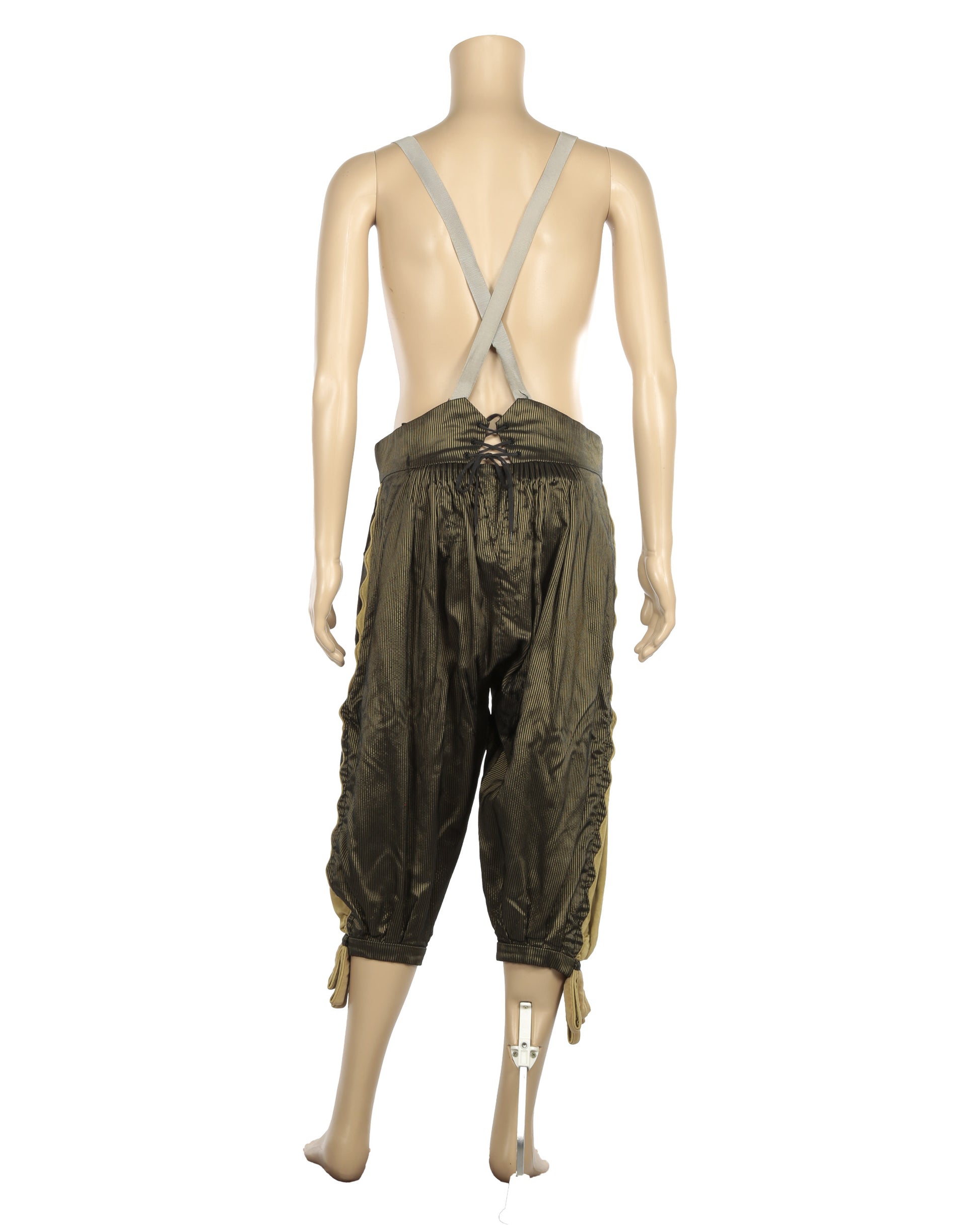 Jacket shows small pinholes on the interior reverse from previous display and light wear consistent with production use. Pants exhibit minor fabric tears above the proper right leg cuff and on the reverse, along with some loss of elasticity in the suspender straps, also consistent with use and age.